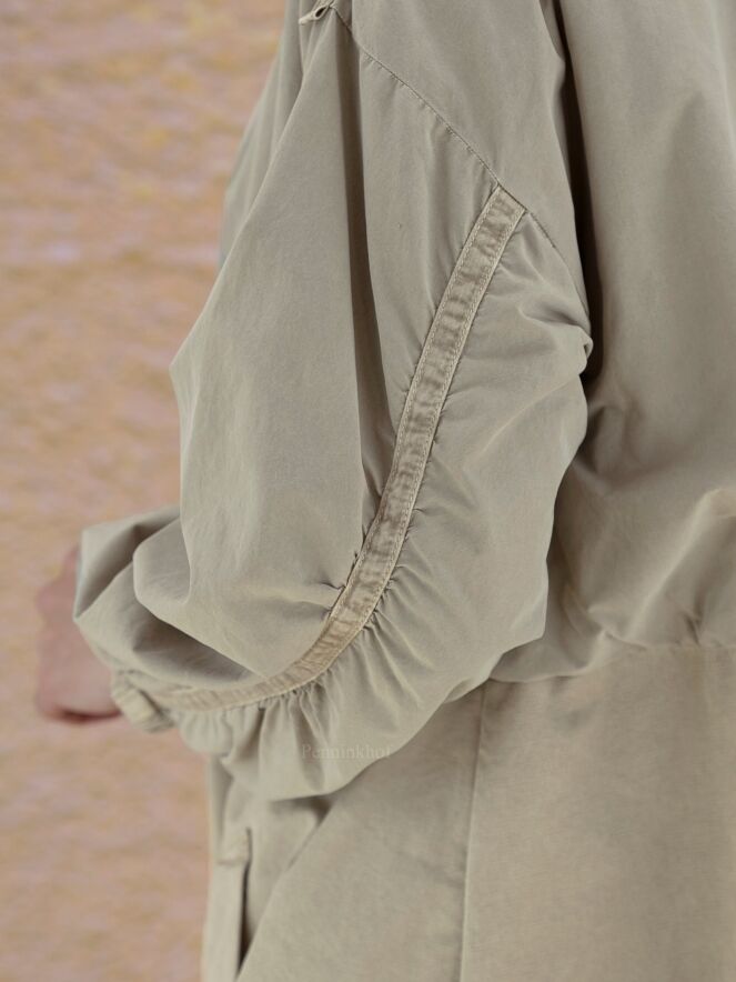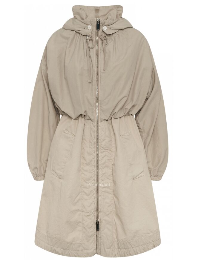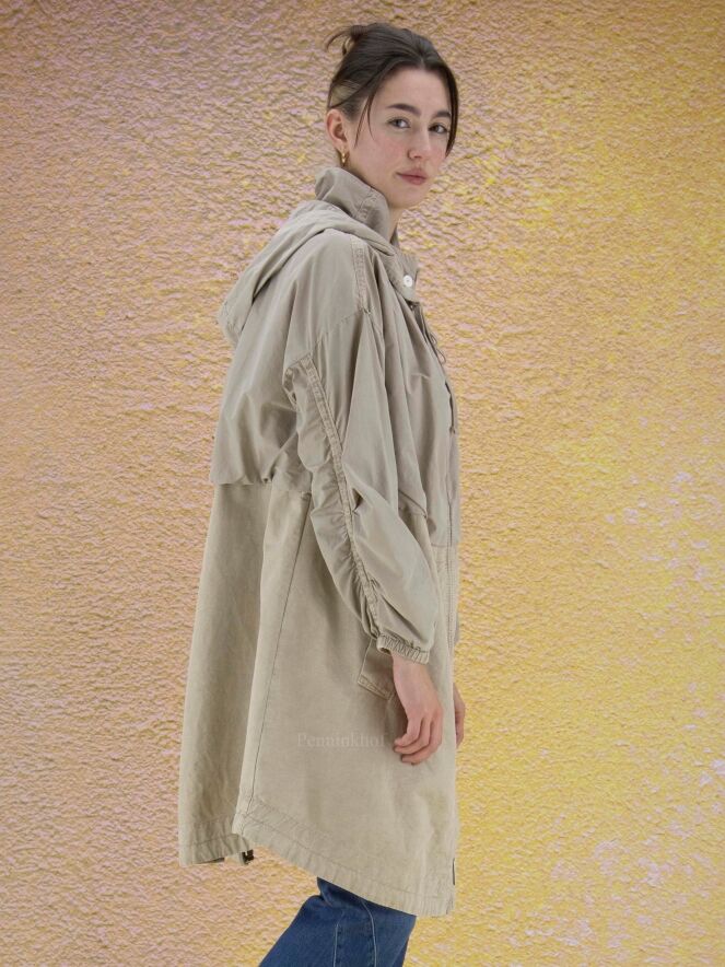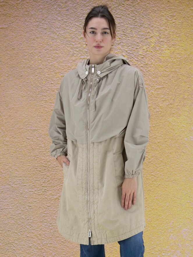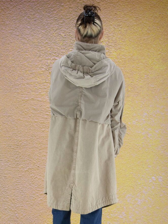 Ein halblanger Mantel der Designermarke High in zwei Sandtönen. Oberhalb der Taille ist der Stoff in einem pastellfarbenen Sandton gehalten. Unterhalb der Taille ist der Mantel voll sandfarben. Die Kapuze ist abnehmbar. Auf der Oberseite der Ärmel verläuft ein Streifen, an dem das Gewebe leicht gerafft ist. Am Ärmelabschluss befindet sich ein schmaler elastischer Saum. Der Mantel hat einen silberfarbenen Reißverschluss und Eingriffstaschen. Diese Jacke sollte nicht gewaschen werden.