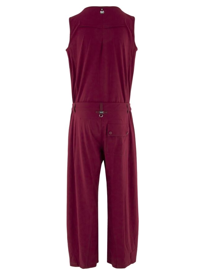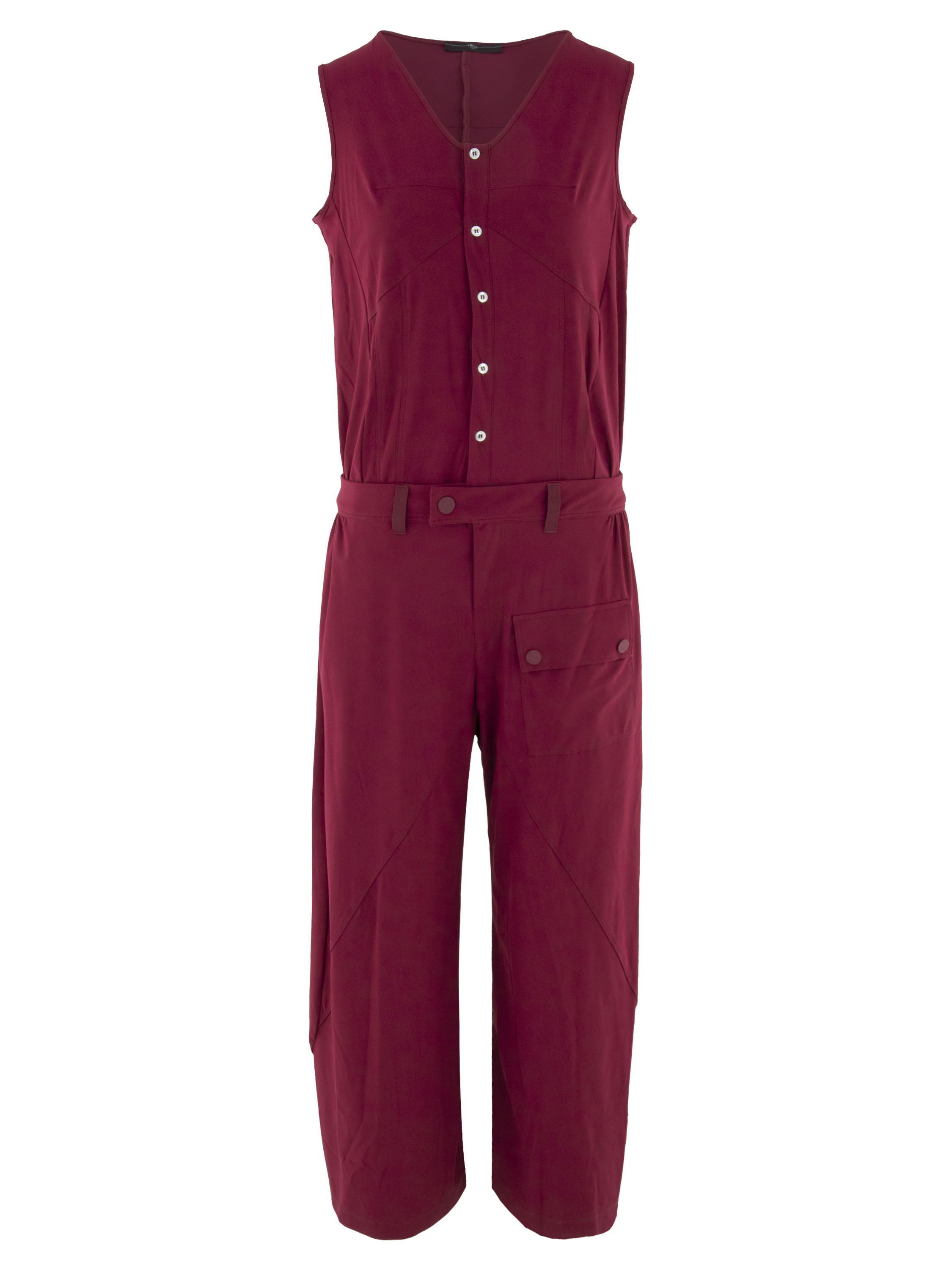 Ein Jumpsuit von High in Himbeerrot. Vom V-Ausschnitt verläuft eine Knopfleiste bis zur Taille. Ab der Taille ist ein kurzer Reißverschluss eingearbeitet. In der Taille befindet sich ein aufgesetzter Bund, bei dem der Stoff seitlich fein plissiert ist. Unterhalb der Taille sind Seitentaschen vorhanden. Die Hosenbeine sind gerade geschnitten. Dieser Jumpsuit kann bei 30 Grad gewaschen werden.