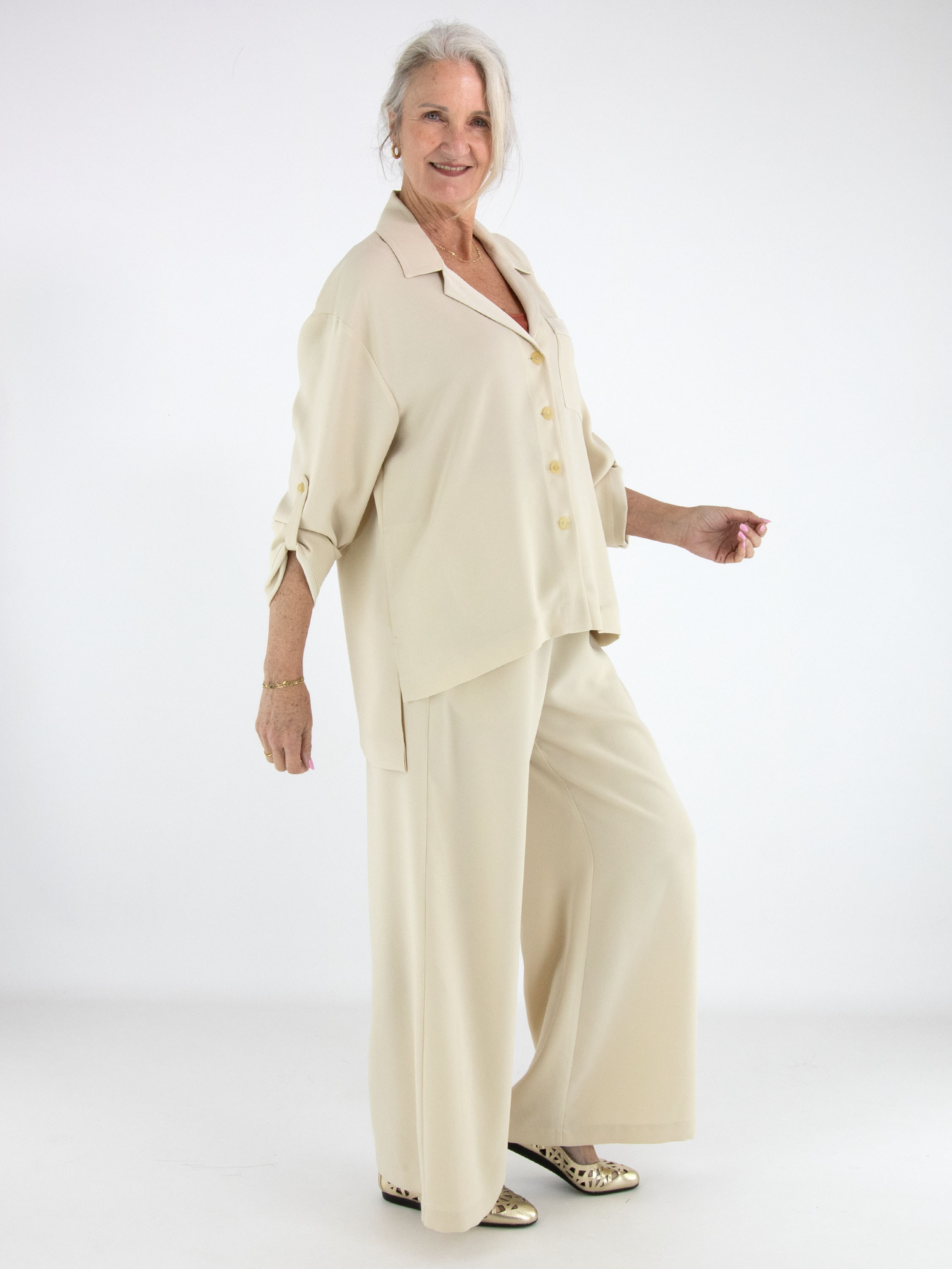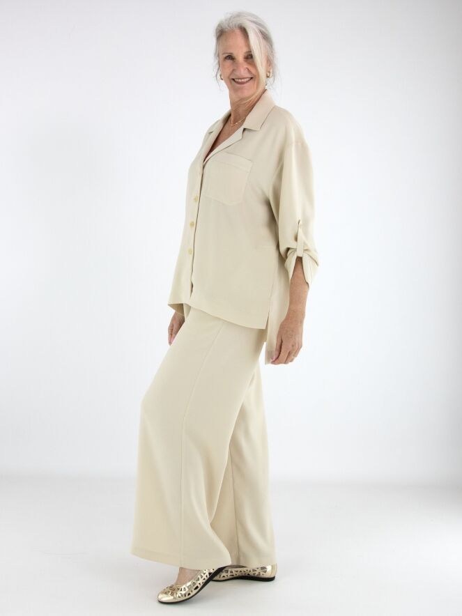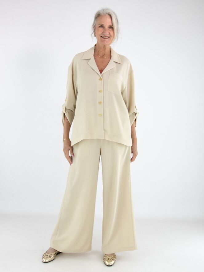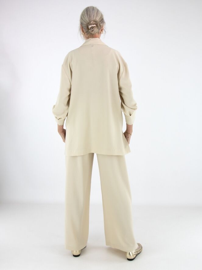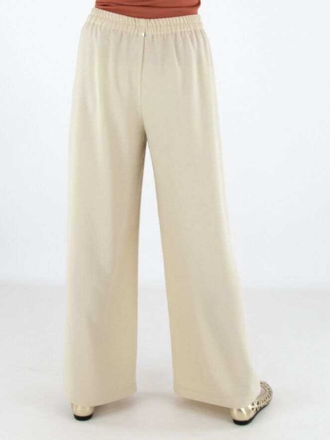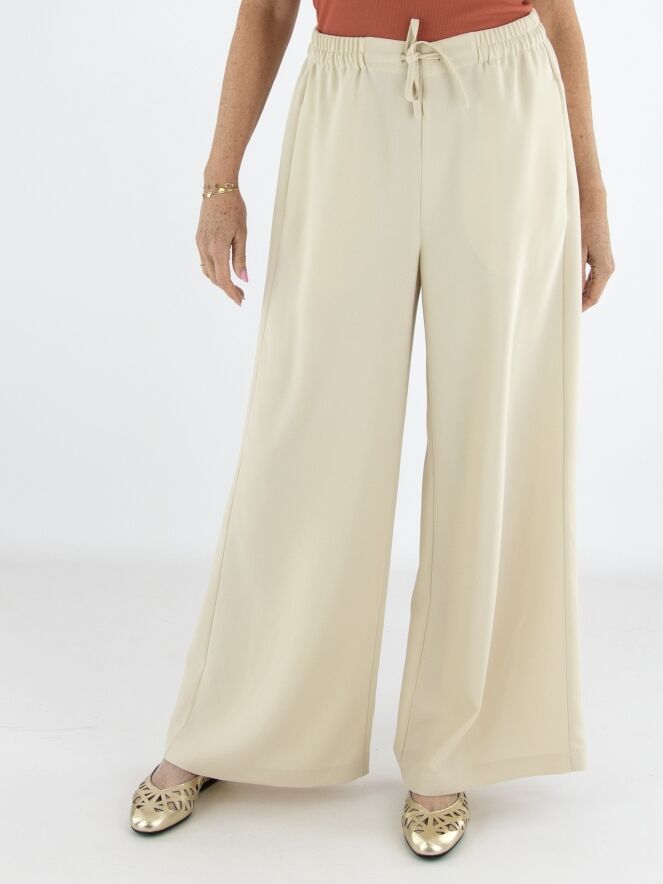Hosenanzug von High in einem eleganten Beigeton. Die Hose verfügt über einen elastischen Bund mit fein gefälteltem Stoff. Zusätzlich ist ein Kordelzug in Tunnelverarbeitung eingearbeitet, mit dem die Taille individuell angepasst werden kann. Die weit geschnittenen Hosenbeine sorgen für eine fließende, moderne Silhouette.