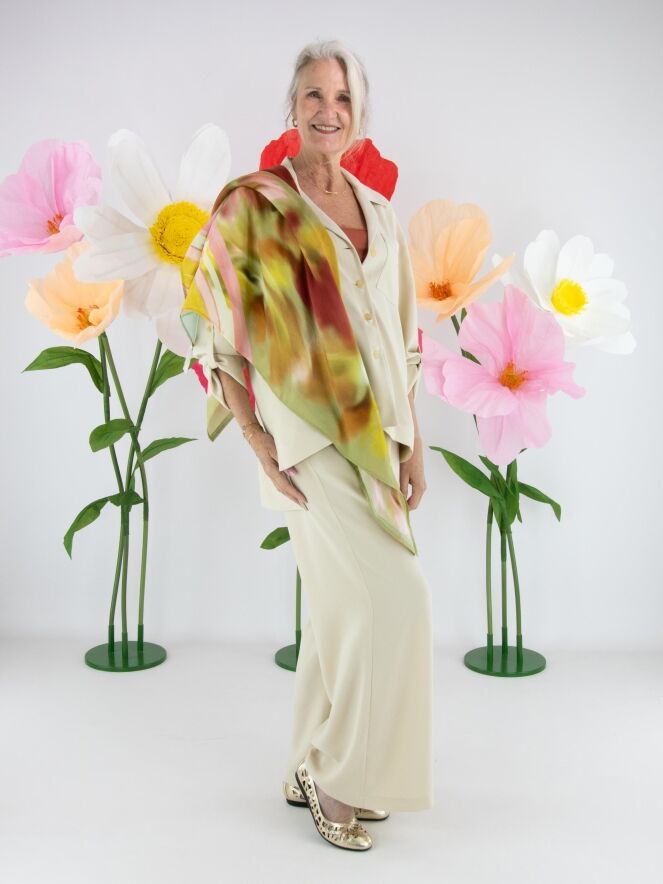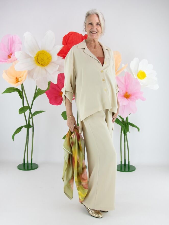 Der Blazer wird mit vier Knöpfen geschlossen und besitzt eine Brusttasche, deren Rand aus mattem Satin gefertigt ist und einen eleganten Kontrast bildet. Die Ärmel können umgeschlagen und mit einem kurzen Riegel und Knopf fixiert werden. Dieses Ensemble sollte per Hand gewaschen werden.