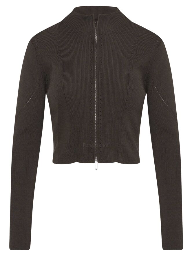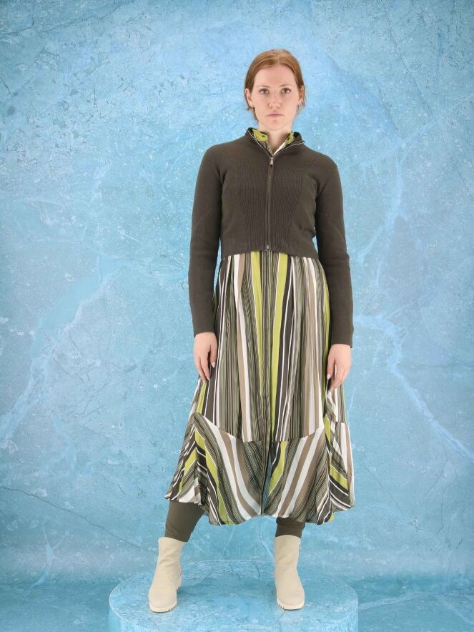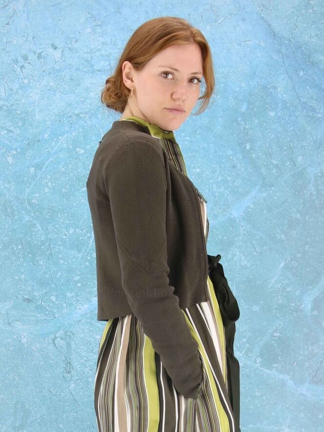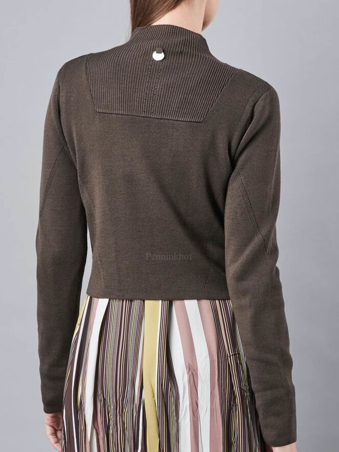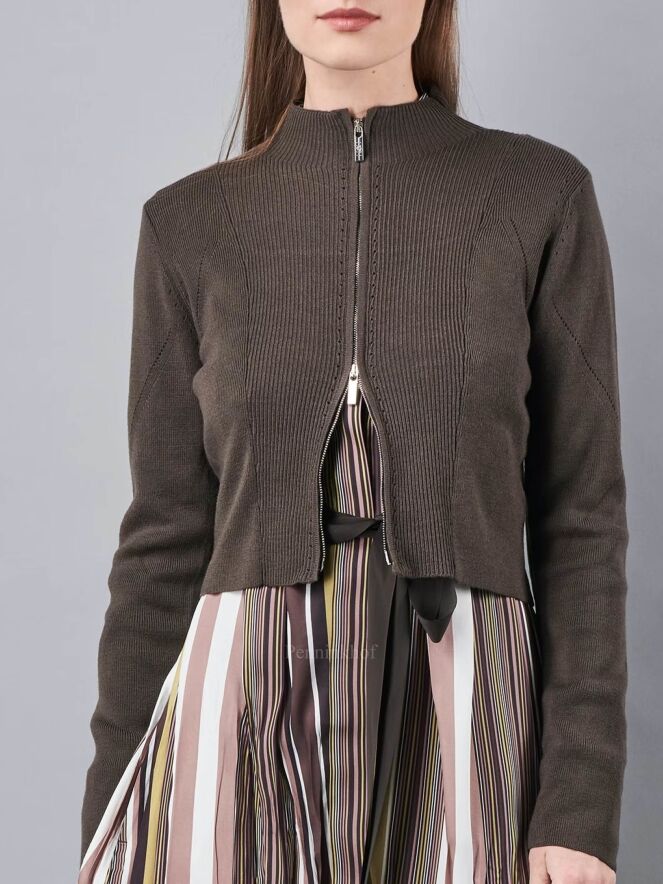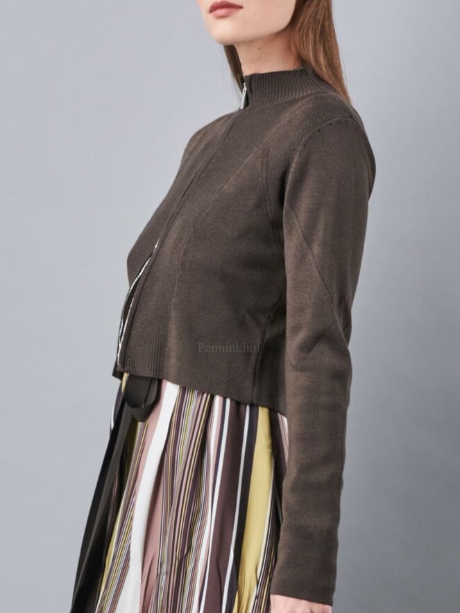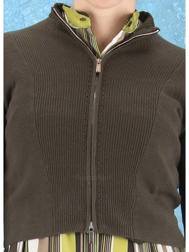 Eine kurze Strickjacke der Designermarke High in Olivgrün. Vorne ist der Stoff in der Mitte zart gerippt. Entlang des Einsatzes der langen Ärmel befinden sich Ajour-Paspeln. Die Weste hat einen Reißverschluss und kann von Hand gewaschen werden.