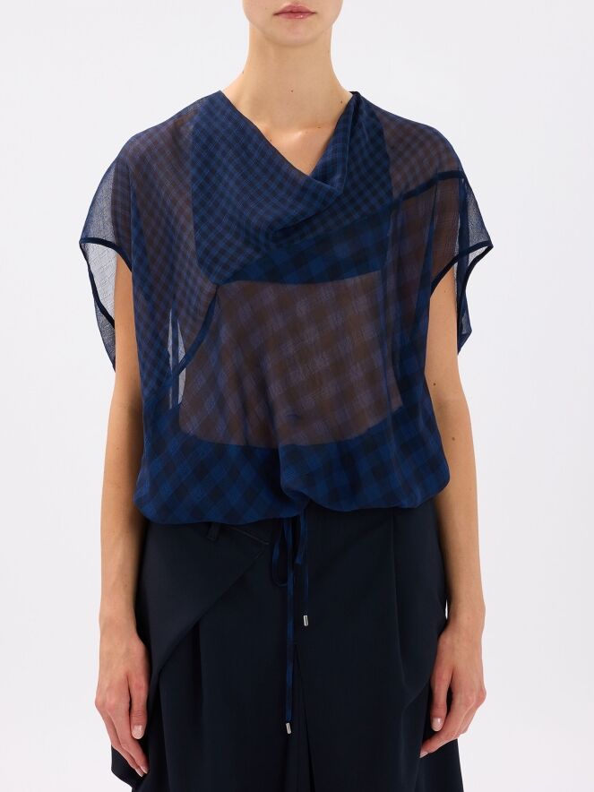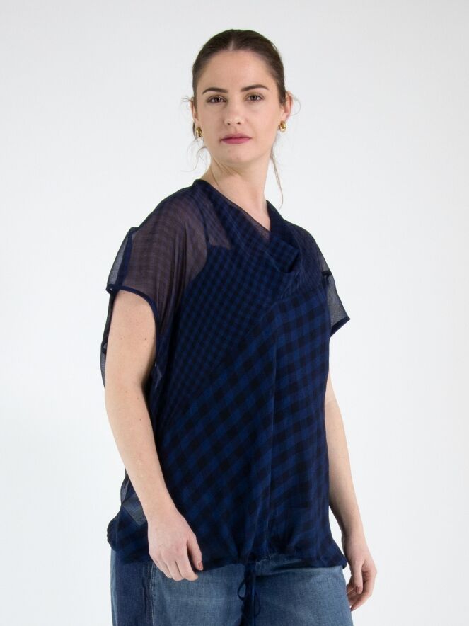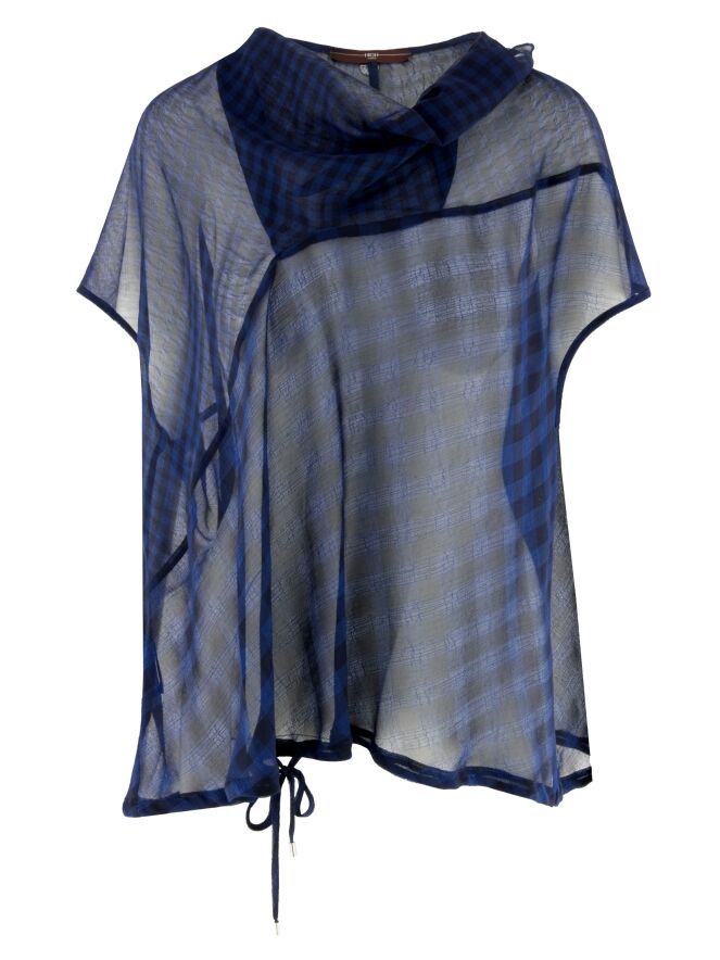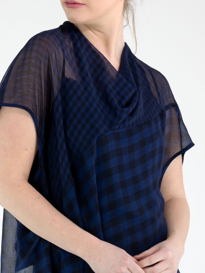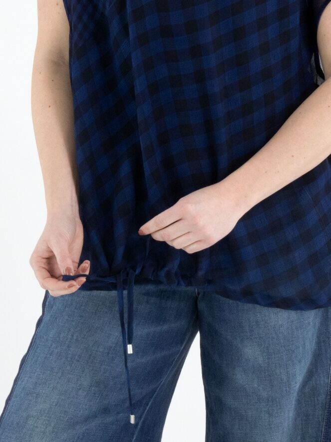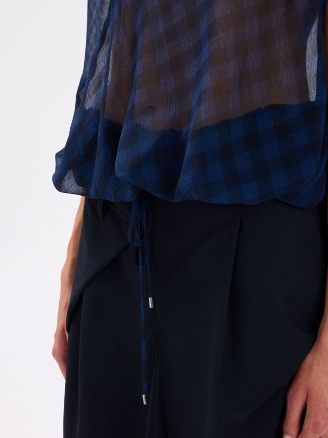 Ein transparentes Shirt von High mit Blockmuster in Nachtblau. Das Shirt hat einen weich fallenden Ausschnitt. Im Saum ist ein Band in Tunnelverarbeitung eingearbeitet, mit dem ein Plisséeffekt erzeugt werden kann. Dieses Shirt kann per Hand gewaschen werden.
