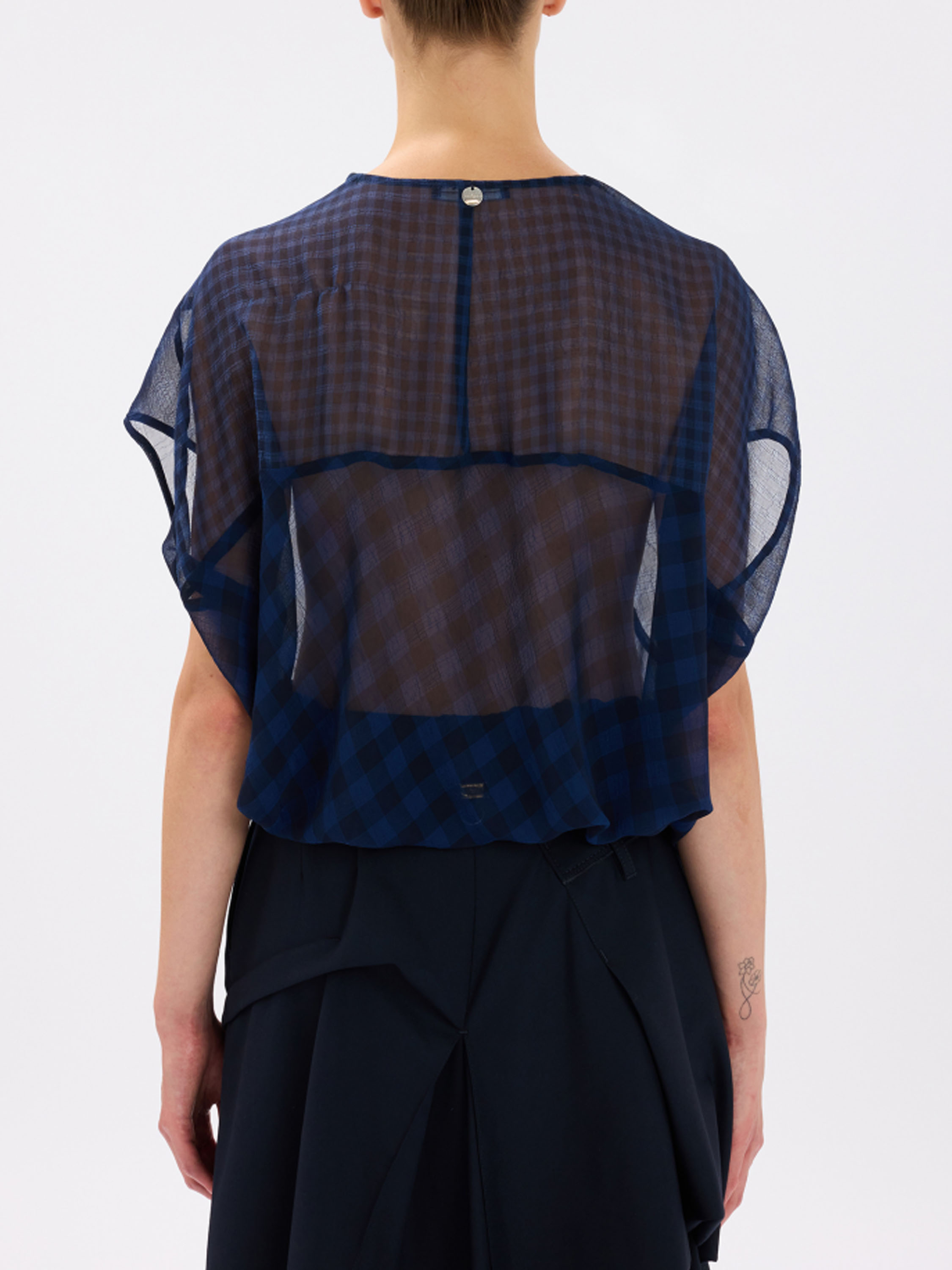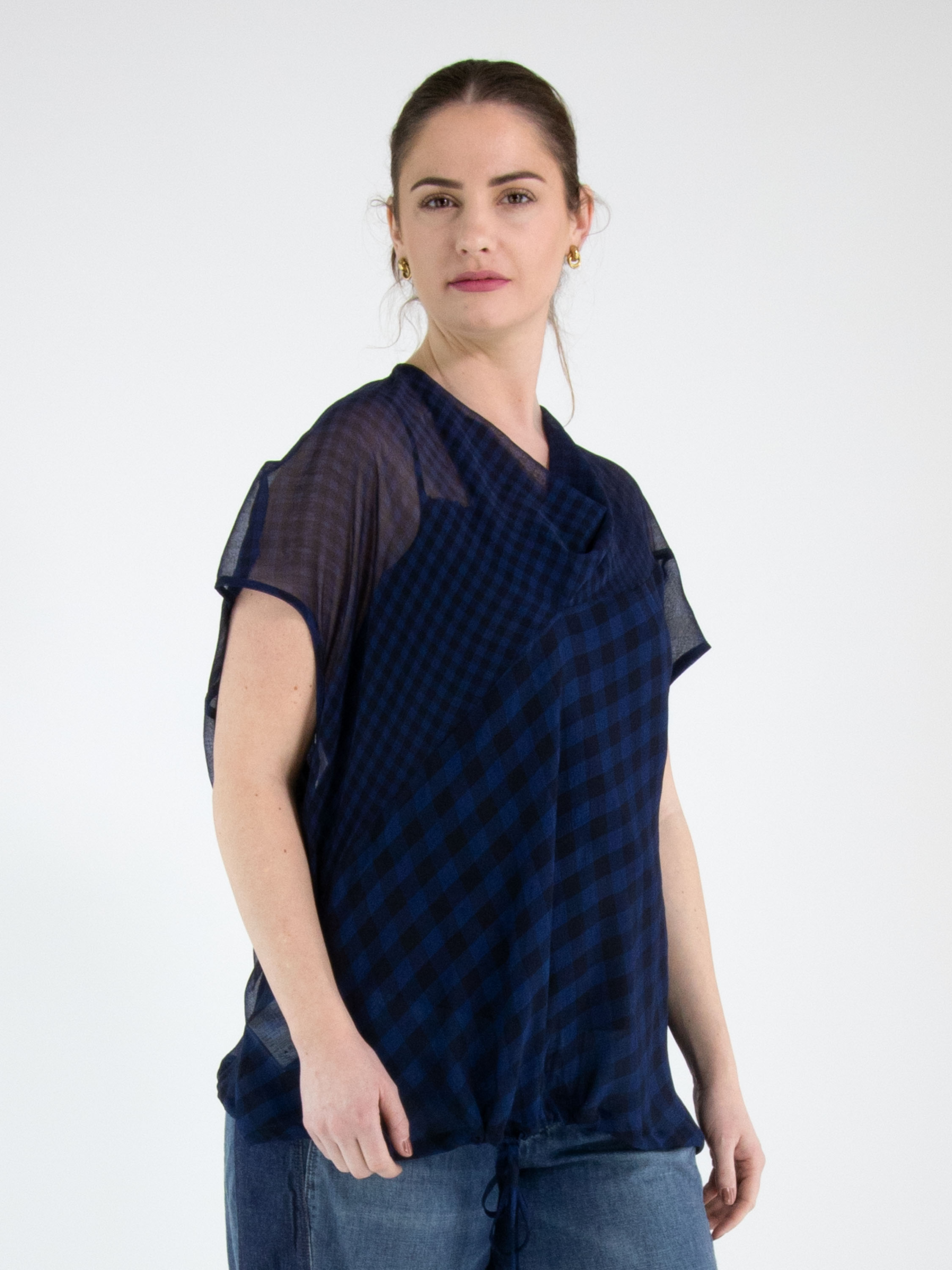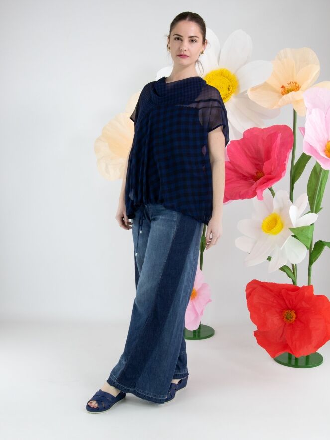 Ein transparentes Shirt von High mit Blockmuster in Nachtblau. Das Shirt hat einen weich fallenden Ausschnitt. Im Saum ist ein Band in Tunnelverarbeitung eingearbeitet, mit dem ein Plisséeffekt erzeugt werden kann. Dieses Shirt kann per Hand gewaschen werden.