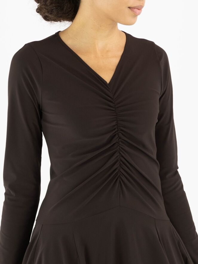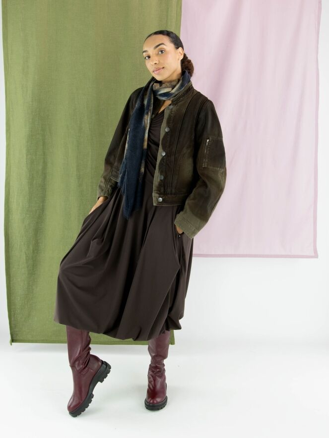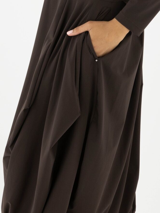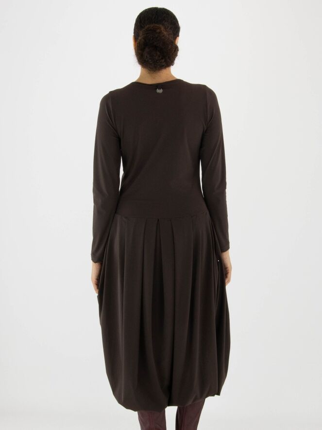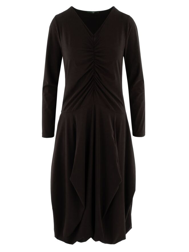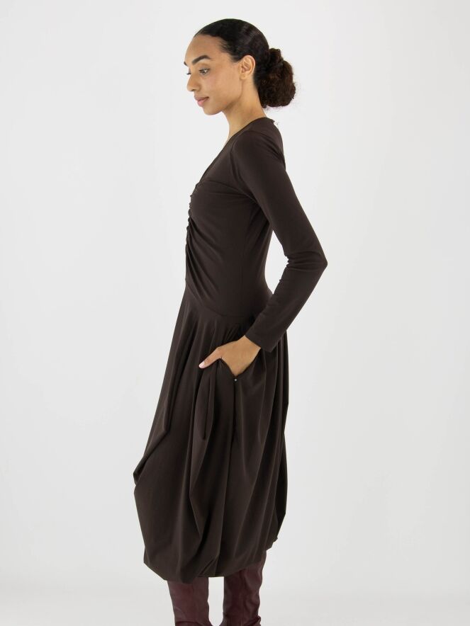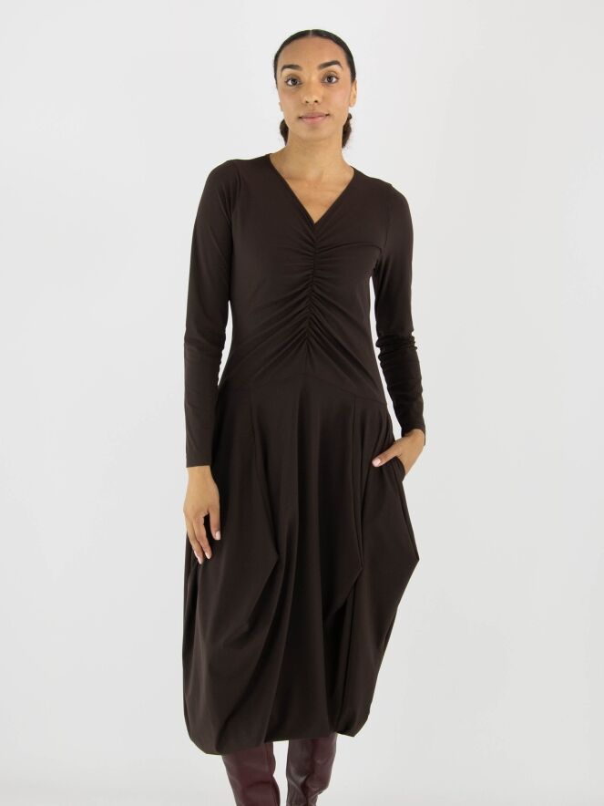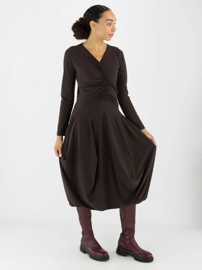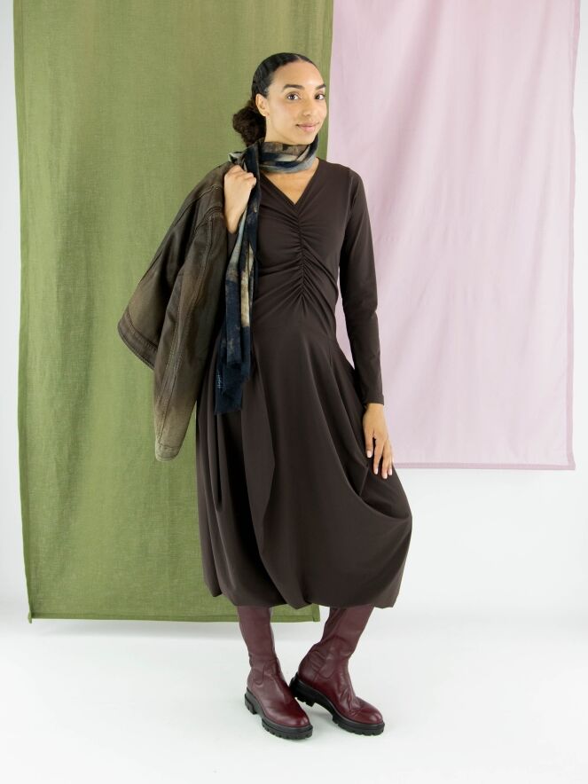 Kleid von High in Aubergine. Das Kleid hat einen V-Ausschnitt und lange Ärmel. Von der Mitte des Ausschnitts verläuft eine Naht nach unten, entlang der der Stoff fein gerafft ist. Im Saum unten ist der Stoff mit elastischem Garn fein gerafft genäht, was einen ballonartigen Effekt erzeugt. Auf Taillenhöhe befinden sich seitliche Eingrifftaschen. Hinten verläuft auf Taillenhöhe eine Naht mit feinen Falten. Dieses Kleid kann bei 30 Grad gewaschen werden.