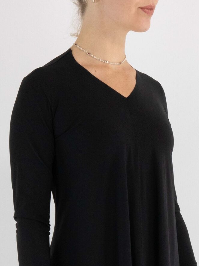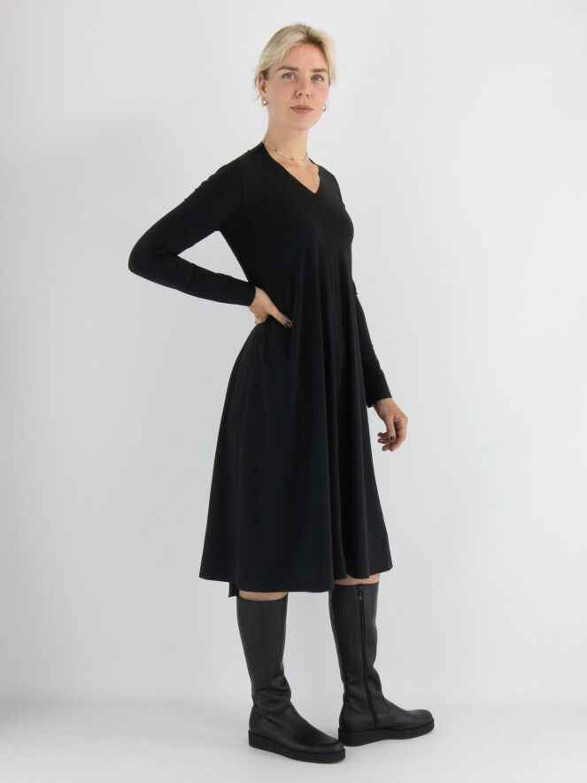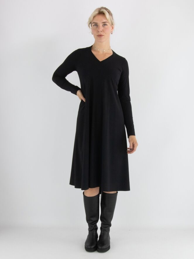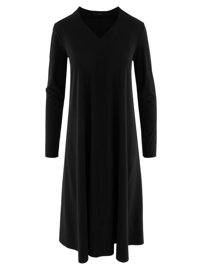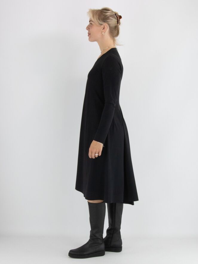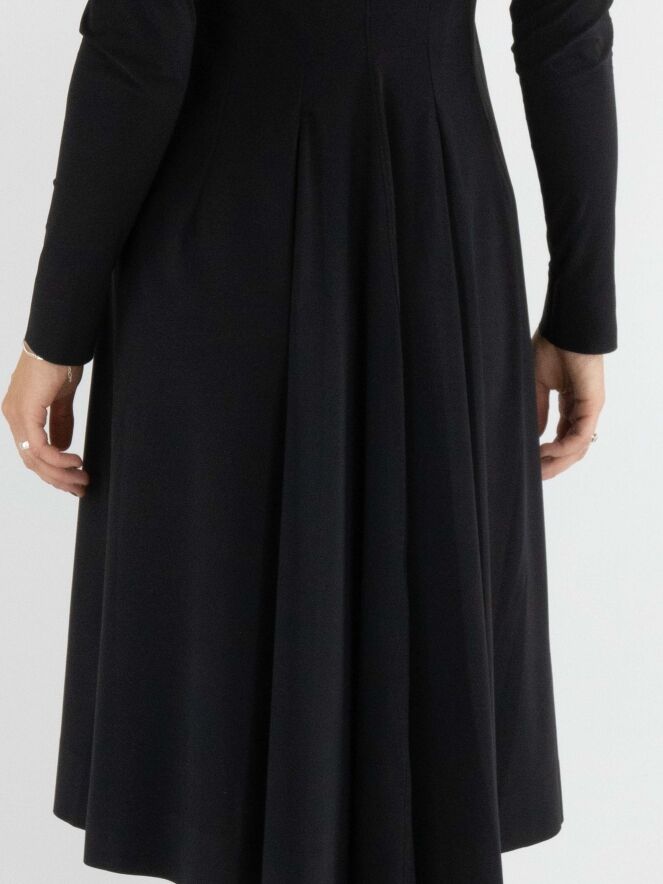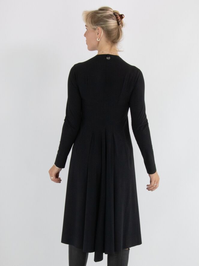 Kleid von High in Schwarz. Das Kleid hat einen hohen V-Ausschnitt und lange Ärmel. Hinten sorgen mehrere Kellerfalten ab der Taille für einen fließenden Effekt. Das Kleid ist in A-Linie geschnitten und sollte von Hand gewaschen werden.