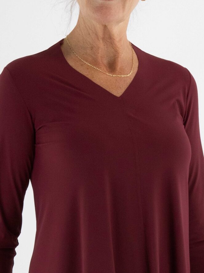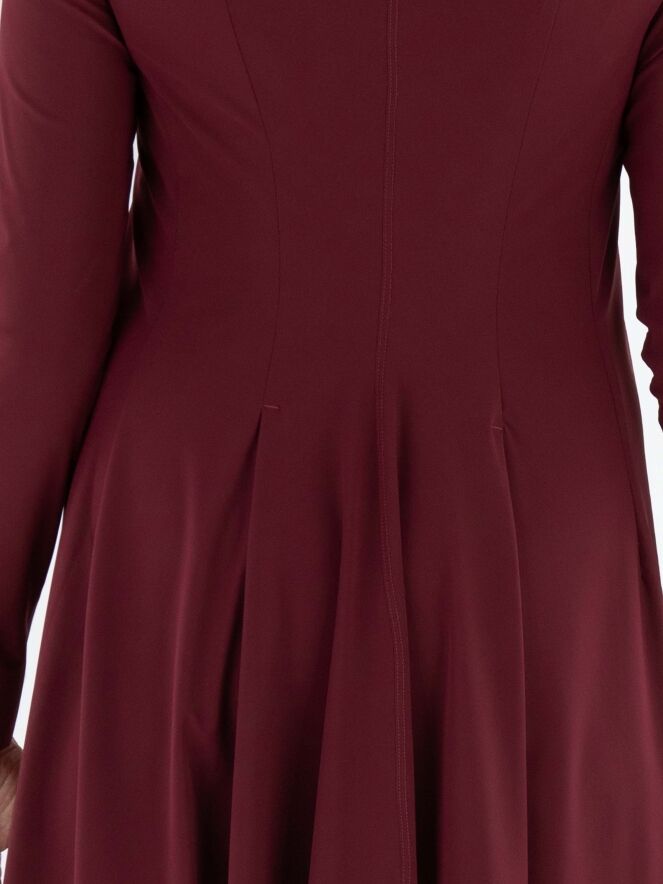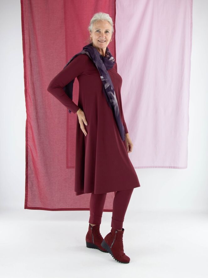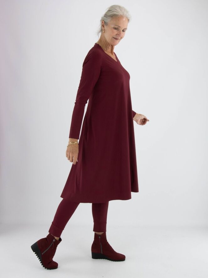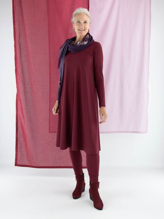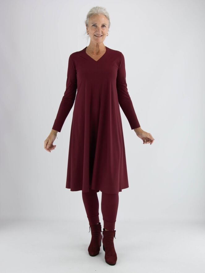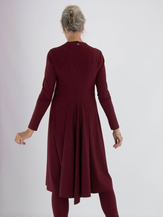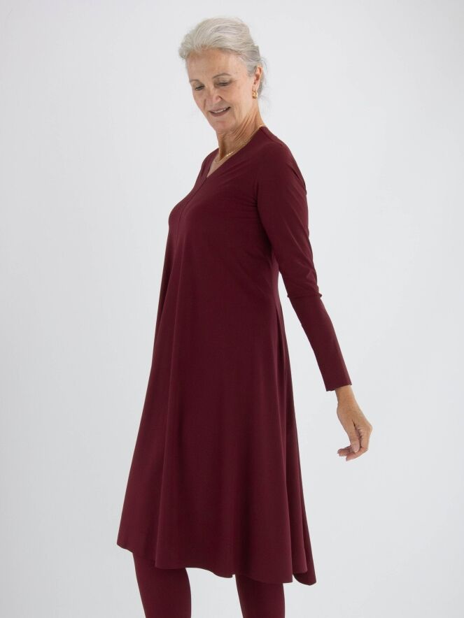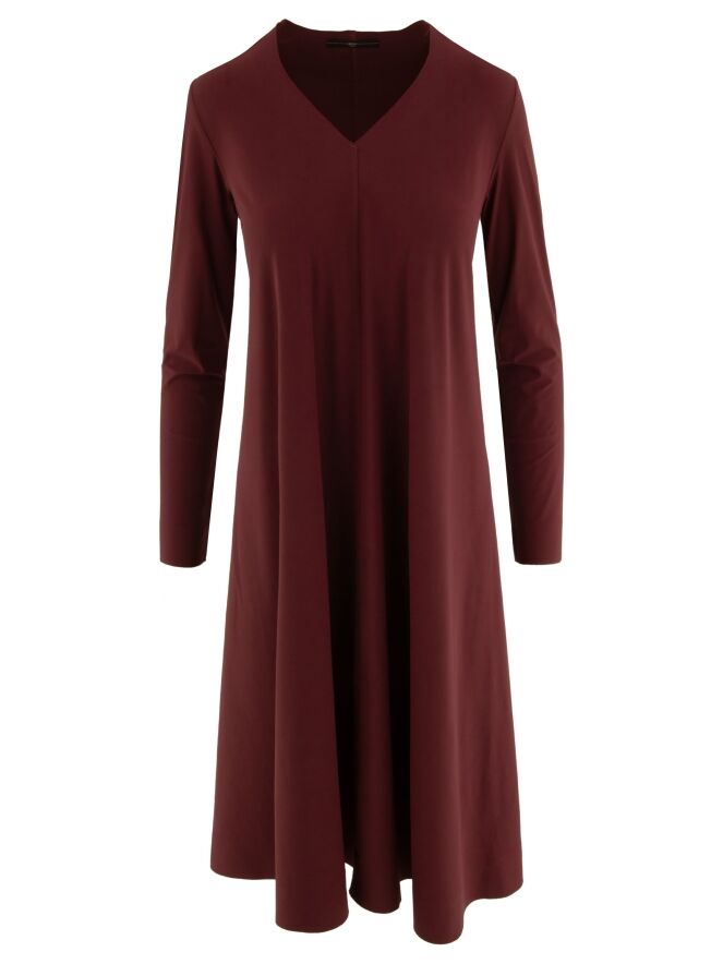 Ein Kleid von High in der Farbe Aubergine. Das Kleid hat einen hohen V-Ausschnitt und lange Ärmel. Hinten sorgen mehrere Falten aus der Taille für einen fließenden Effekt. Das Kleid ist in A-Linie geschnitten und sollte von Hand gewaschen werden.