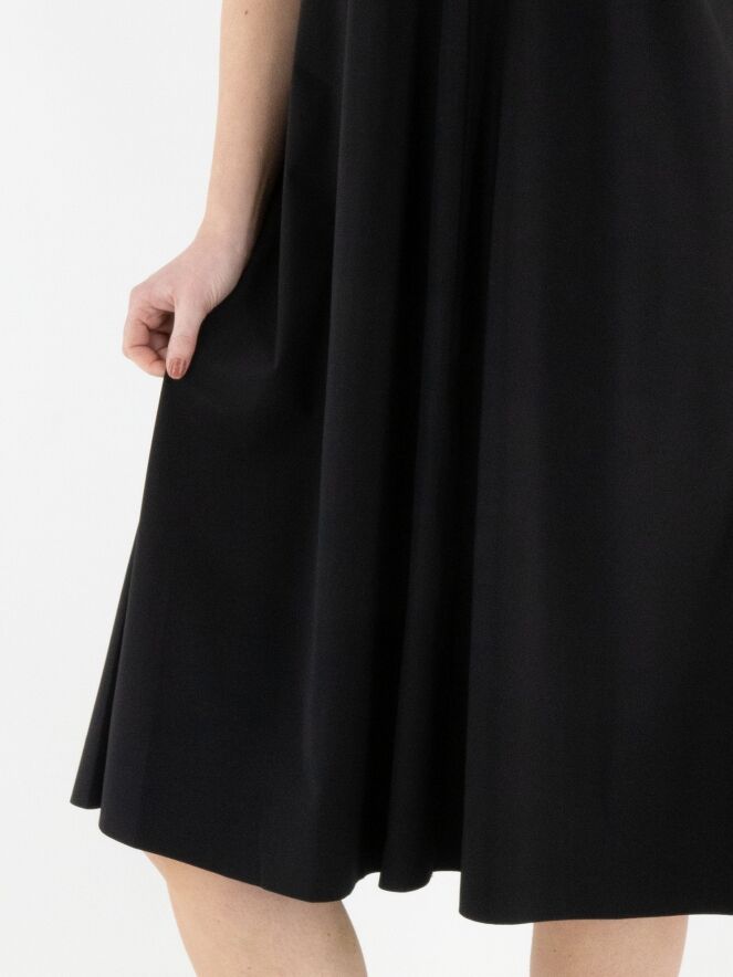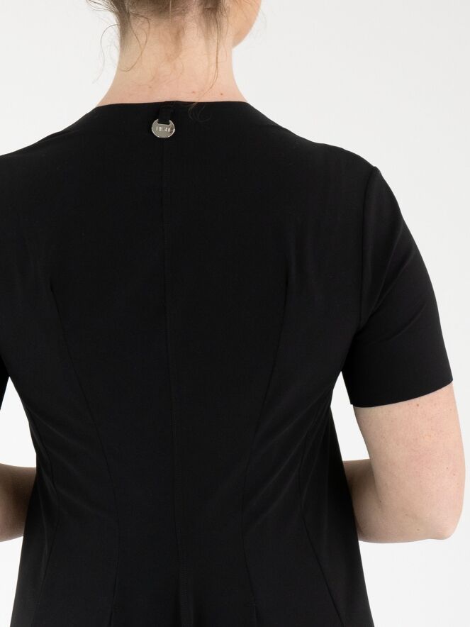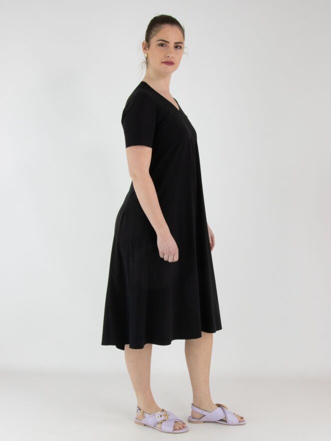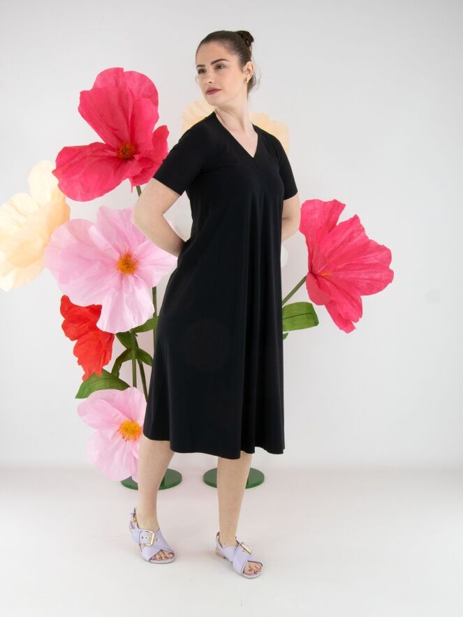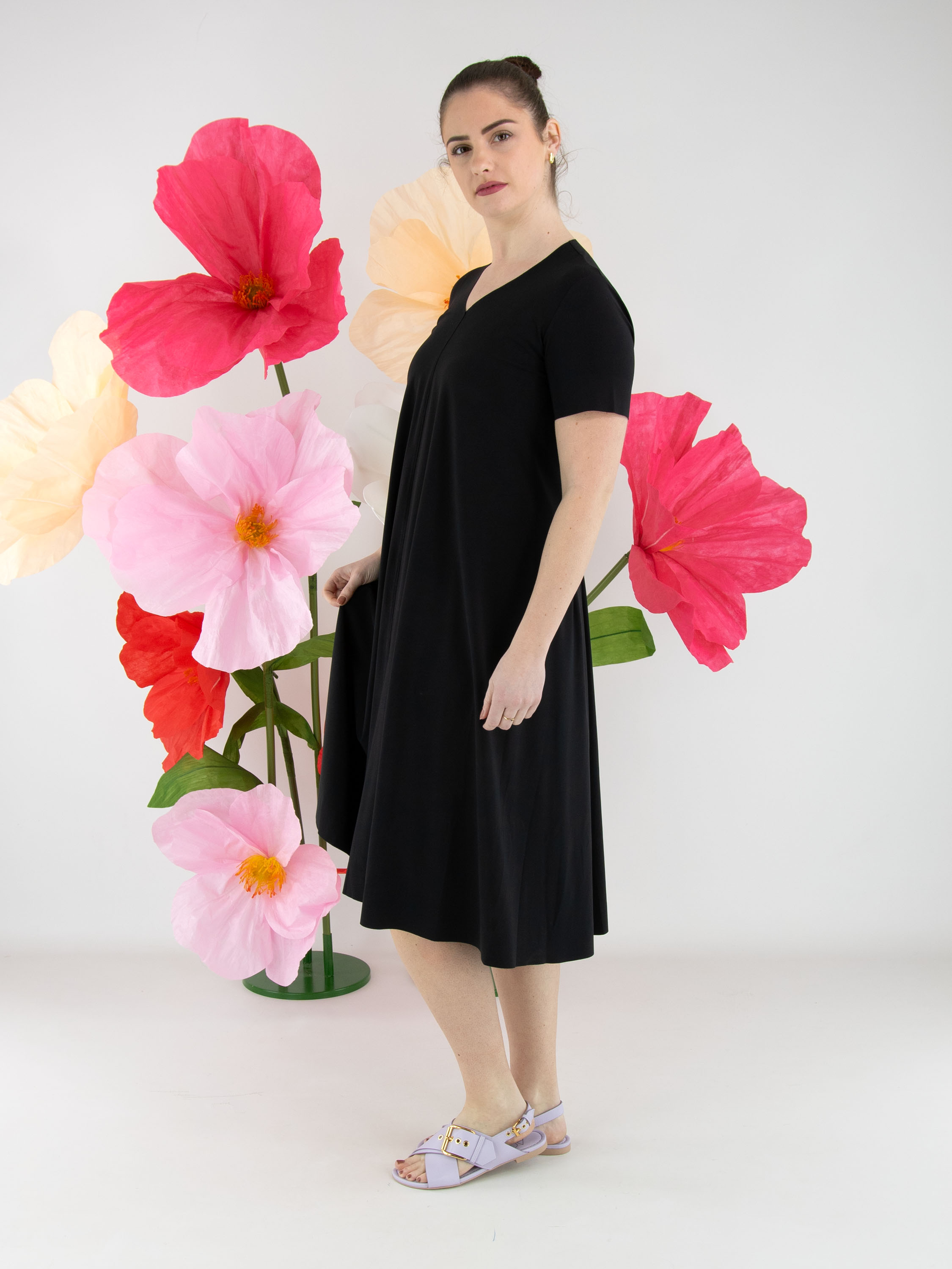 Ein Kleid von High in Schwarz. Das Kleid hat einen V-Ausschnitt und kurze Ärmel. Es hat eine leichte A-Linie und kann per Hand gewaschen werden.