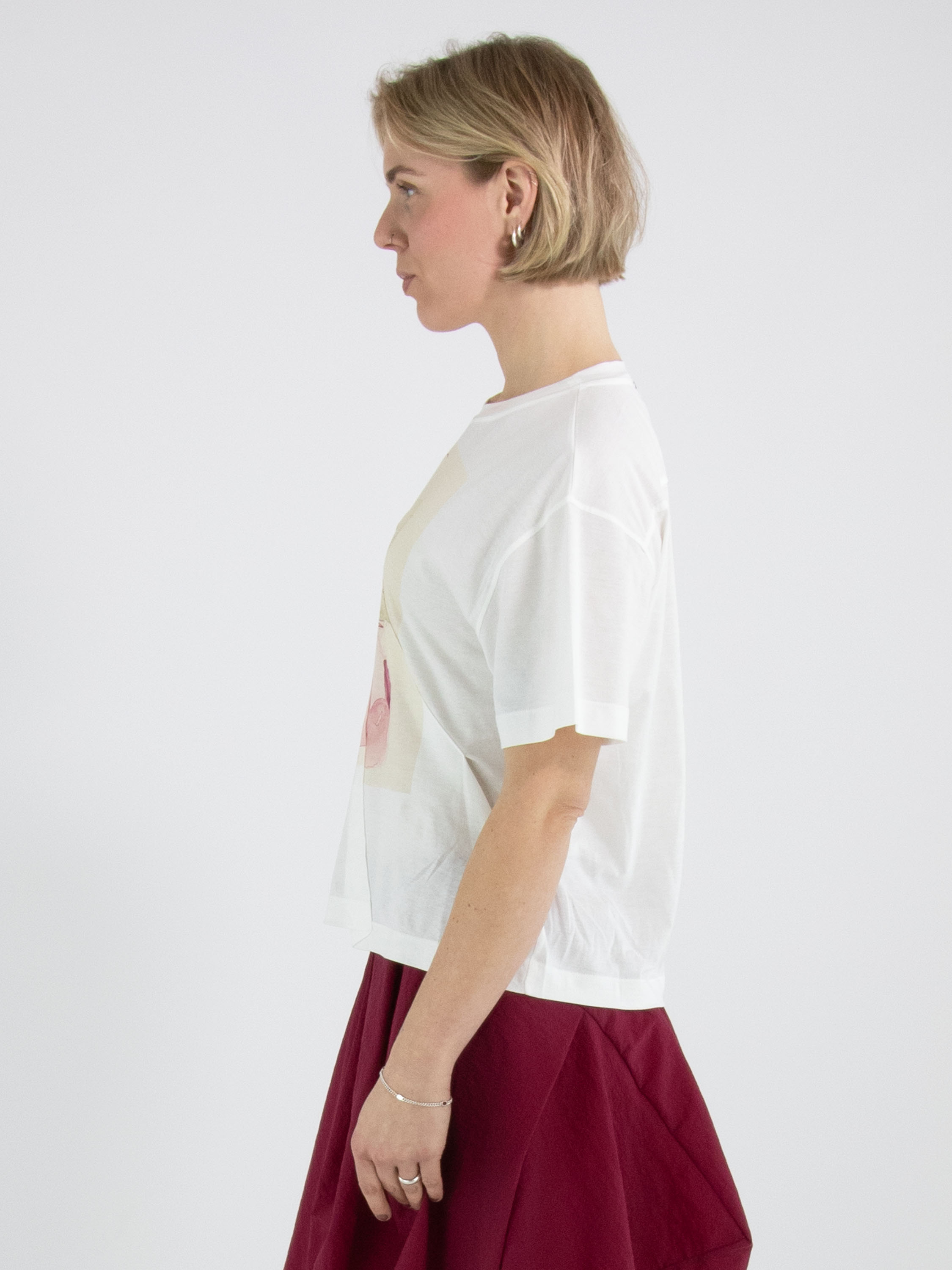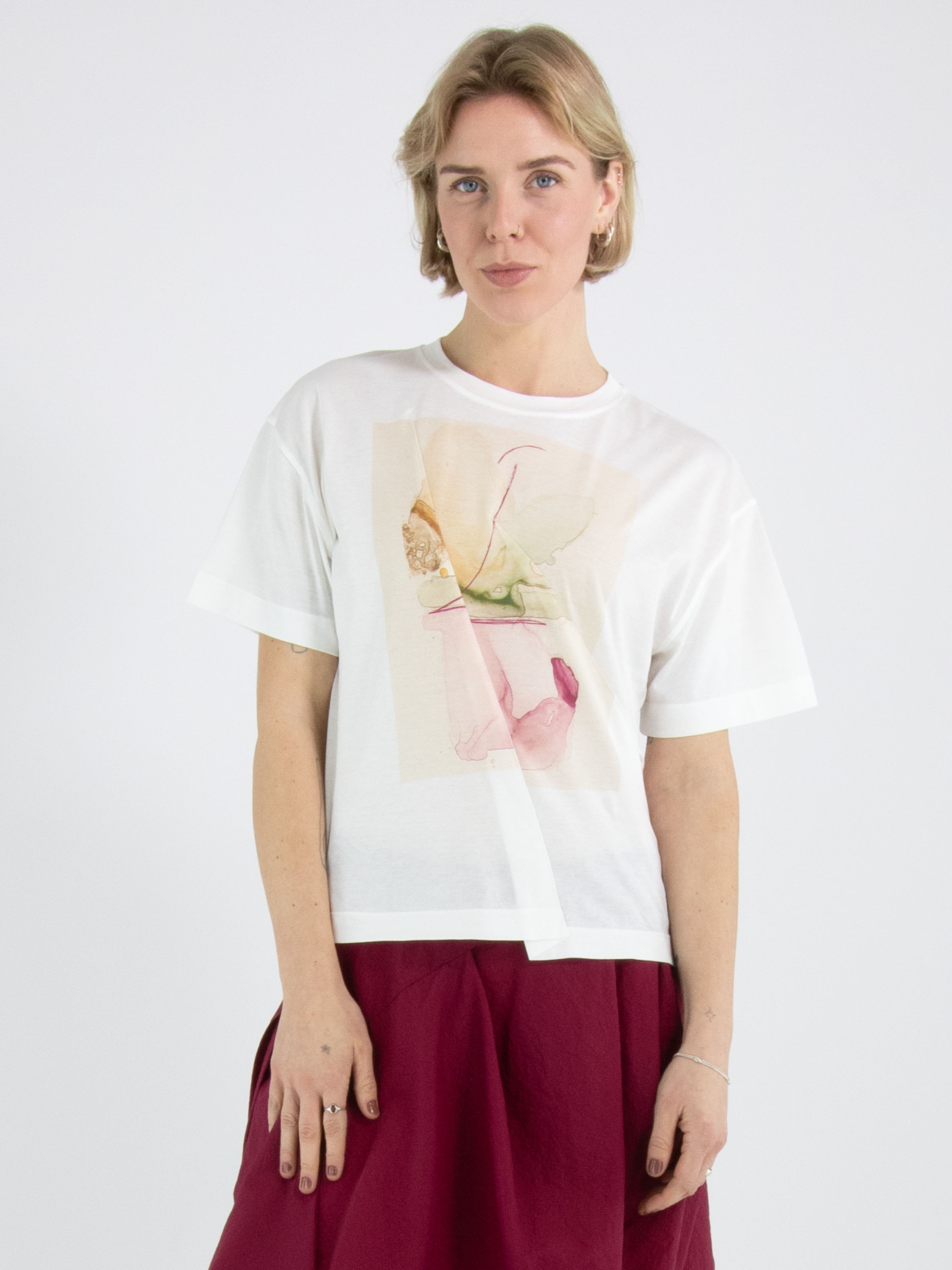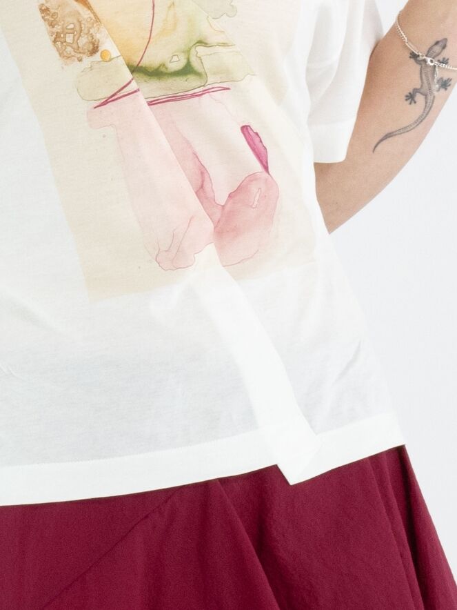 Ein Shirt von High in Weiß. Auf der Vorderseite befindet sich ein grafisches Foto der Fotografin Manuela de la Vega Castro. Von der rechten Schulter verlaufen zwei diagonale Nähte nach unten. Das Shirt hat kurze Ärmel und einen Rundhalsausschnitt und kann per Hand gewaschen werden.
