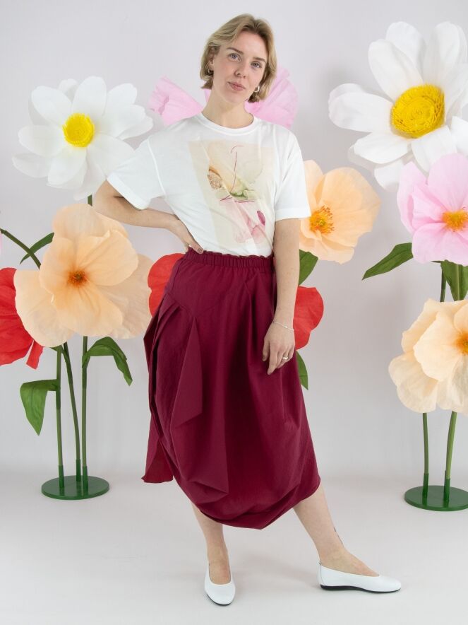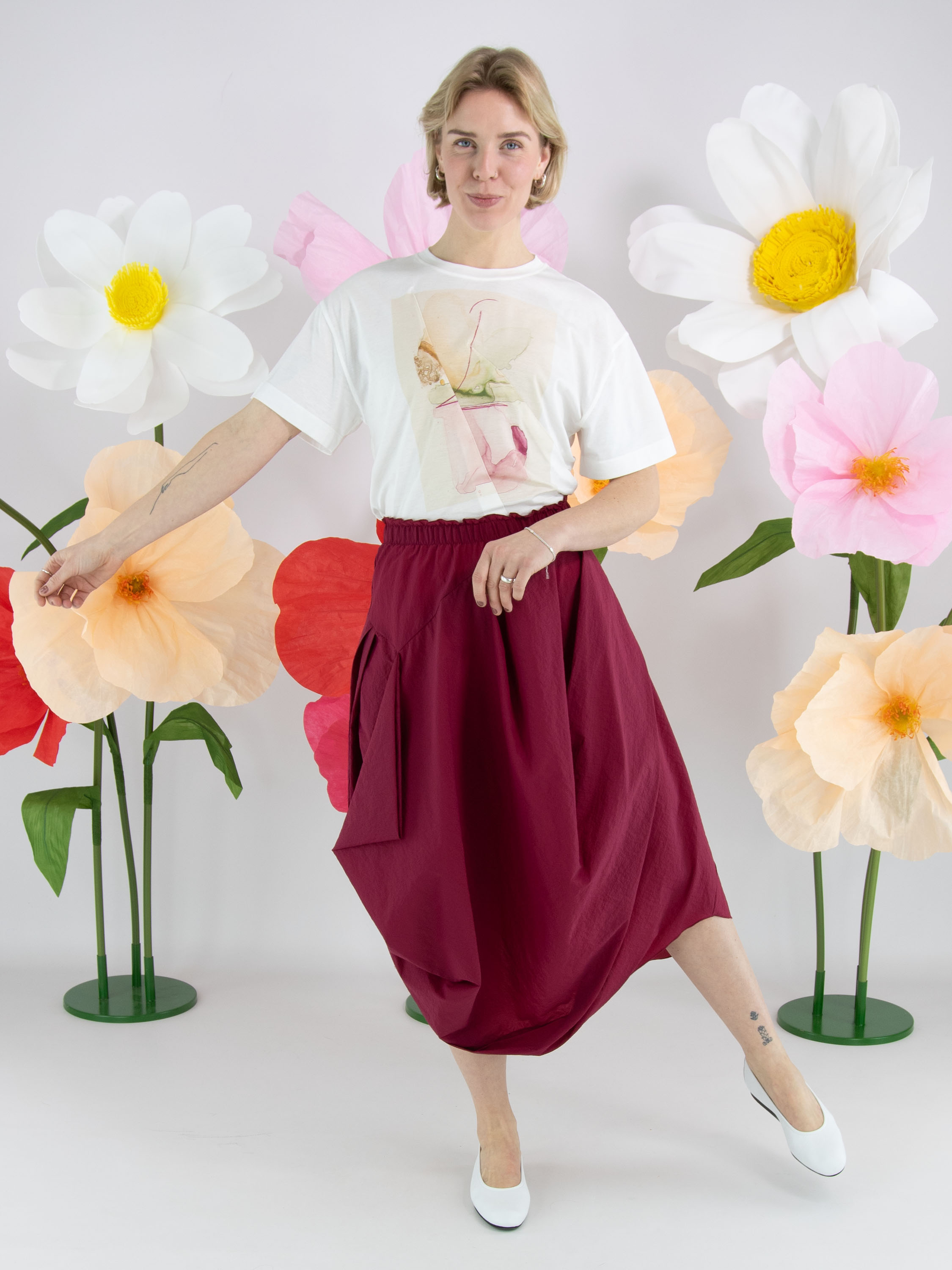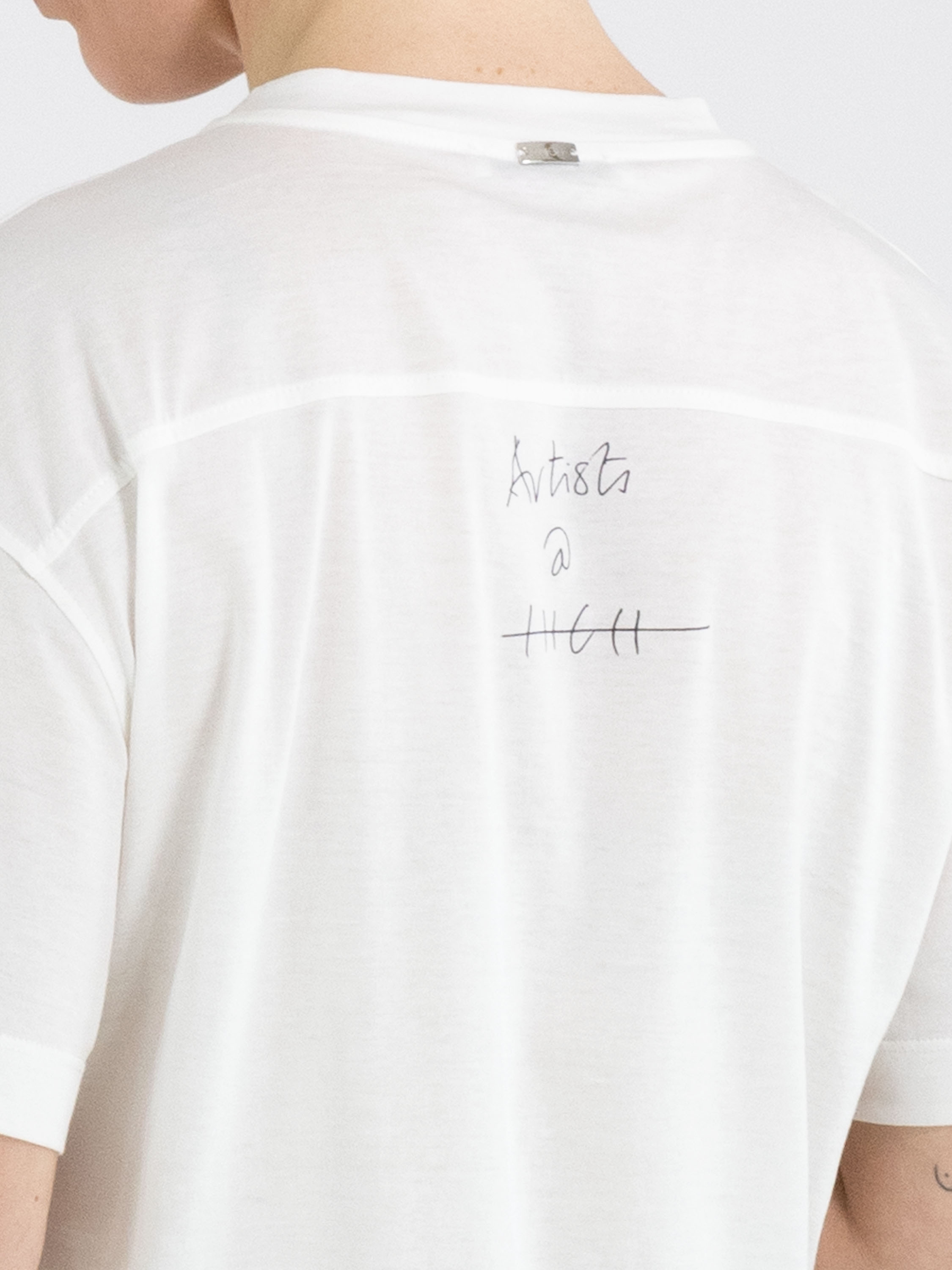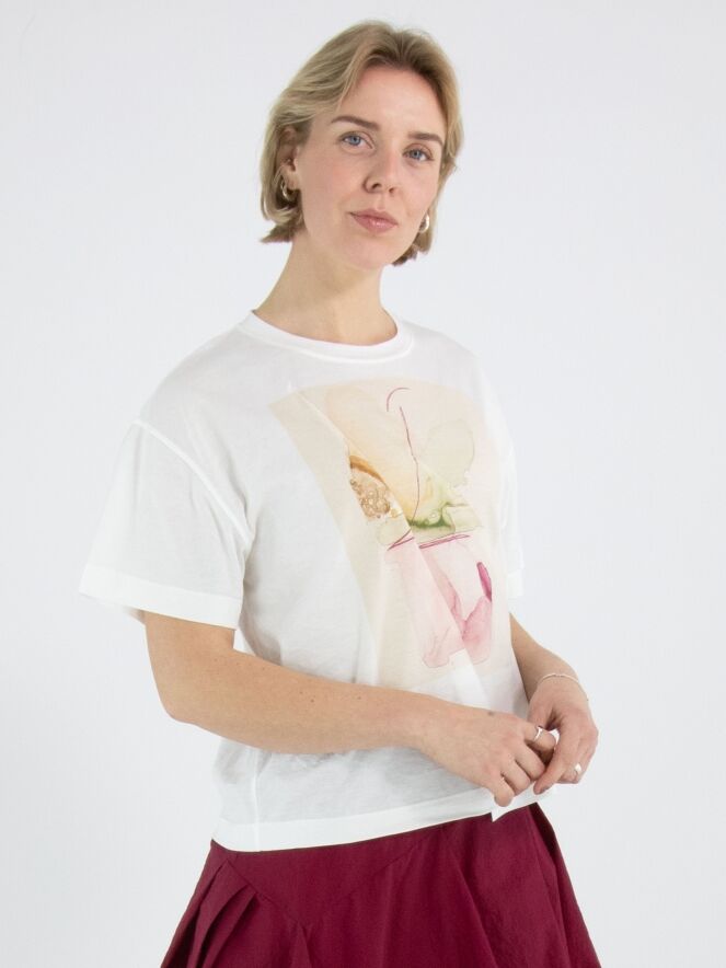 Ein Shirt von High in Weiß. Auf der Vorderseite befindet sich ein grafisches Foto der Fotografin Manuela de la Vega Castro. Von der rechten Schulter verlaufen zwei diagonale Nähte nach unten. Das Shirt hat kurze Ärmel und einen Rundhalsausschnitt und kann per Hand gewaschen werden.