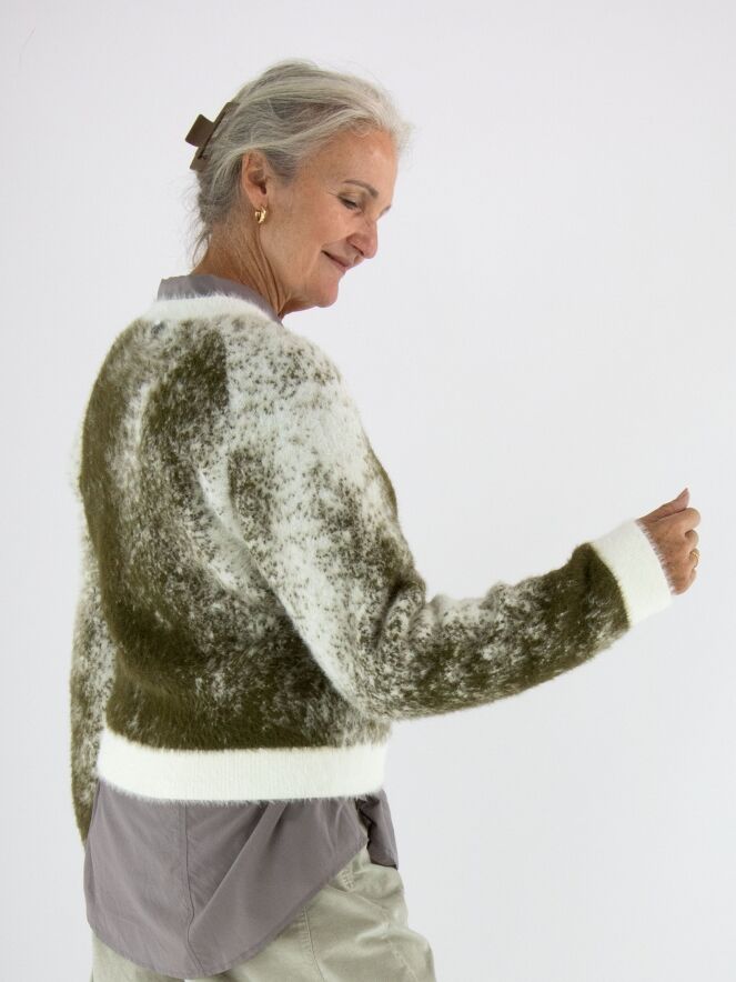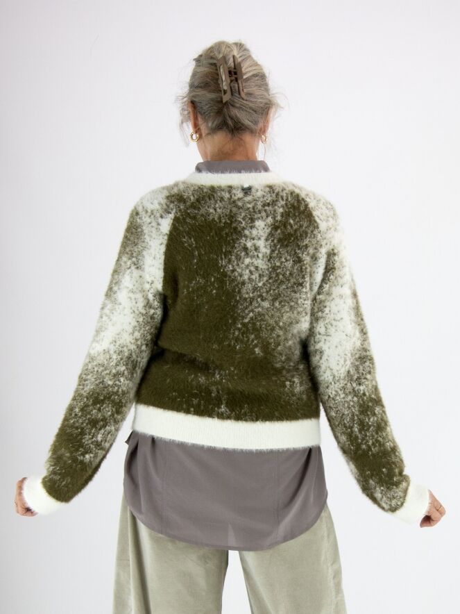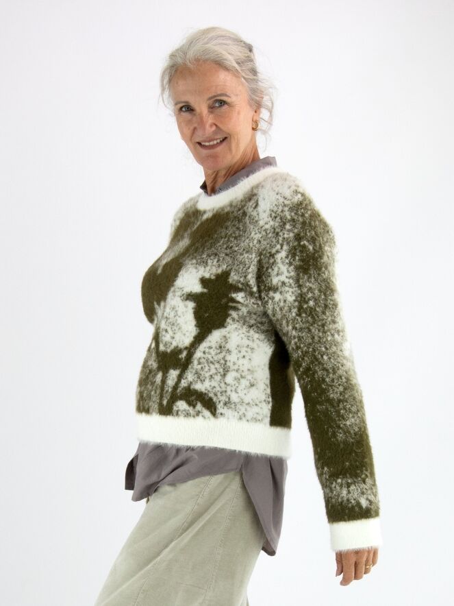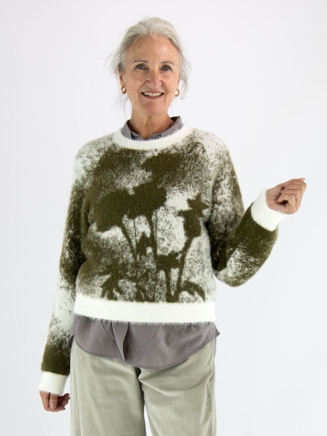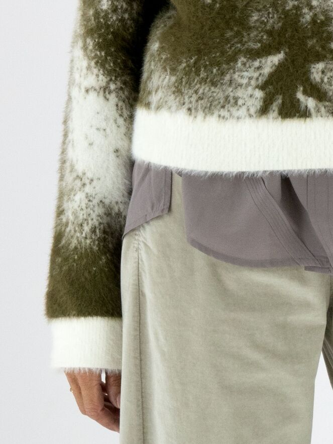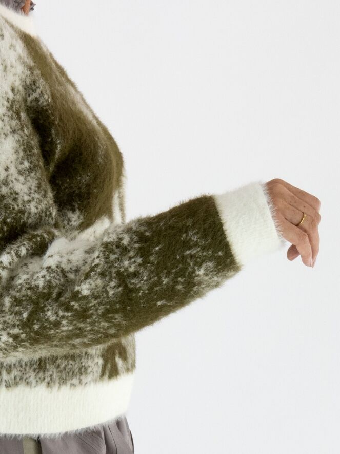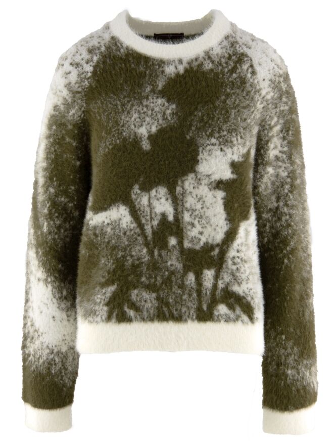 Ein Pullover von High mit grafischem Print in Olivgrün und Cremeweiß. Der Rundhalsausschnitt, die Ärmelabschlüsse und der Saum sind mit einem weißen Bündchen versehen. Das elastische Material hat eine Mohair-Optik und sollte von Hand gewaschen werden.