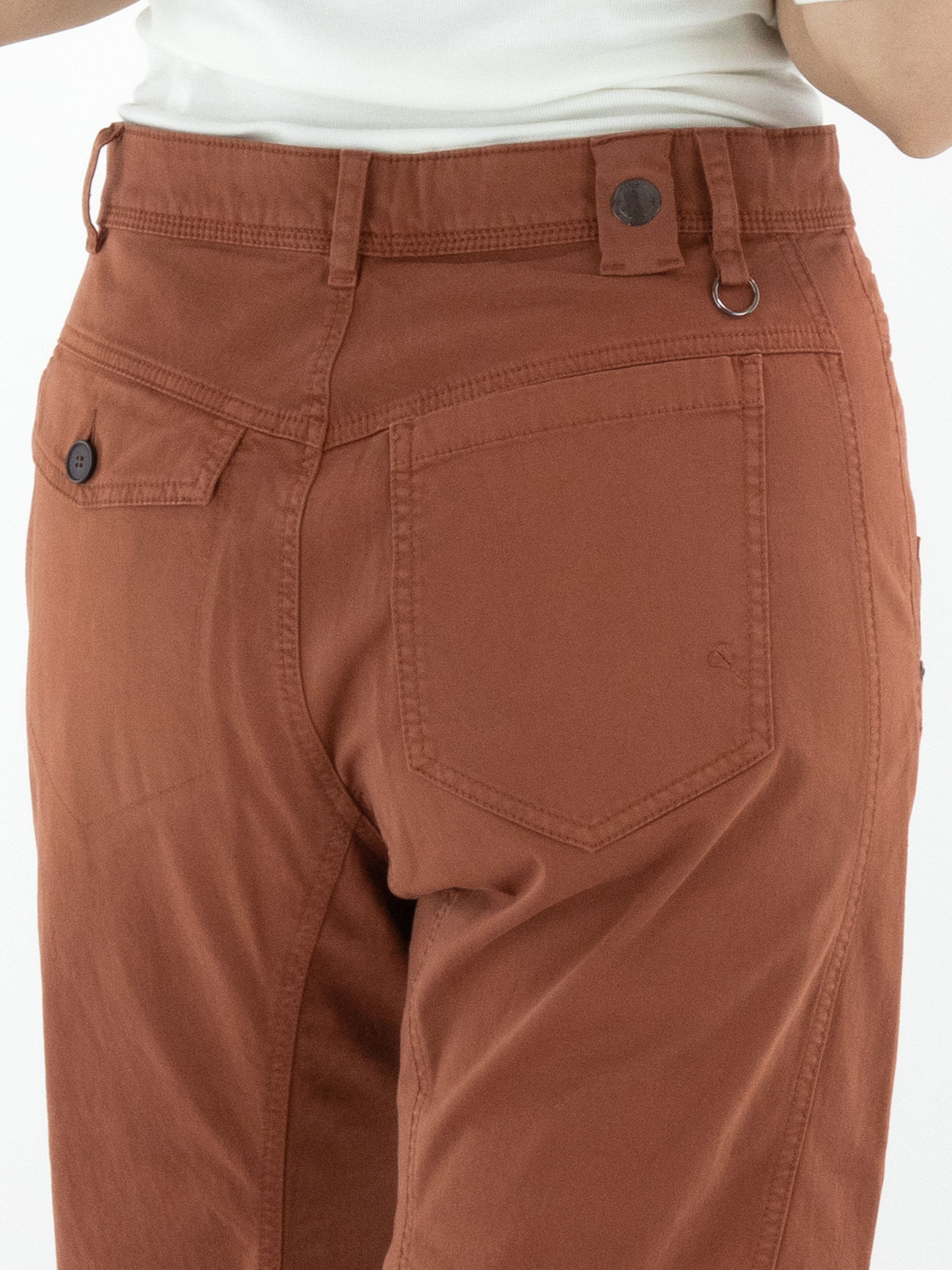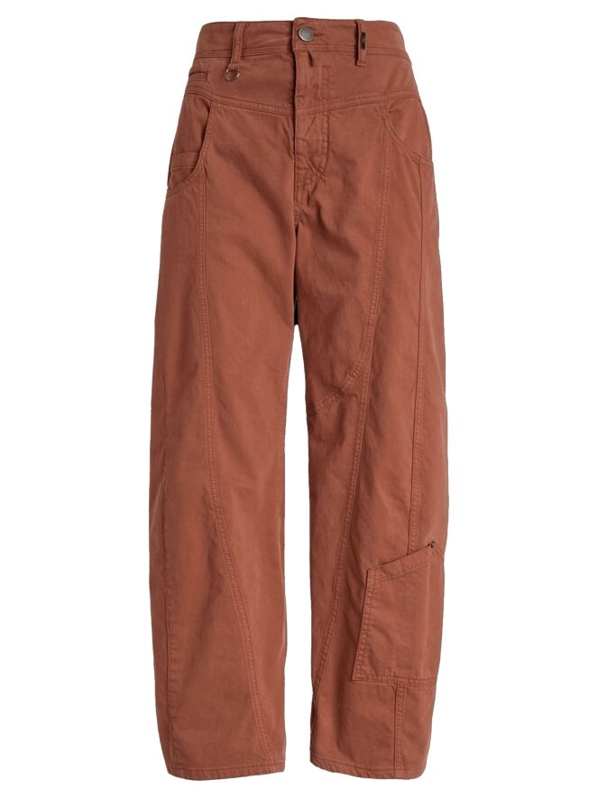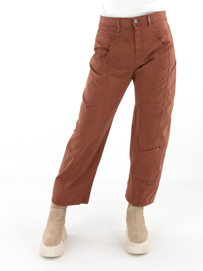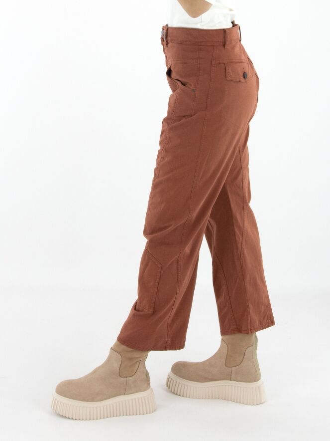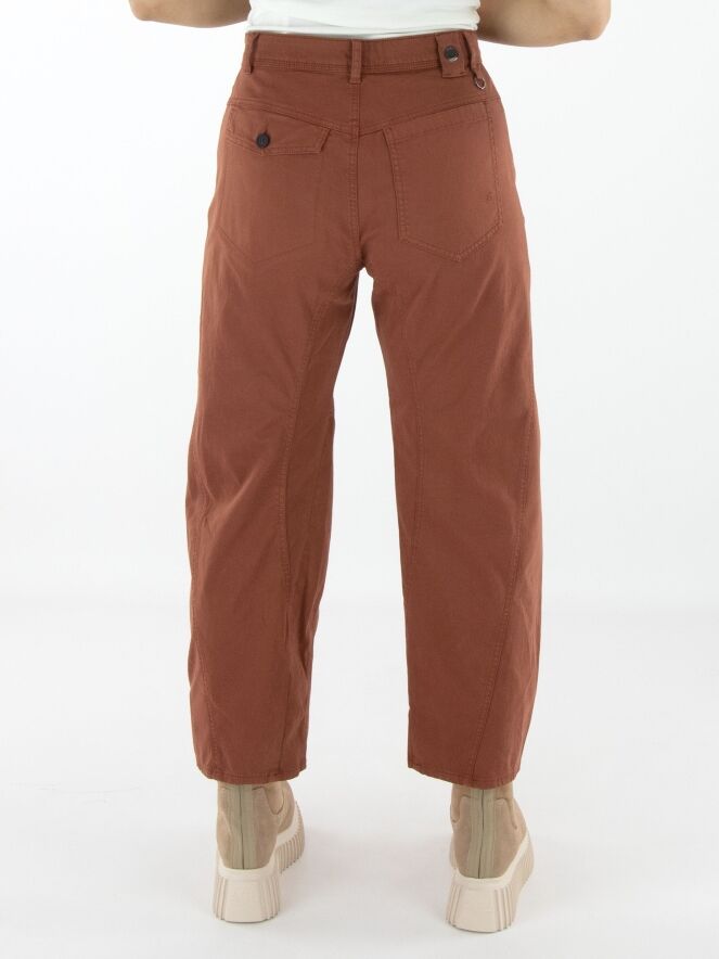 Eine Jeans von High in Rostbraun. Das Modell ist im Design-5-Pocket-Stil gearbeitet. Am unteren Ende des linken Beins ist eine dekorative, umgekehrte Tasche angebracht, die der Jeans ein auffälliges, künstlerisches Detail verleiht. Diese Jeans kann bei 30 Grad gewaschen werden.