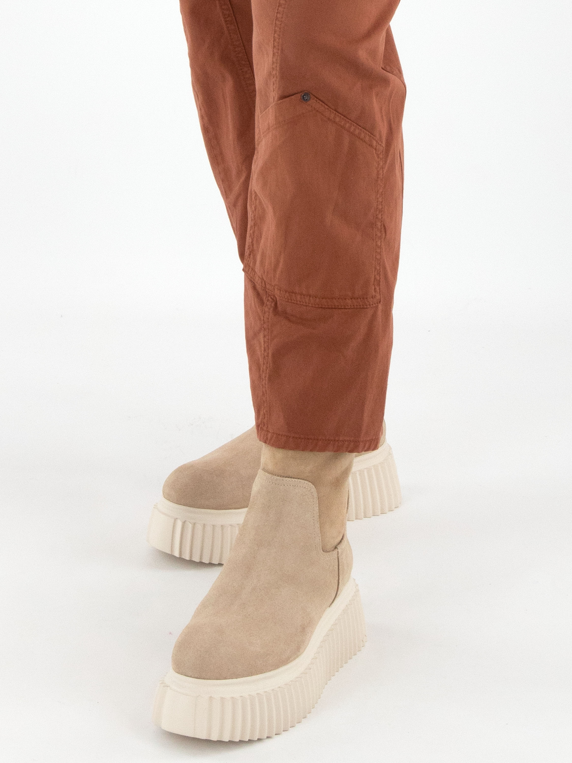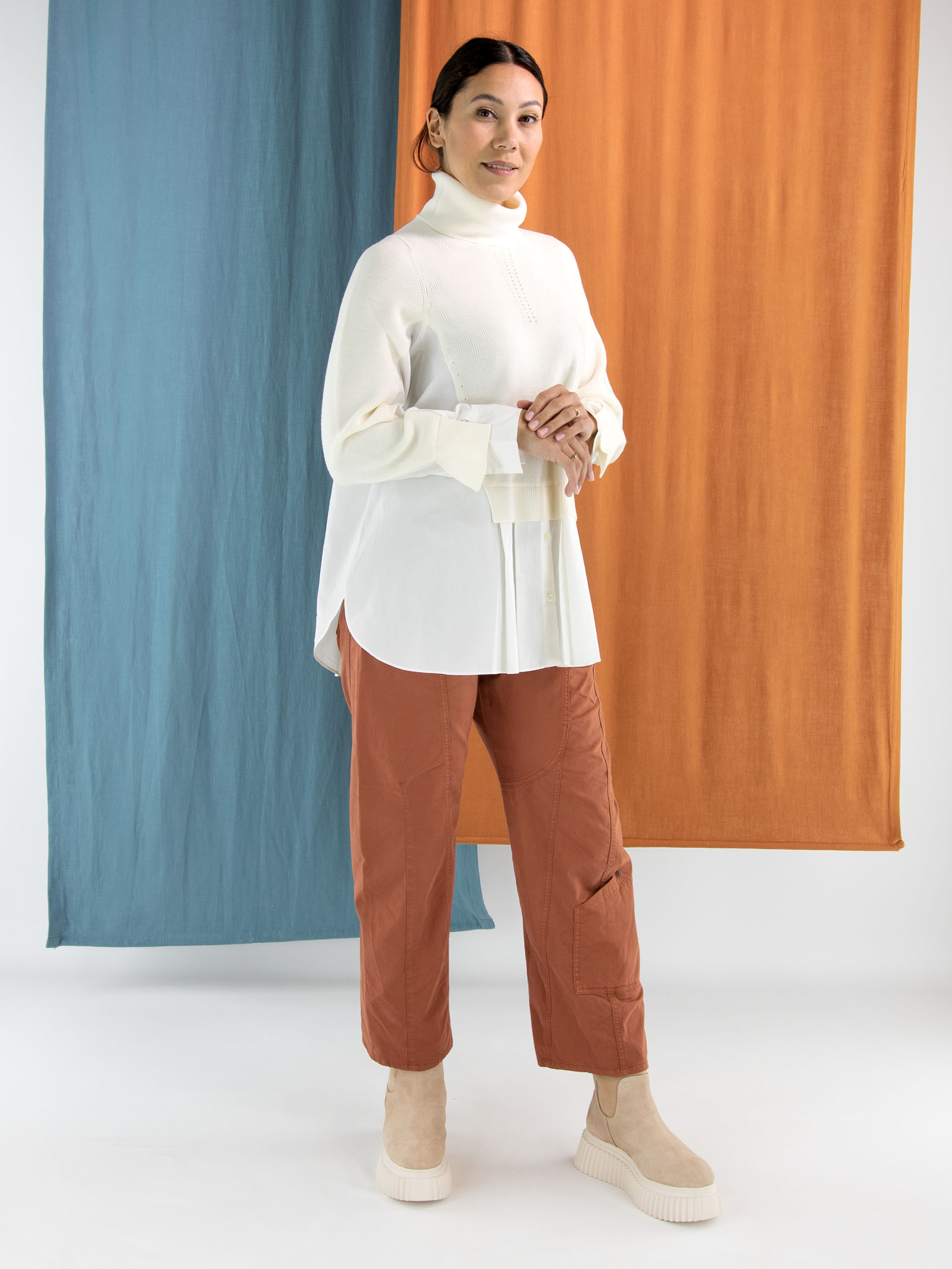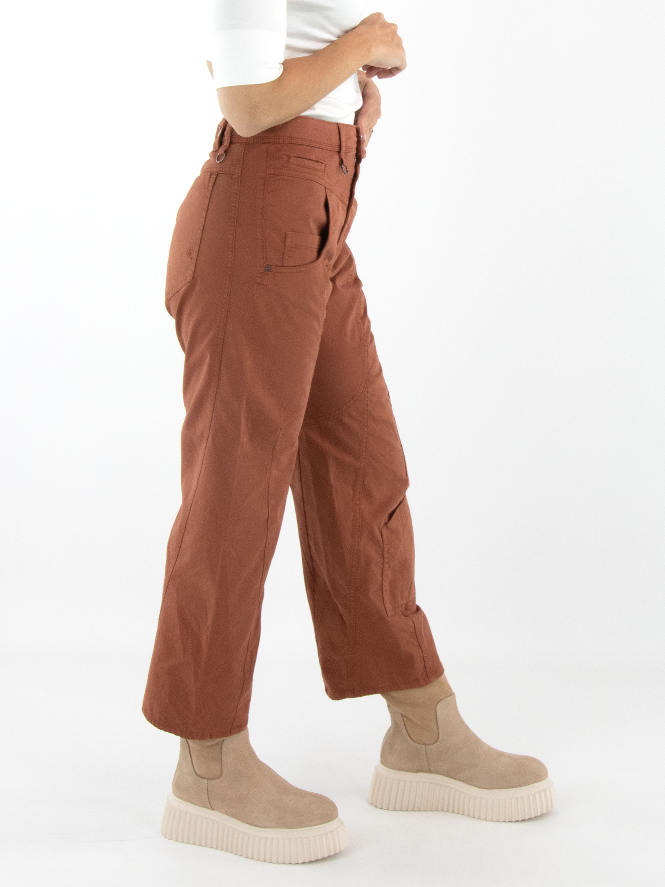 Eine Jeans von High in Rostbraun. Das Modell ist im Design-5-Pocket-Stil gearbeitet. Am unteren Ende des linken Beins ist eine dekorative, umgekehrte Tasche angebracht, die der Jeans ein auffälliges, künstlerisches Detail verleiht. Diese Jeans kann bei 30 Grad gewaschen werden.