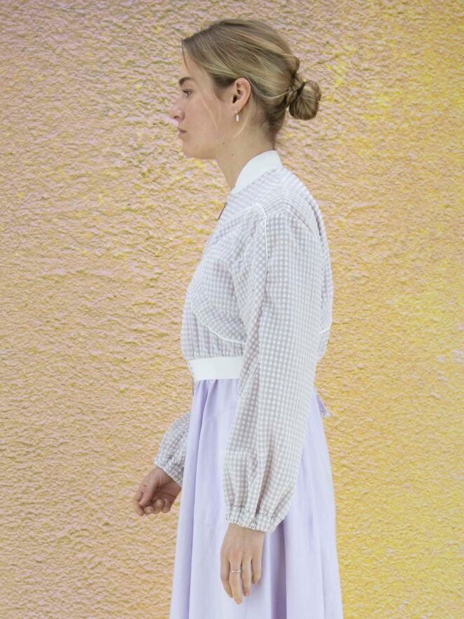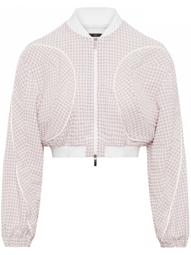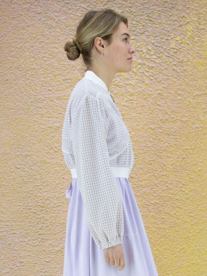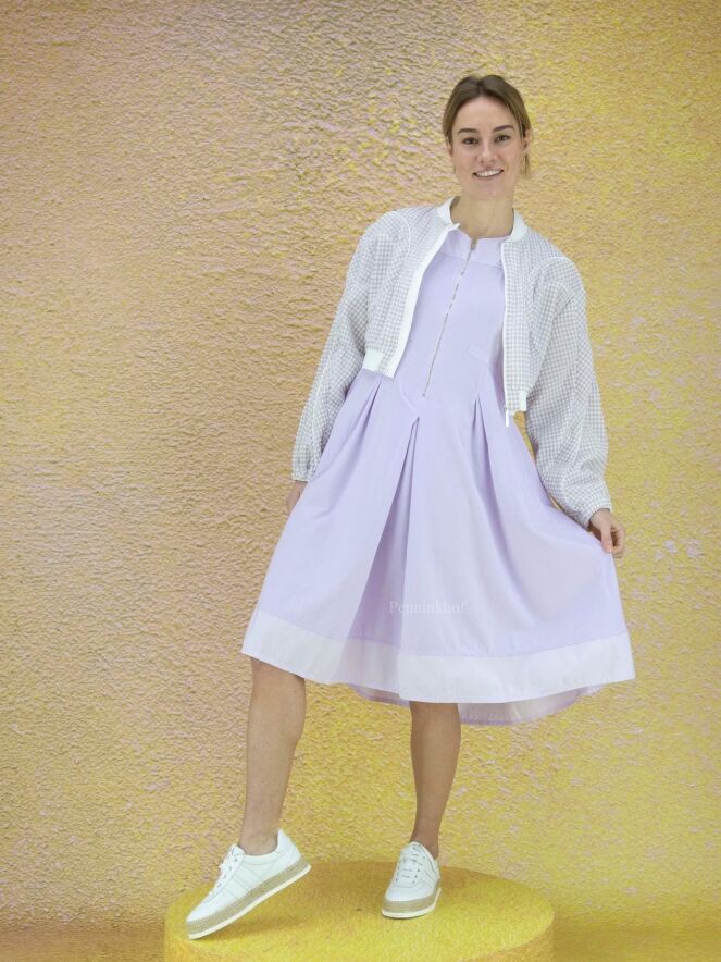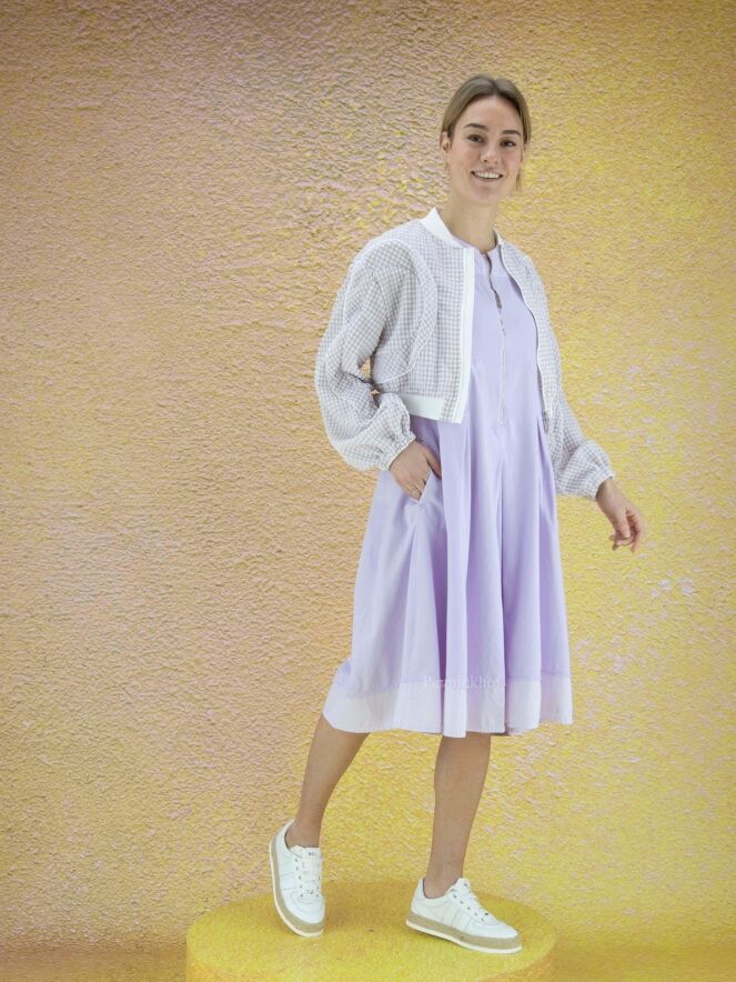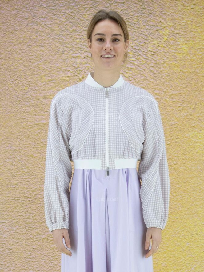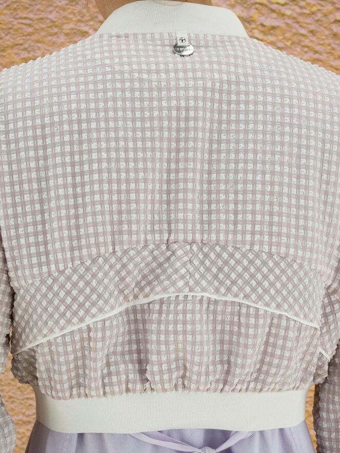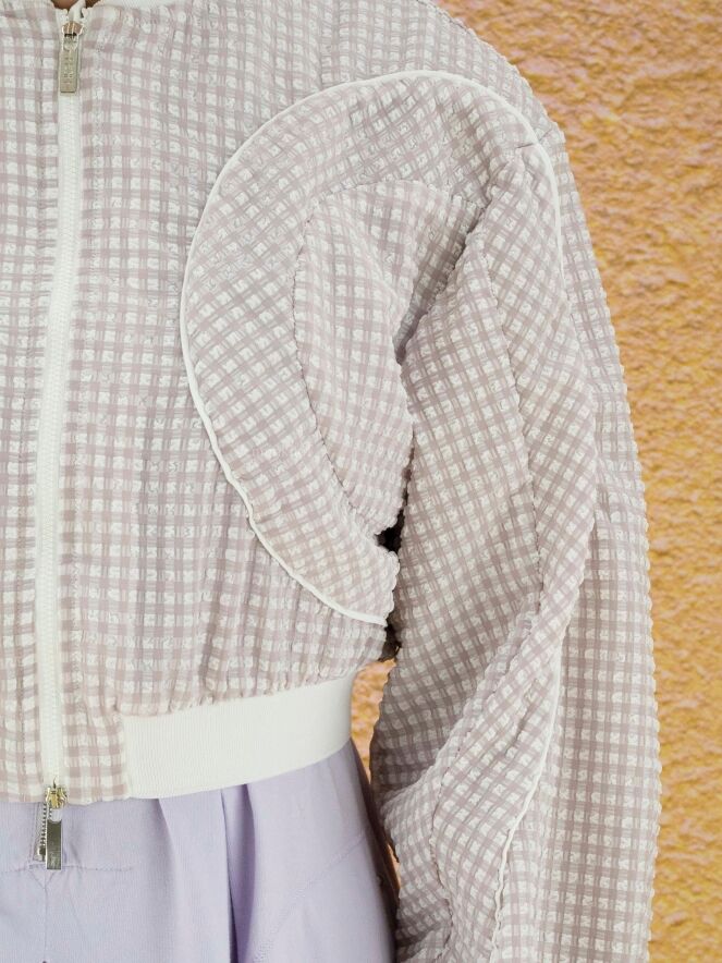 Eine kurze Strickjacke der Designermarke High mit Waffelmuster und Relief in Flieder und Weiß. Entlang der Kragenkante und am unteren Saum der Strickjacke befindet sich ein Strickbündchen. Im Rand der langen Ärmel befindet sich eine elastische Paspel. Die Weste hat einen Reißverschluss und kann von Hand gewaschen werden.