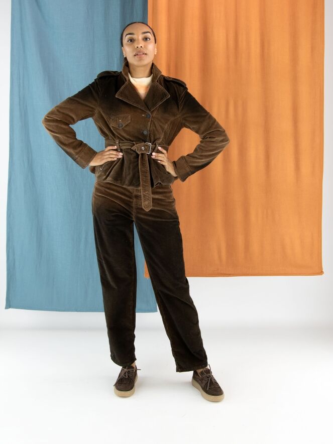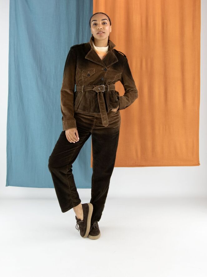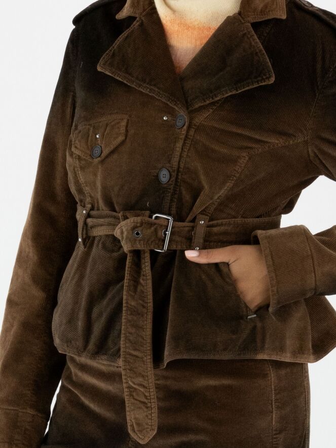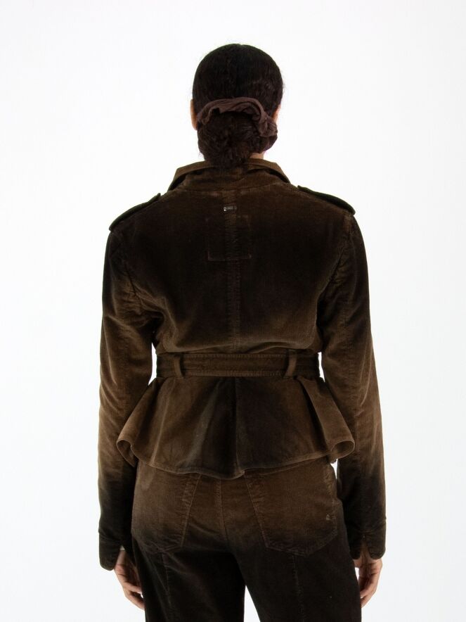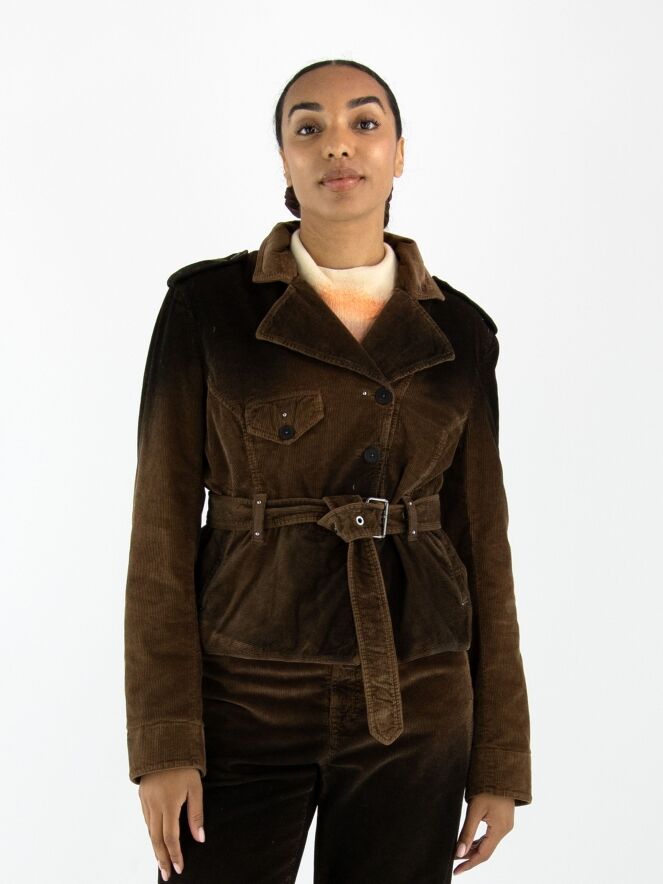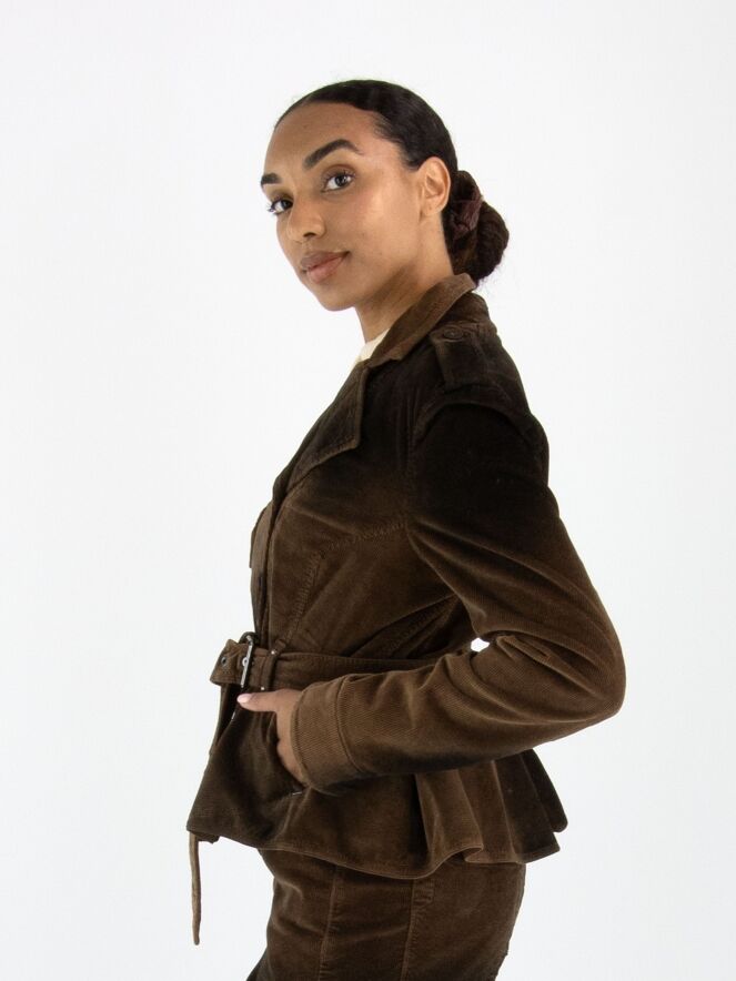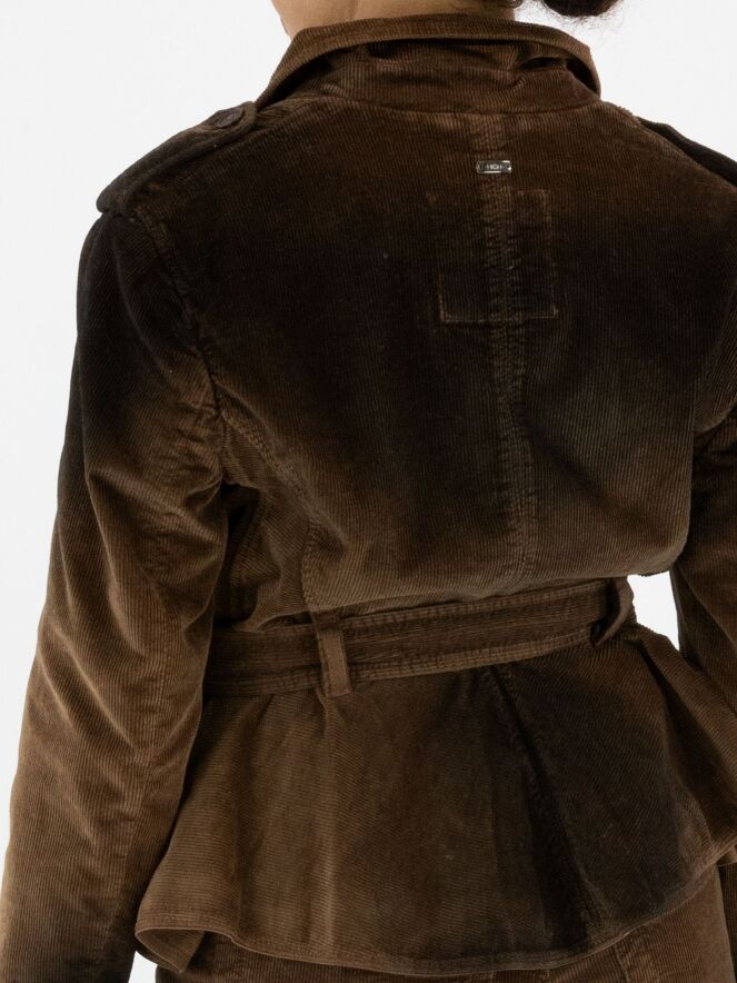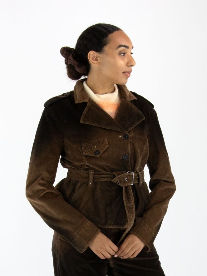 Cordblazer von High in einem Dégradé-Farbverlauf: mokkabraun an den Schultern und am Saum, in der Mitte braun. Die Jacke hat eine asymmetrische Knopfleiste und einen Gürtel aus dem gleichen Stoff in der Taille. Unterhalb der Taille befinden sich Eingrifftaschen. Die Schultern sind mit Pailletten verziert. Dieser Blazer sollte von Hand gewaschen werden.