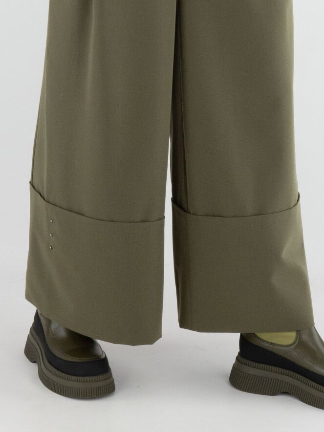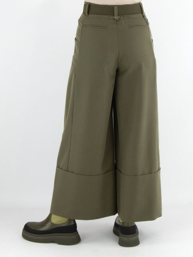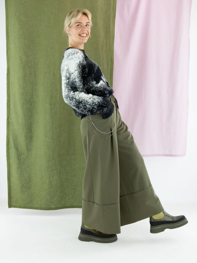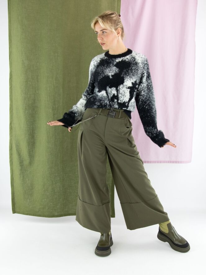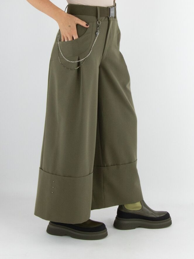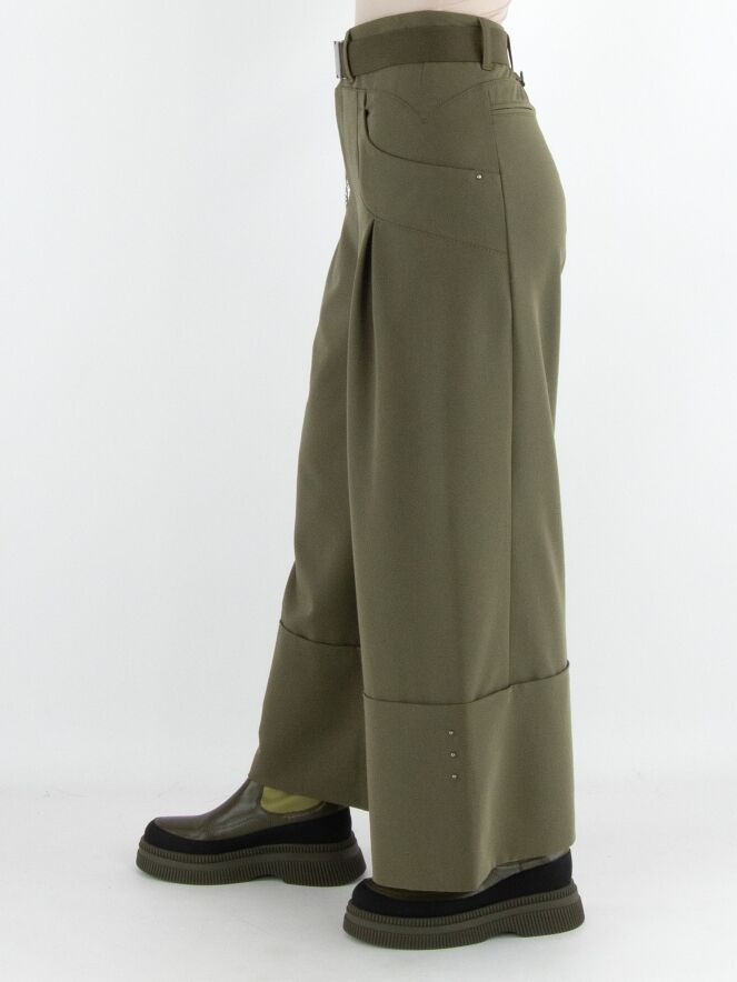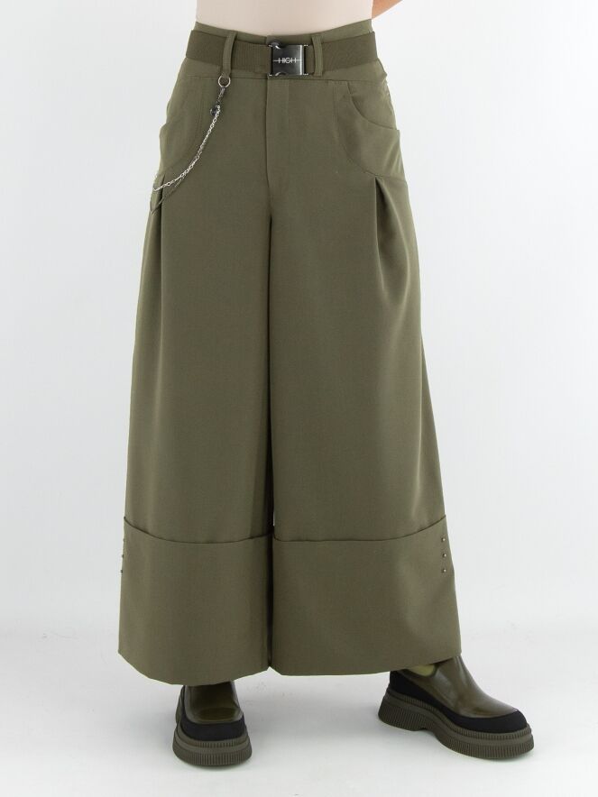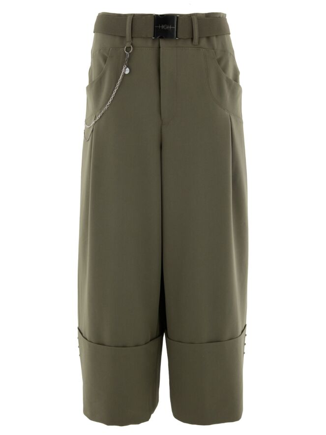 Eine weit geschnittene Hose von High in Olivgrün. In der Taille befindet sich ein elastischer Gürtel mit einer quadratischen, nickelfarbenen Schnalle. Unterhalb der rund geschnittenen Seitentaschen ist eine Bundfalte eingearbeitet. Auf Wadenhöhe verläuft eine umgekehrte Naht. Darunter, an der Außenseite des Beins, befinden sich drei dekorative Nieten untereinander. Diese Hose darf nicht gewaschen werden.