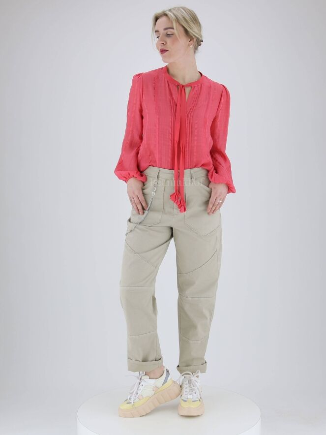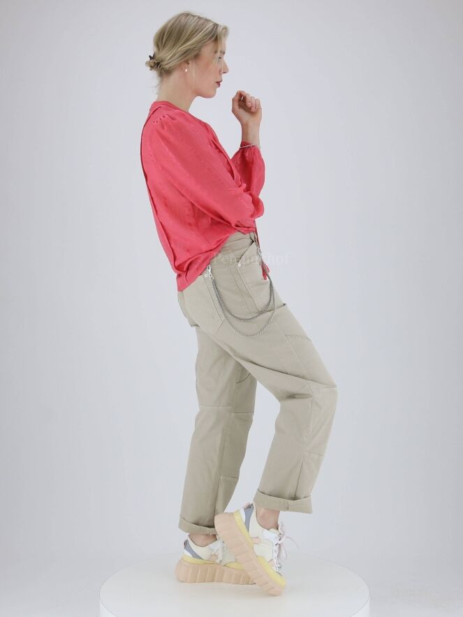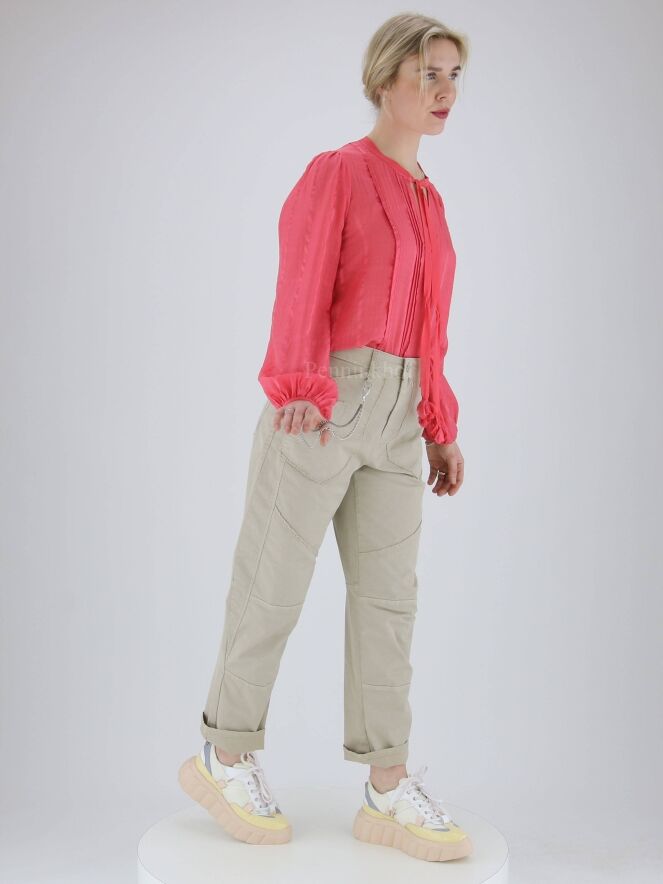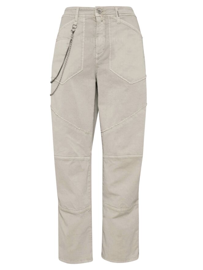 Eine sandfarbige Jeans der Designermarke High. Entlang der Kante der Eingriffstaschen befindet sich eine umgekehrte Steppnaht. Dieses Detail spiegelt sich in der Naht am Oberschenkel wider. Auf der rechten Seite verläuft eine doppelte silberfarbige Kette von der Gürtelschlaufe bis nach hinten. Diese Jeans kann bei 30 Grad gewaschen werden.