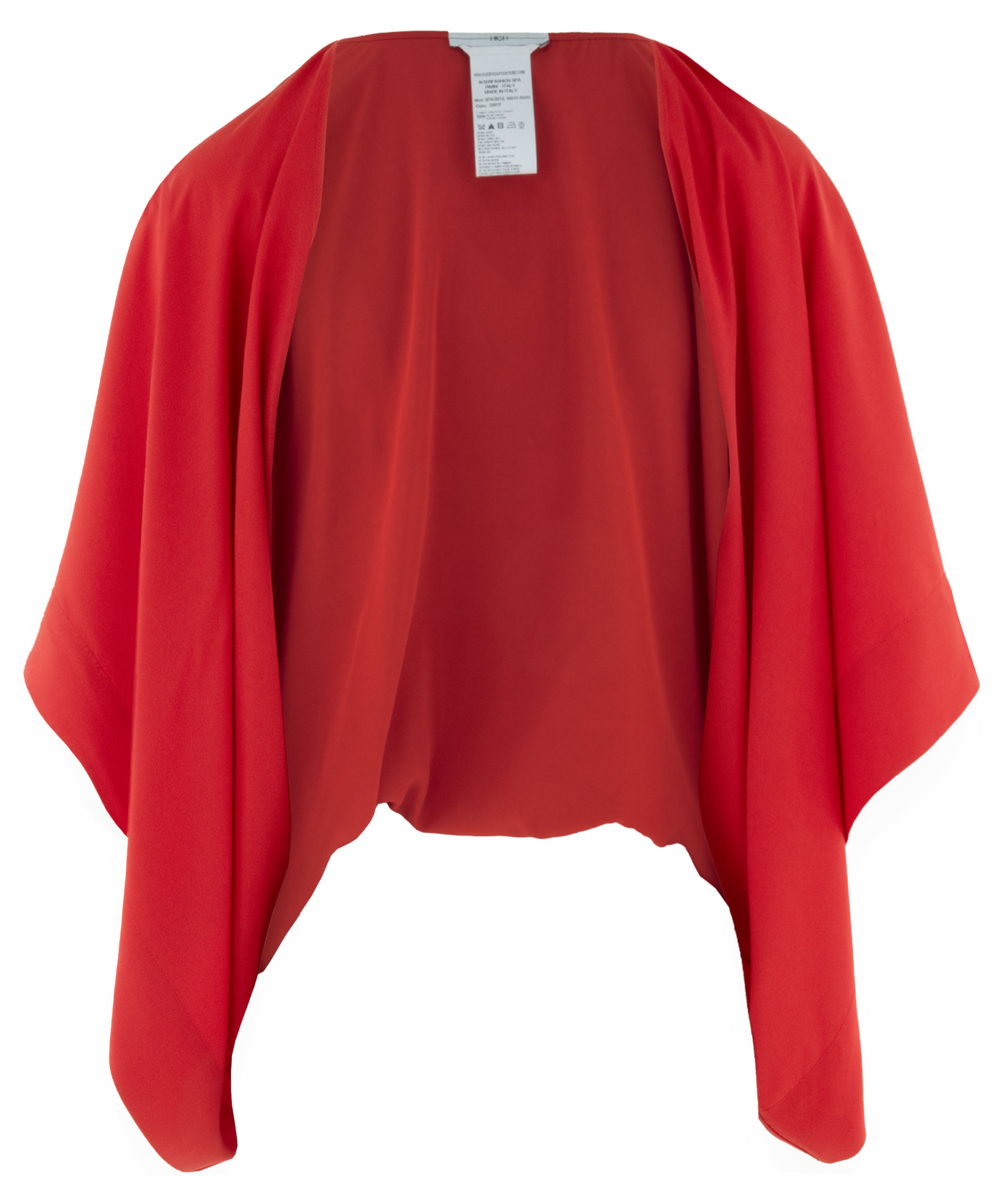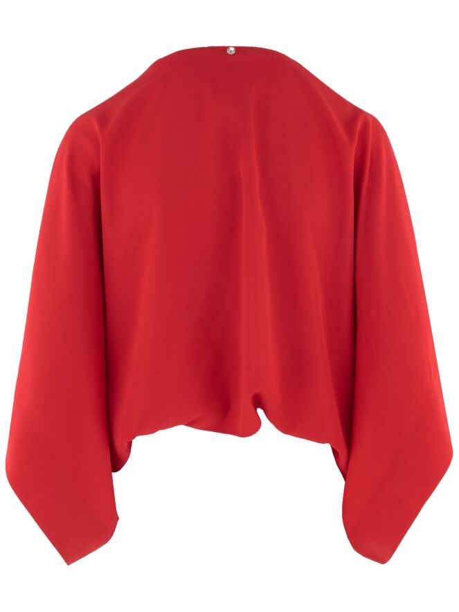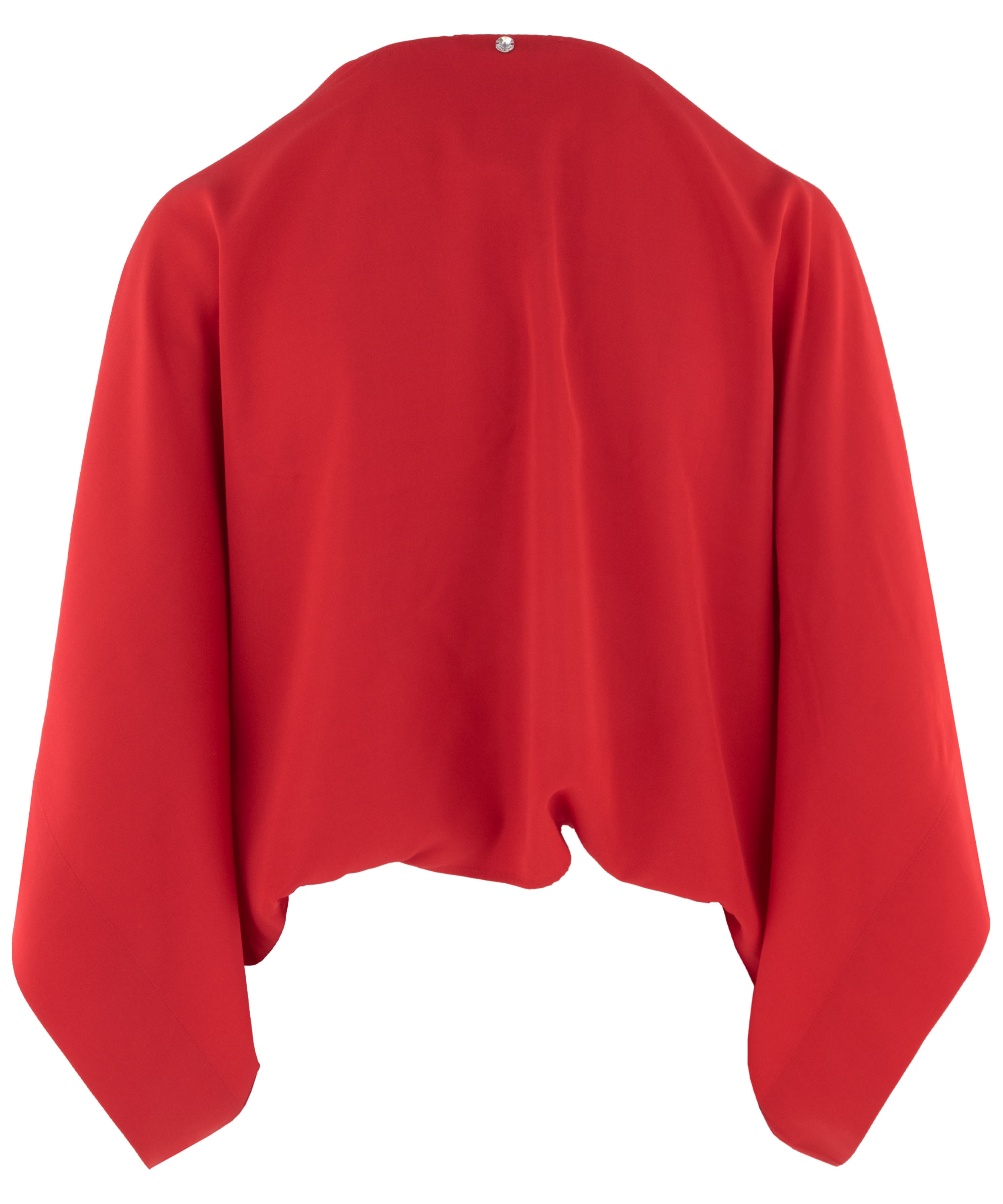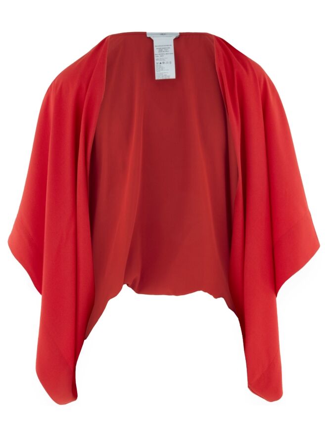 Bolero von High in einem leuchtenden Rotton. Mit Fledermausärmeln gestaltet, fällt der Stoff vom Halsausschnitt weich zu den Seiten und schafft eine elegante, fließende Silhouette. Dieser Bolero darf nicht gewaschen werden.