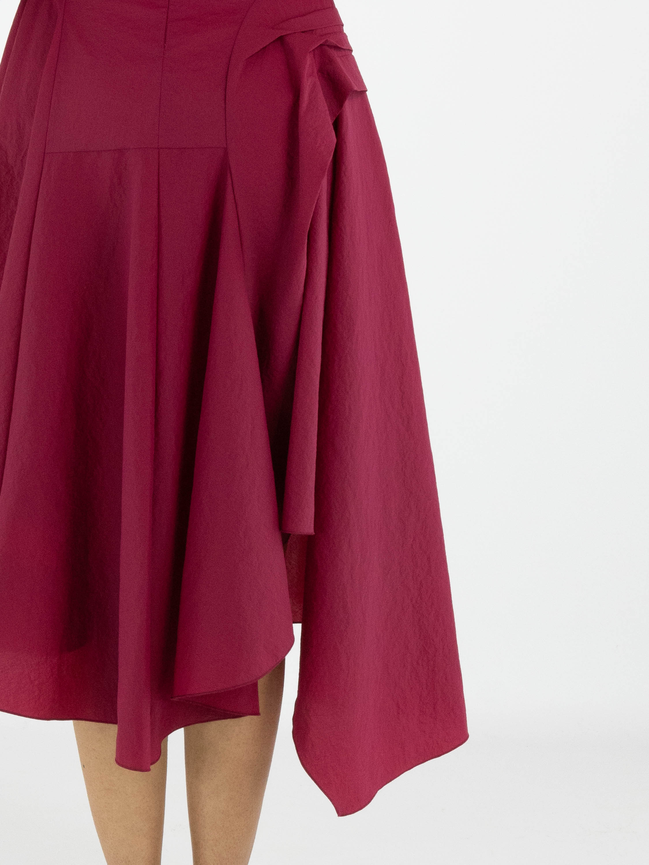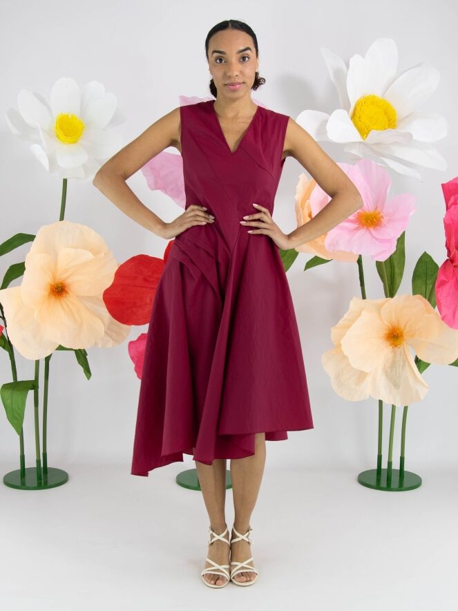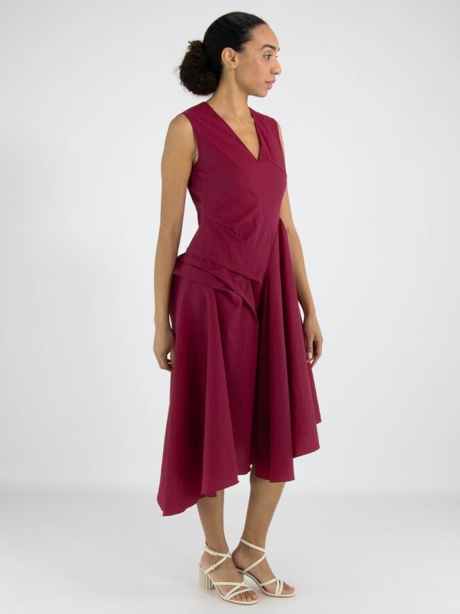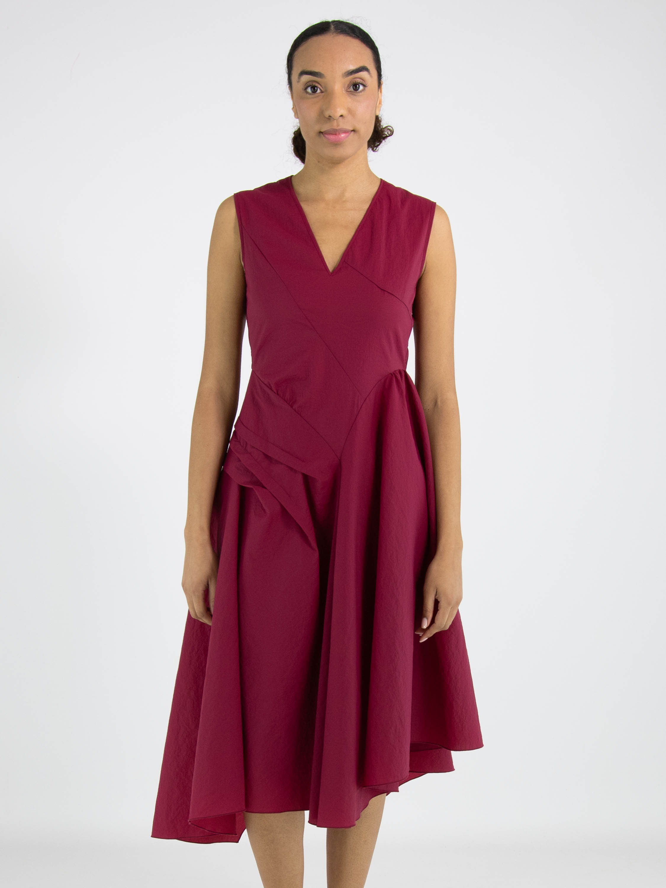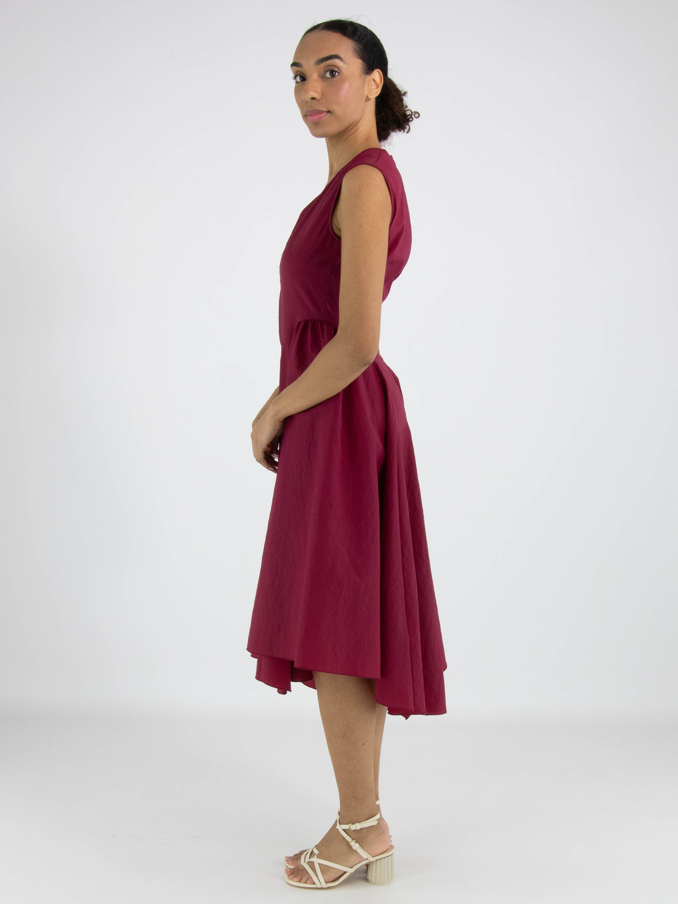 Ein Kleid von High Lab aus einem blickdichten Fallschirmstoff in Himbeerrot. Das Kleid hat einen V-Ausschnitt, von der linken Schulter verläuft eine diagonale Faltennaht zur rechten Taillenseite. Auf der linken Seite der Taille sind drei Plisseefalten eingearbeitet. Ab der Taille fällt das Kleid weit aus. Dieses Kleid kann bei 30 Grad gewaschen werden.
