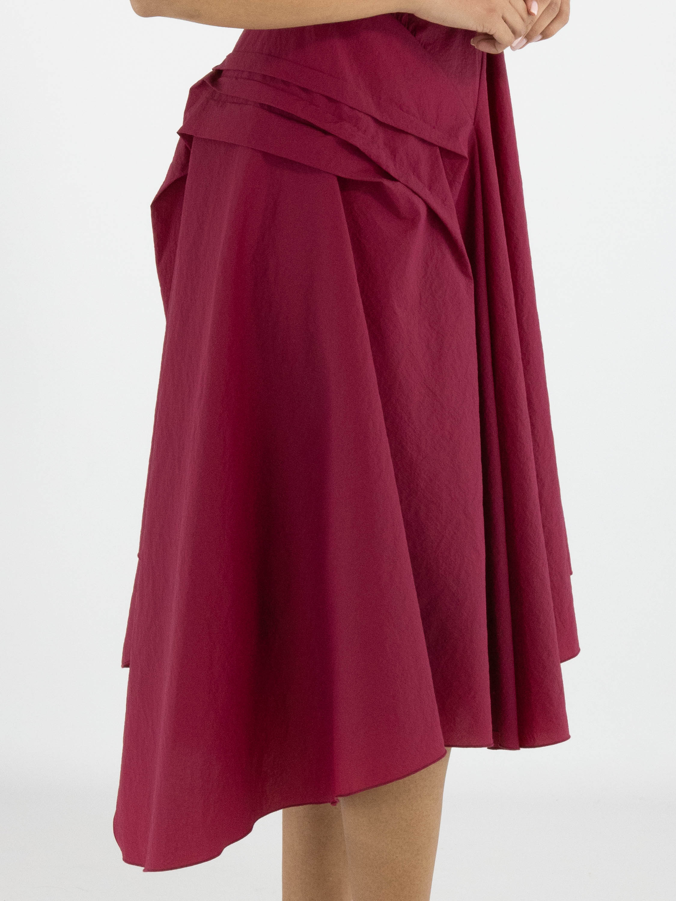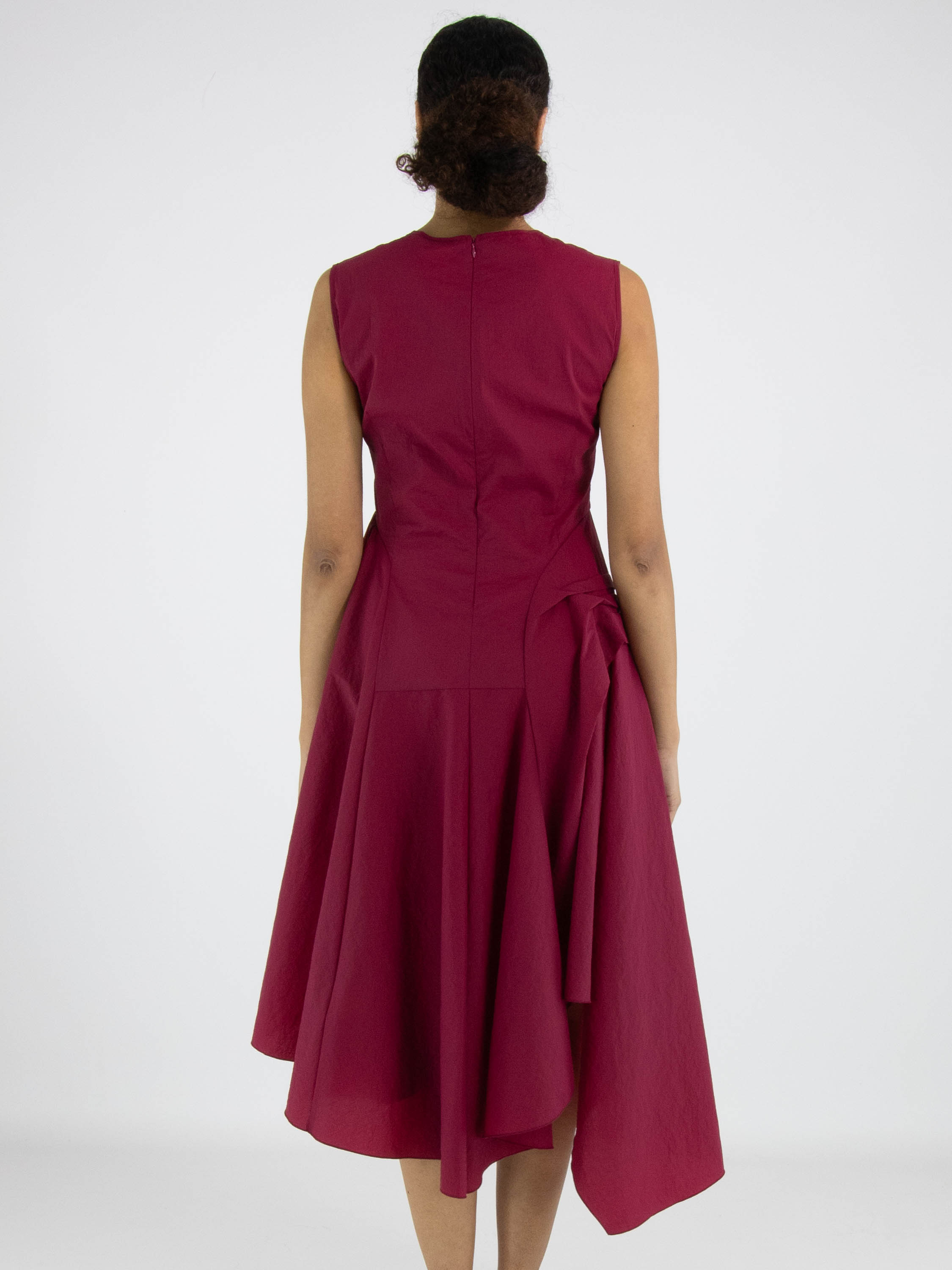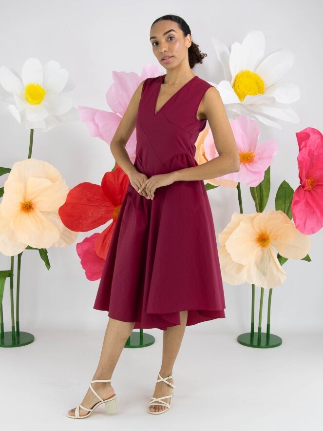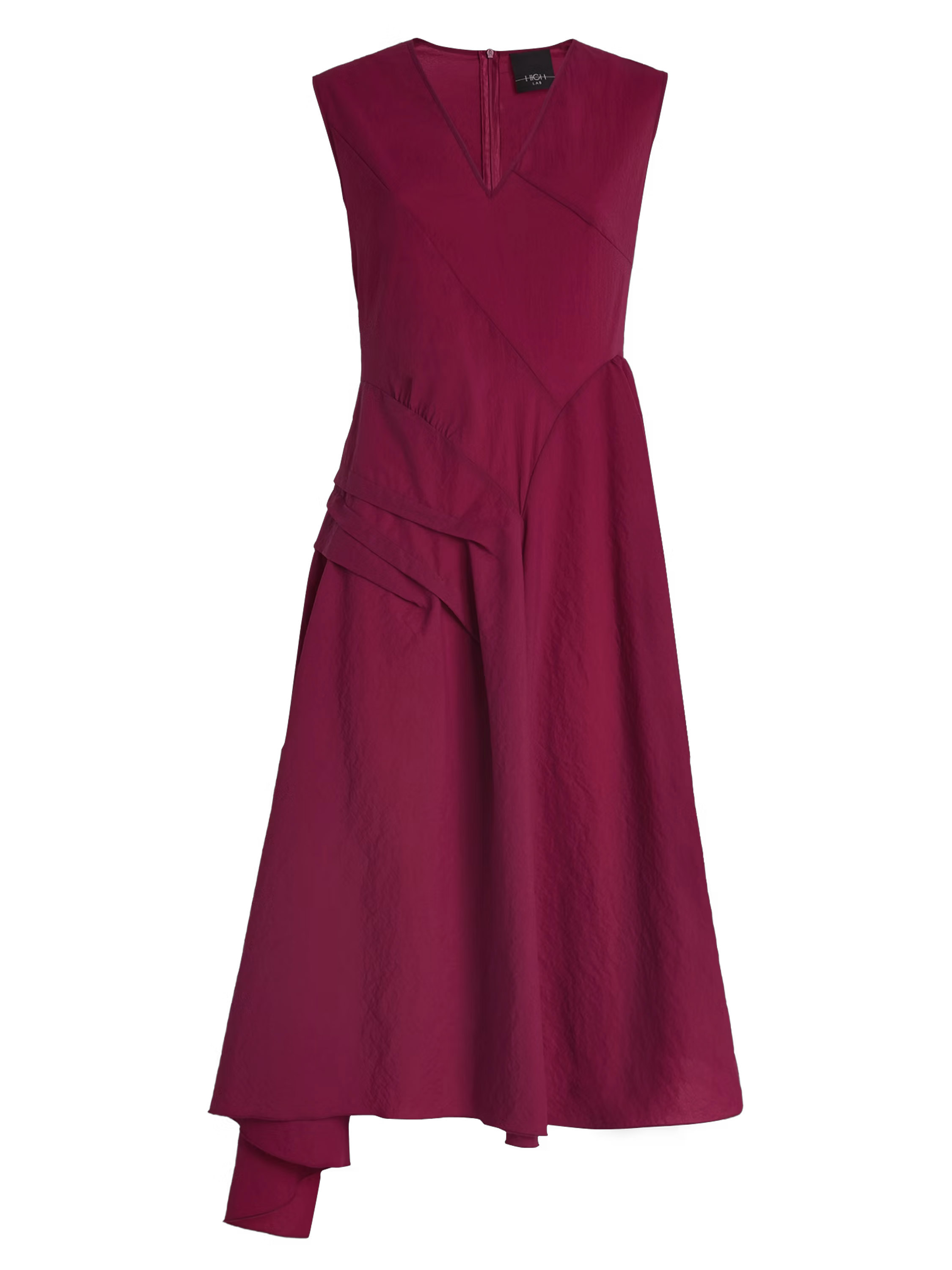 Ein Kleid von High Lab aus einem blickdichten Fallschirmstoff in Himbeerrot. Das Kleid hat einen V-Ausschnitt, von der linken Schulter verläuft eine diagonale Faltennaht zur rechten Taillenseite. Auf der linken Seite der Taille sind drei Plisseefalten eingearbeitet. Ab der Taille fällt das Kleid weit aus. Dieses Kleid kann bei 30 Grad gewaschen werden.