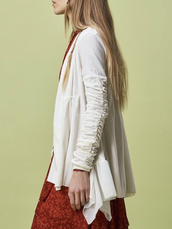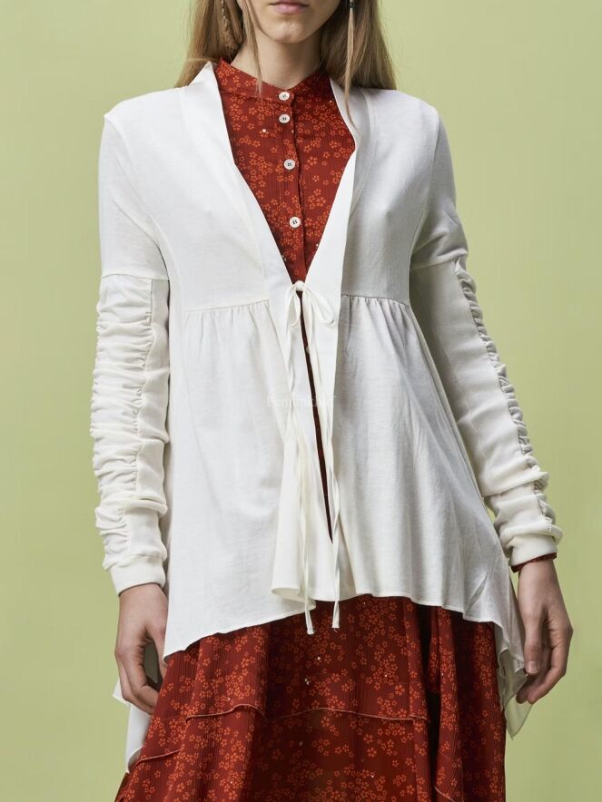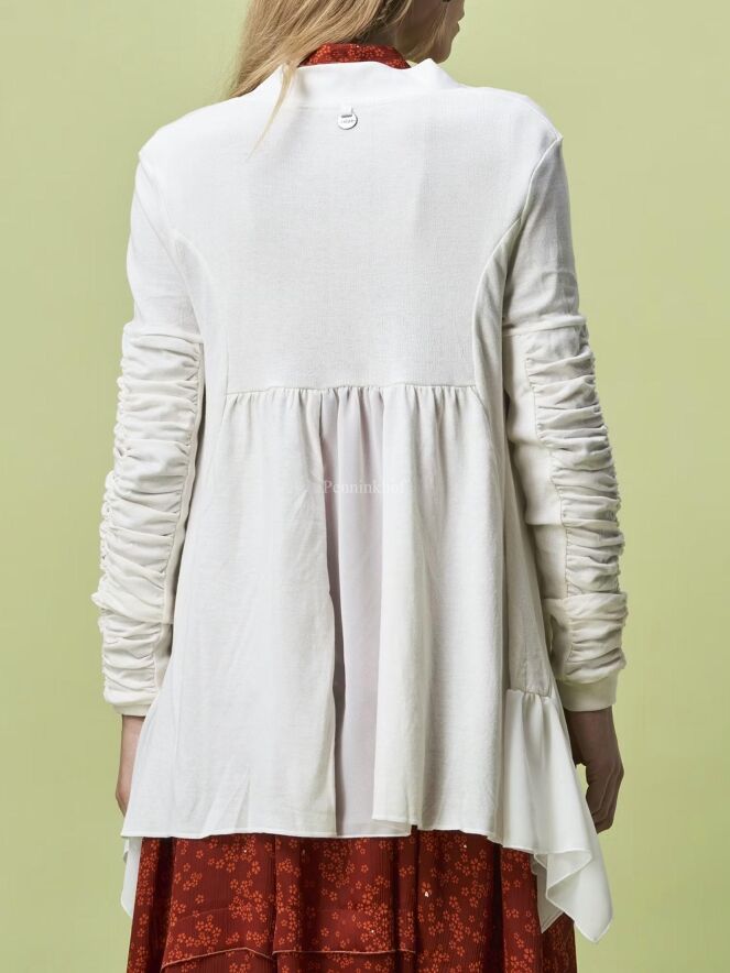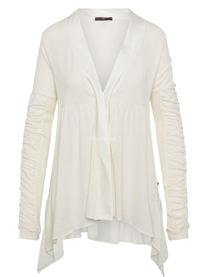 Strickjacke von High in cremeweißer Farbe. Auf Höhe der Taille ist eine Naht genäht, von der aus der Stoff zart gefältelt ist. Der Verschluss erfolgt mit einem Kordelzug. Der obere Teil der langen Ärmel ist in Falten gelegt. Diese Strickjacke kann mit der Hand gewaschen werden.
