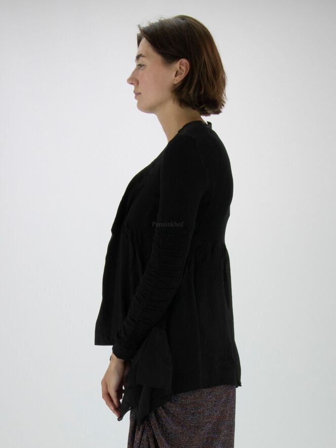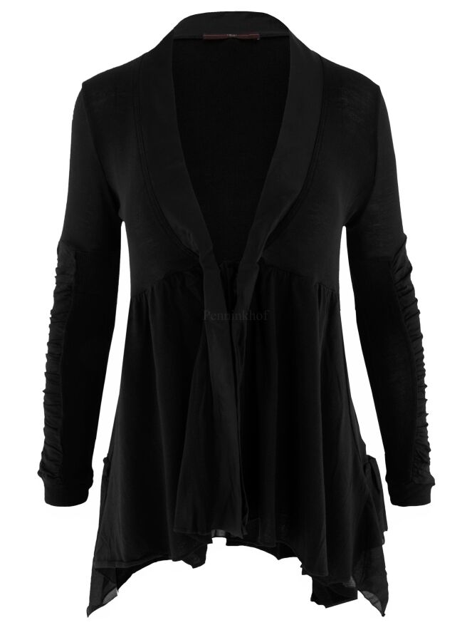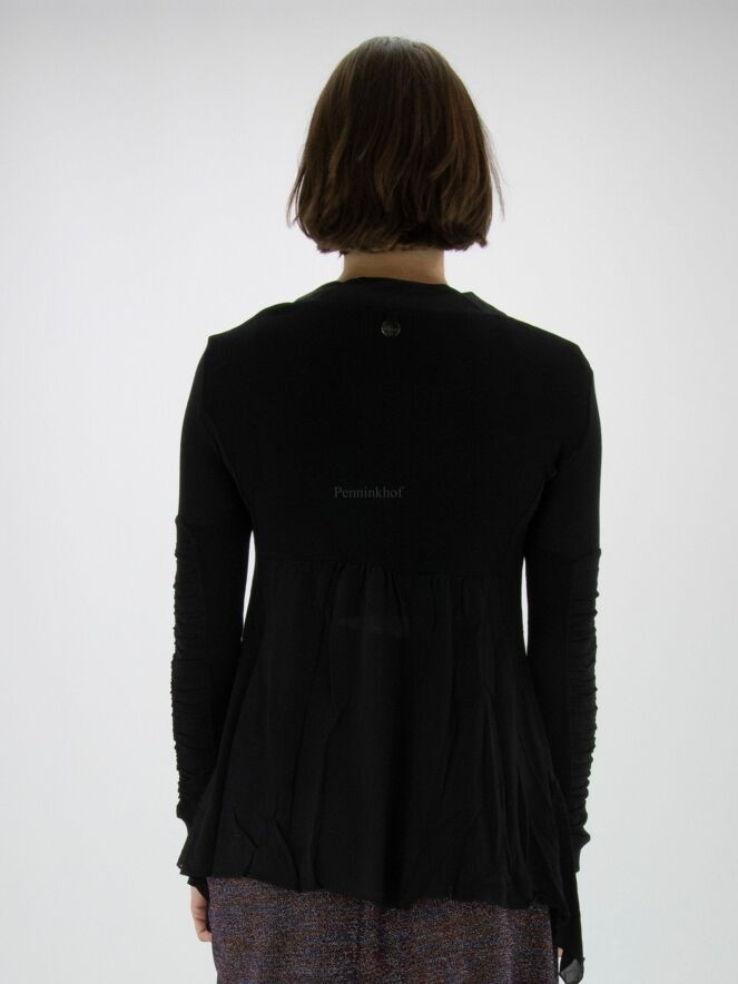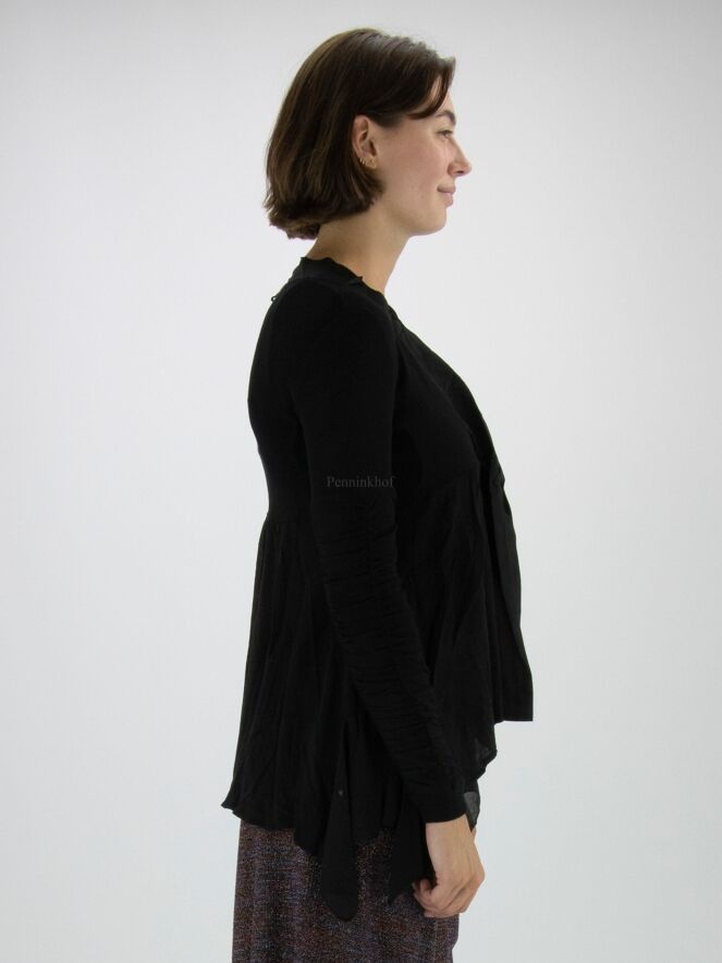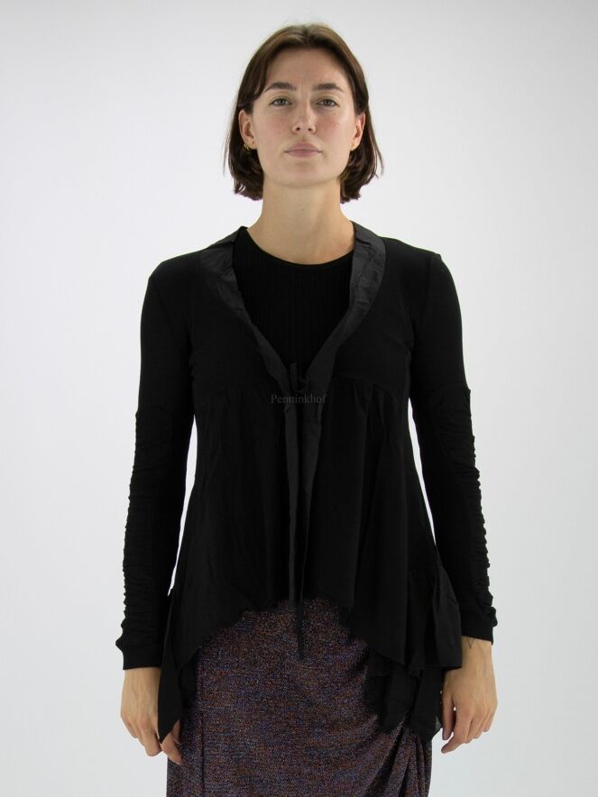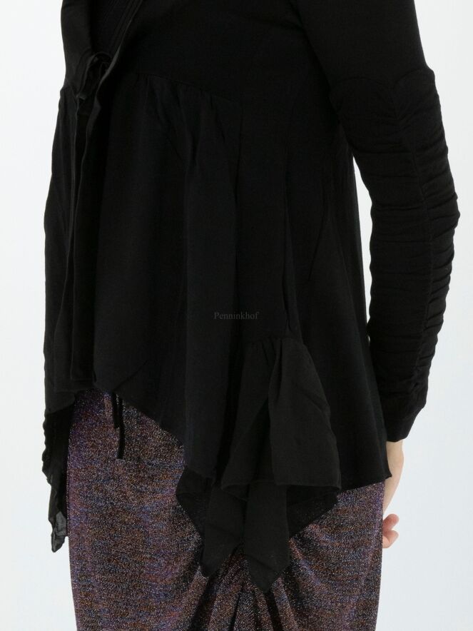 Ein schwarzer Cardigan aus Feinripp der Designermarke High. Entlang des V-Ausschnitts befindet sich eine matte Satinpaspel. Unter der Brust ist der Cardigan abgesteppt, worunter das Gewebe fein plissiert ist. Der Verschluss erfolgt mit einer Kordel. Unten befindet sich auf beiden Seiten ein Voile-Stoff. Die langen Ärmel bestehen aus zwei Stoffen, von denen der eine fein gerippt und der andere zart plissiert ist. Dieser Cardigan kann von Hand gewaschen werden.
