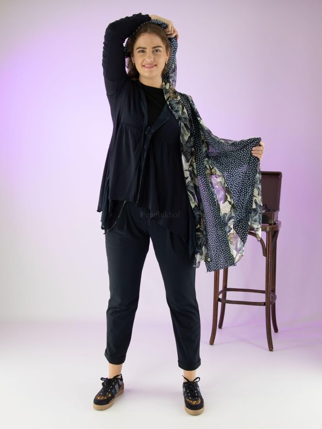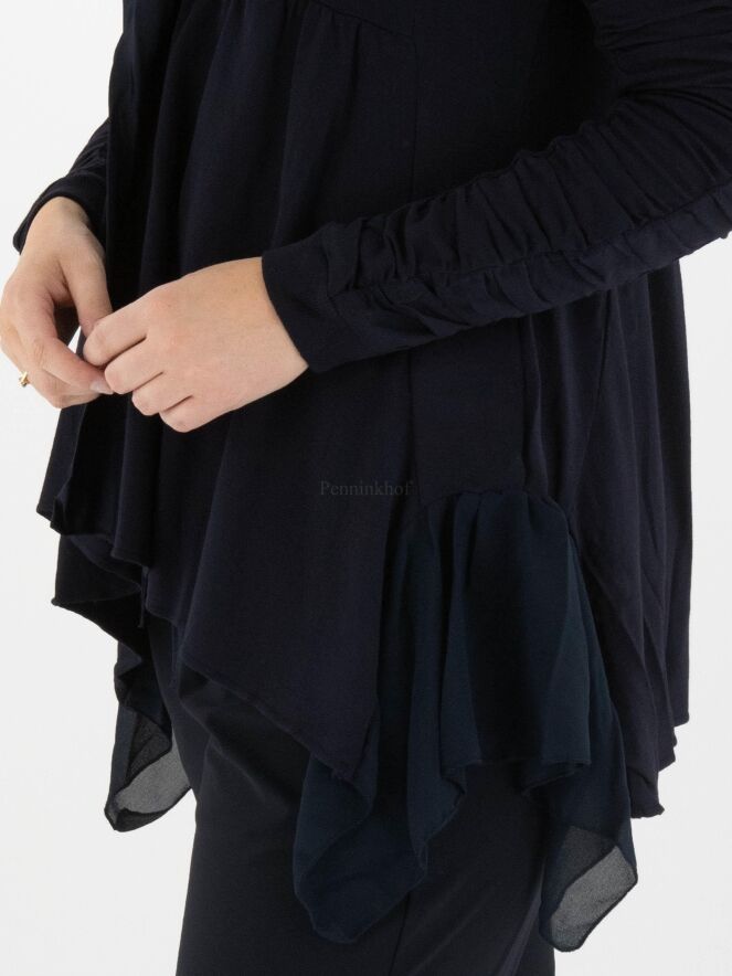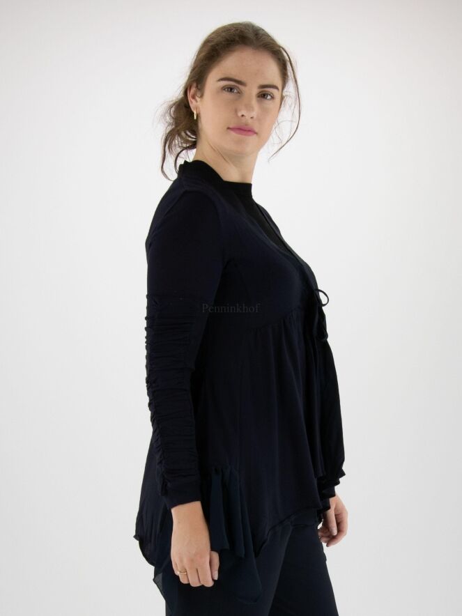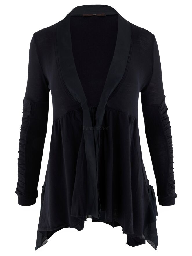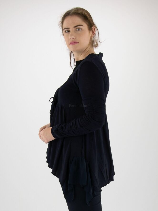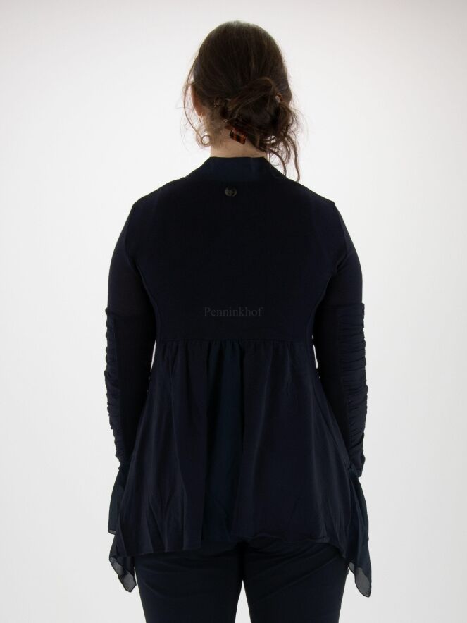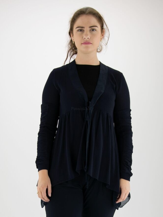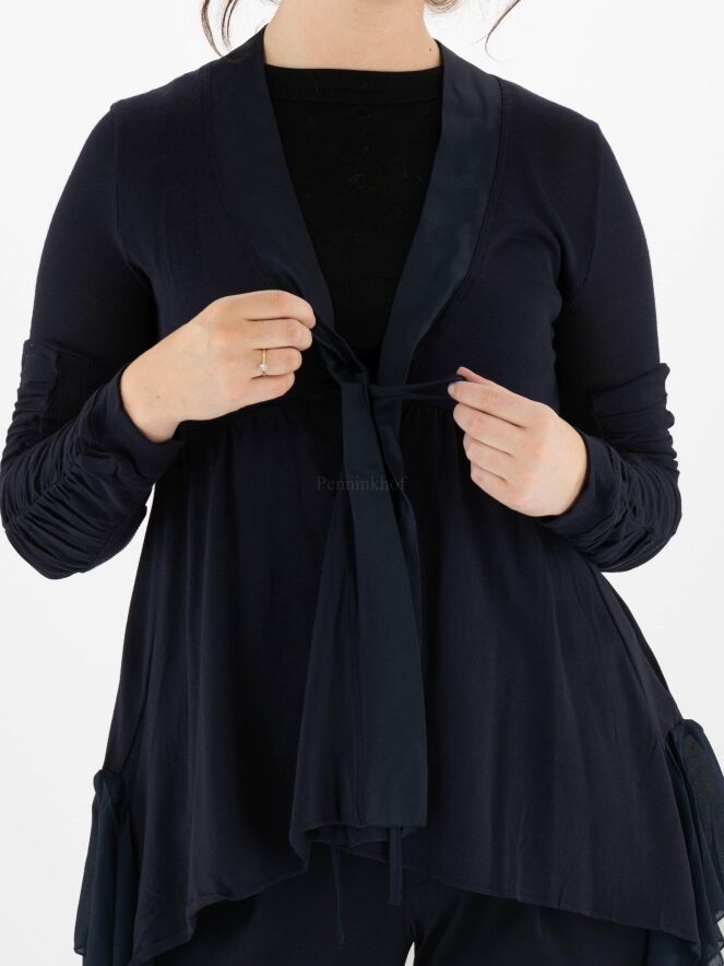 Ein marineblauer Cardigan aus Feinripp der Designermarke High. Entlang des V-Ausschnitts befindet sich eine matte Satinpaspel. Unter der Brust ist der Cardigan abgesteppt, worunter das Gewebe fein plissiert ist. Der Verschluss erfolgt mit einer Kordel. Unten befindet sich auf beiden Seiten ein Voile-Stoff. Die langen Ärmel bestehen aus zwei Stoffen, von denen der eine fein gerippt und der andere zart plissiert ist. Dieser Cardigan kann von Hand gewaschen werden.
