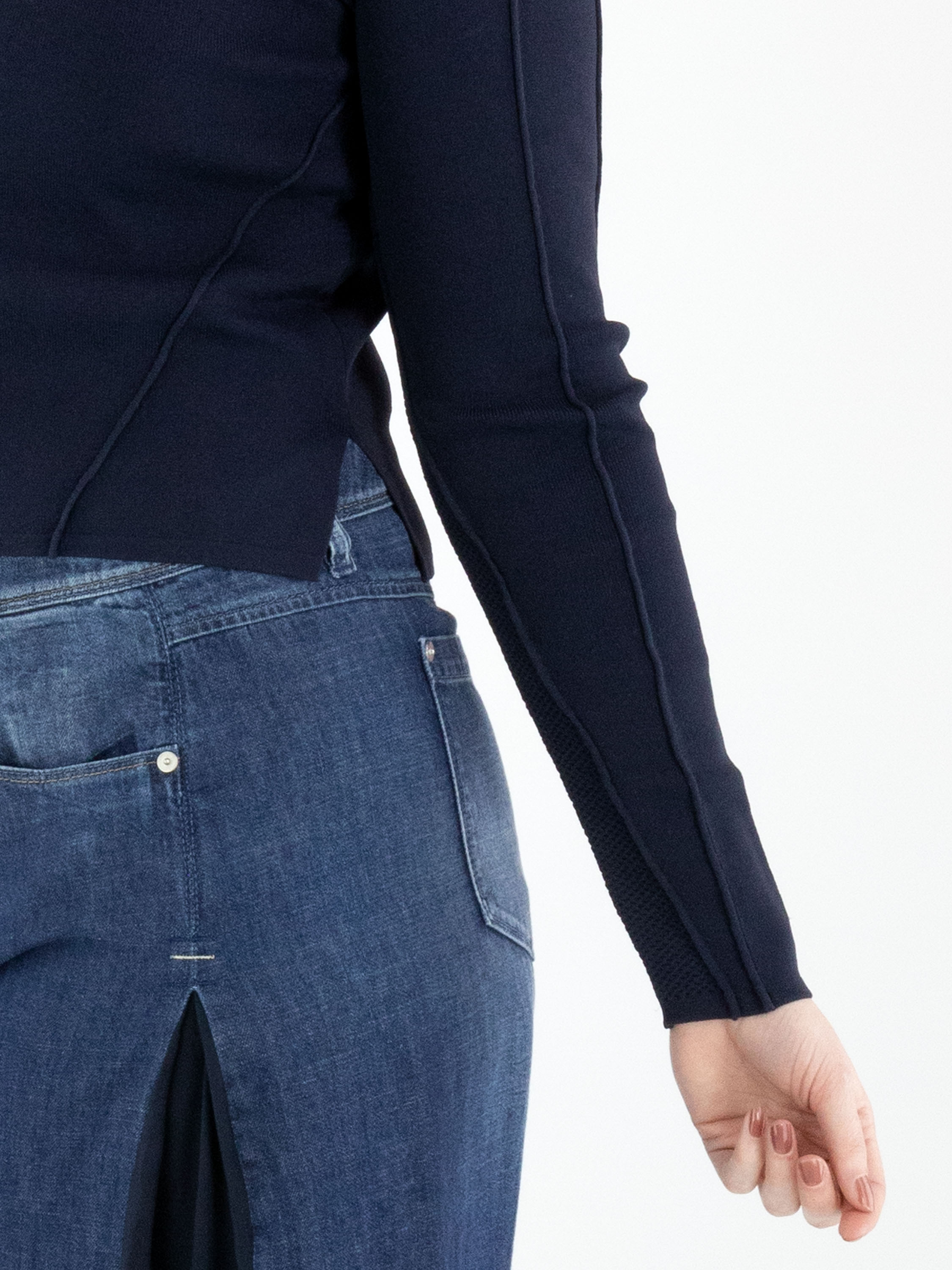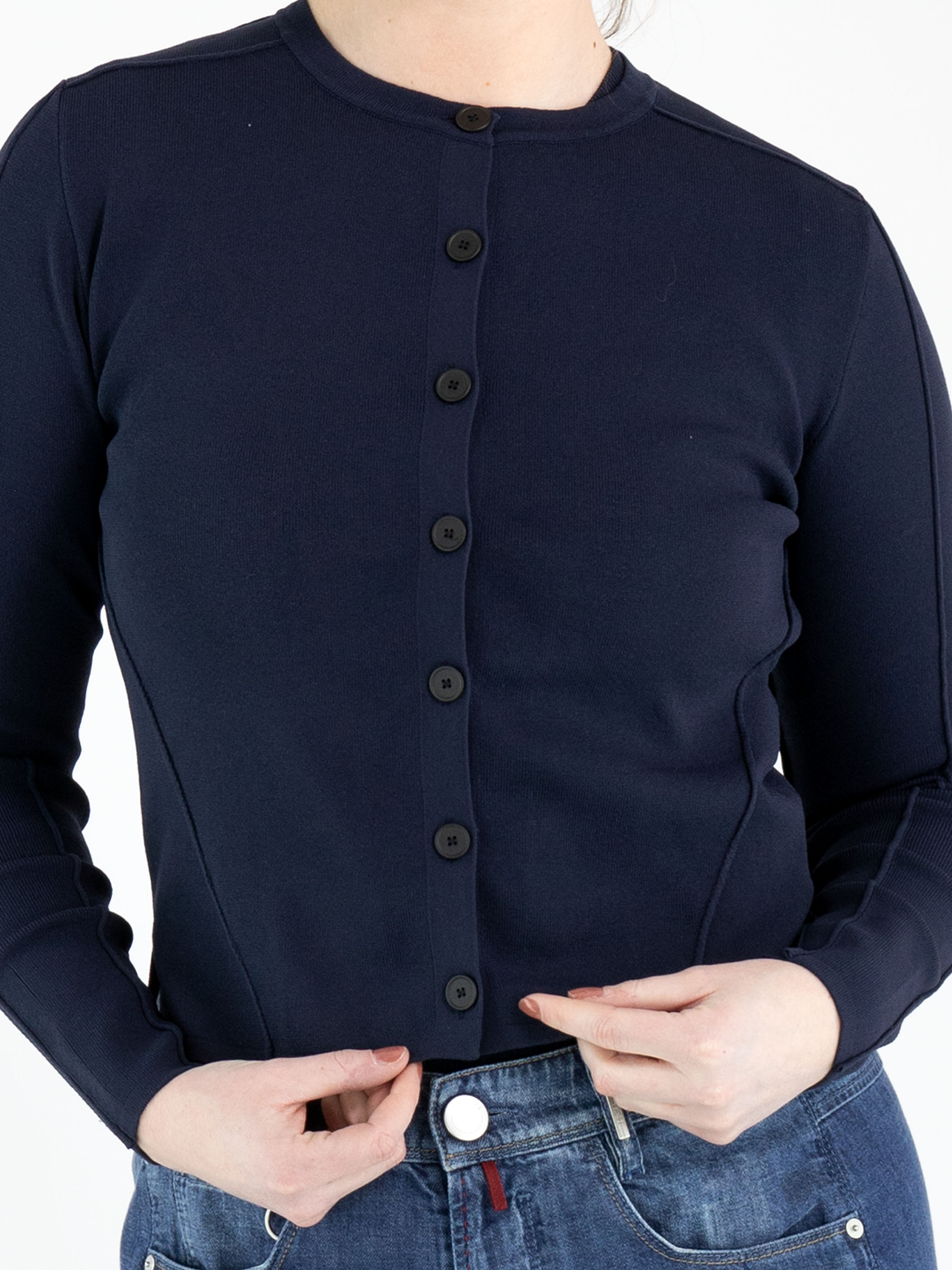 Eine kurze Strickjacke von High in Marineblau. Der Stoff ist fein gerippt. Die Strickjacke hat eine Knopfleiste mit sieben marineblauen Knöpfen. Der untere Teil der langen Ärmel ist aus einem perforierten Stoff gearbeitet. Diese Struktur setzt sich als breites Band auf der Rückseite fort. Diese Strickjacke kann per Hand gewaschen werden.