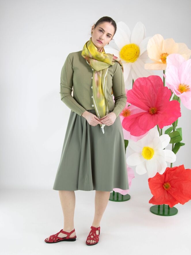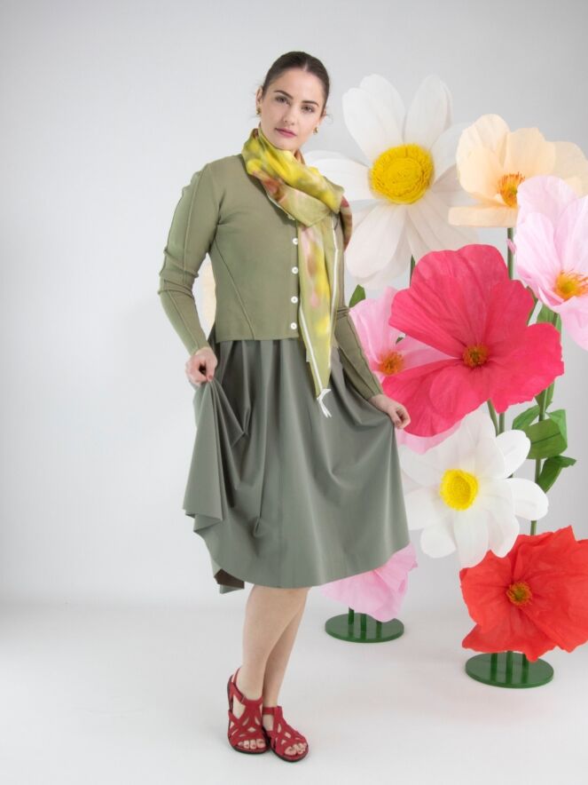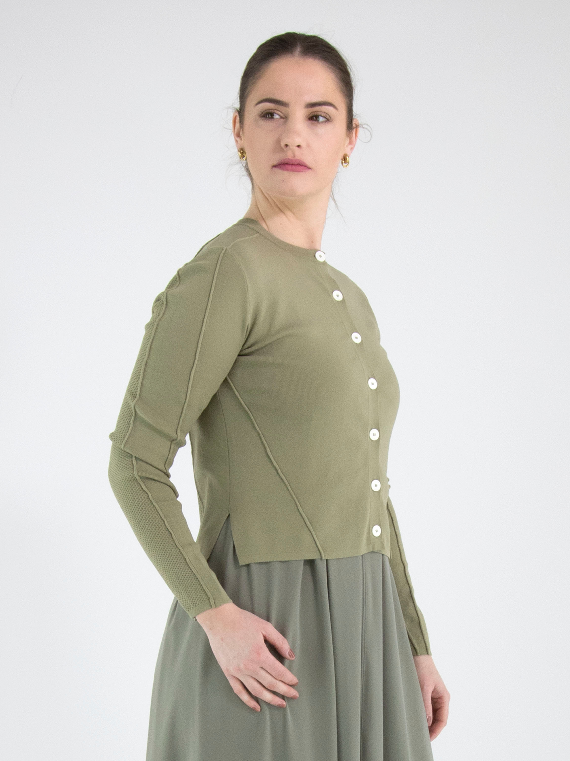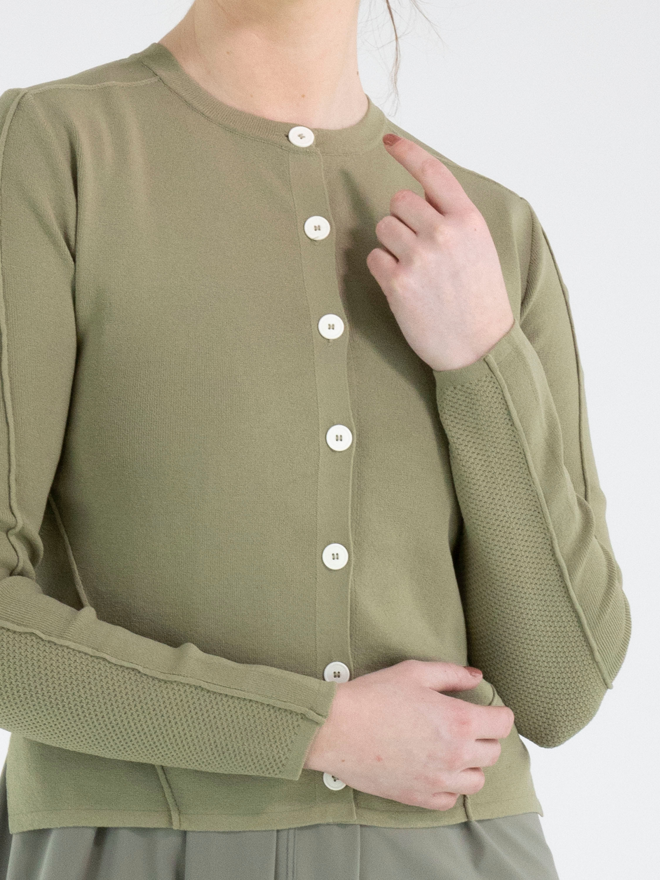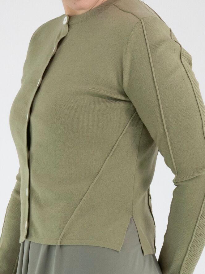 Eine kurze Strickjacke von High in Olivgrün. Der Stoff ist in einer fein gerippten Struktur gearbeitet. Die Strickjacke hat einen Knopfverschluss mit sieben cremeweißen Knöpfen. Der untere Teil der langen Ärmel ist aus einem perforierten Stoff gefertigt. Diese Struktur setzt sich in einem breiten Band auf der Rückseite fort. Diese Strickjacke kann per Hand gewaschen werden.