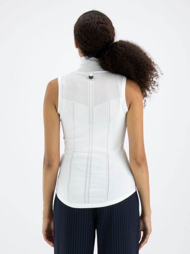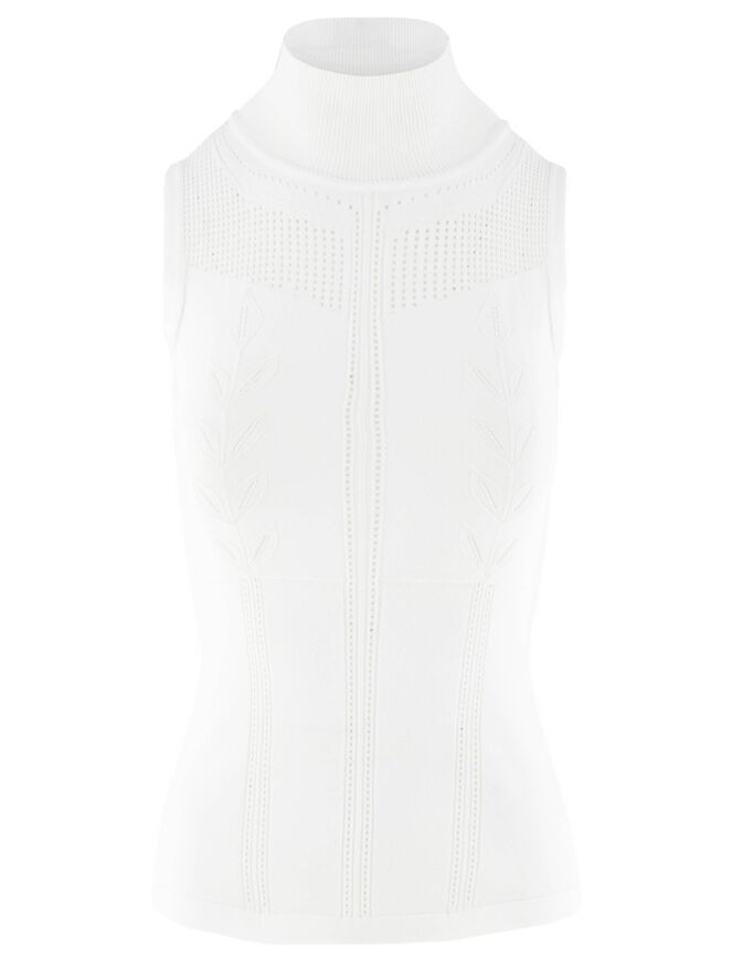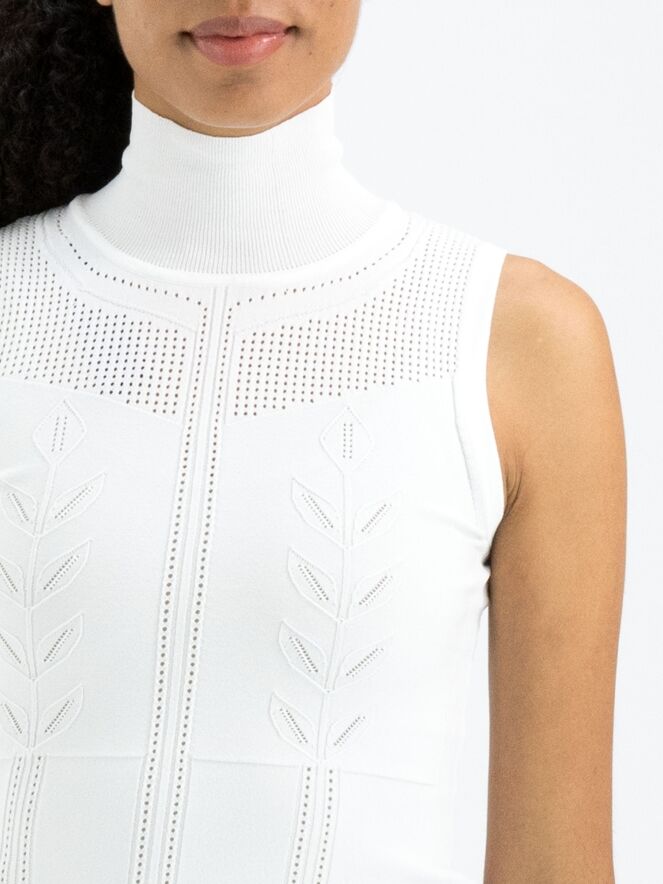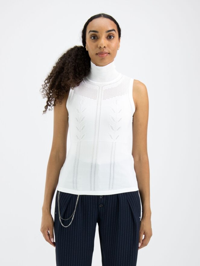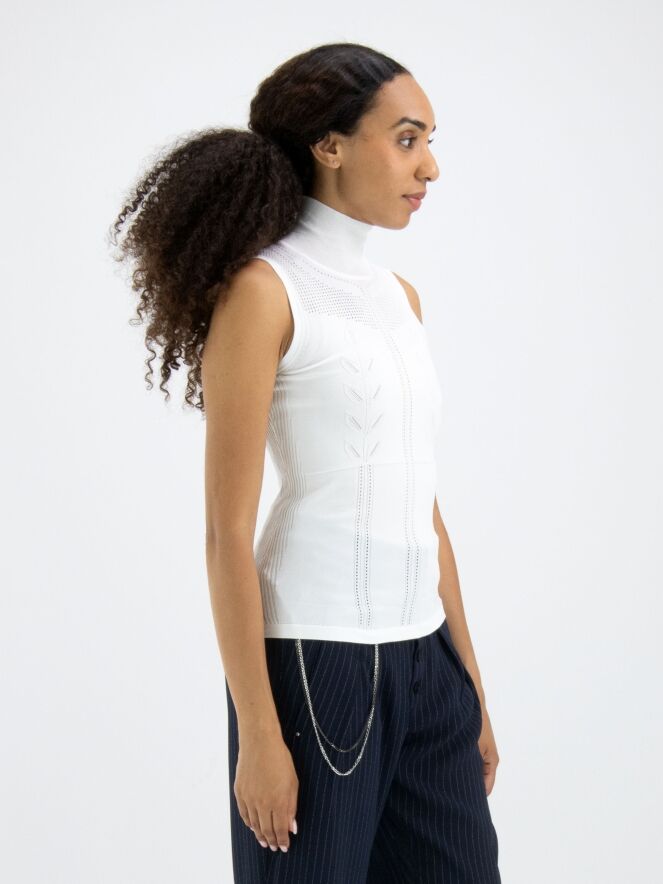 Ein Top von High in Cremeweiß. Das Top hat einen Rollkragen mit fein geripptem Strickbündchen. Vom Hals bis zur Brust ist der Stoff perforiert. Von der Brust bis zur Taille hat der Stoff ein Blättermuster mit diagonalen Ajourlinien. Ab der Taille gibt es einige vertikale Ajourlinien im Stoff. Auf der Rückseite beginnen direkt aus dem perforierten Stoff die vertikalen Ajourlinien. Dieses Top kann von Hand gewaschen werden.