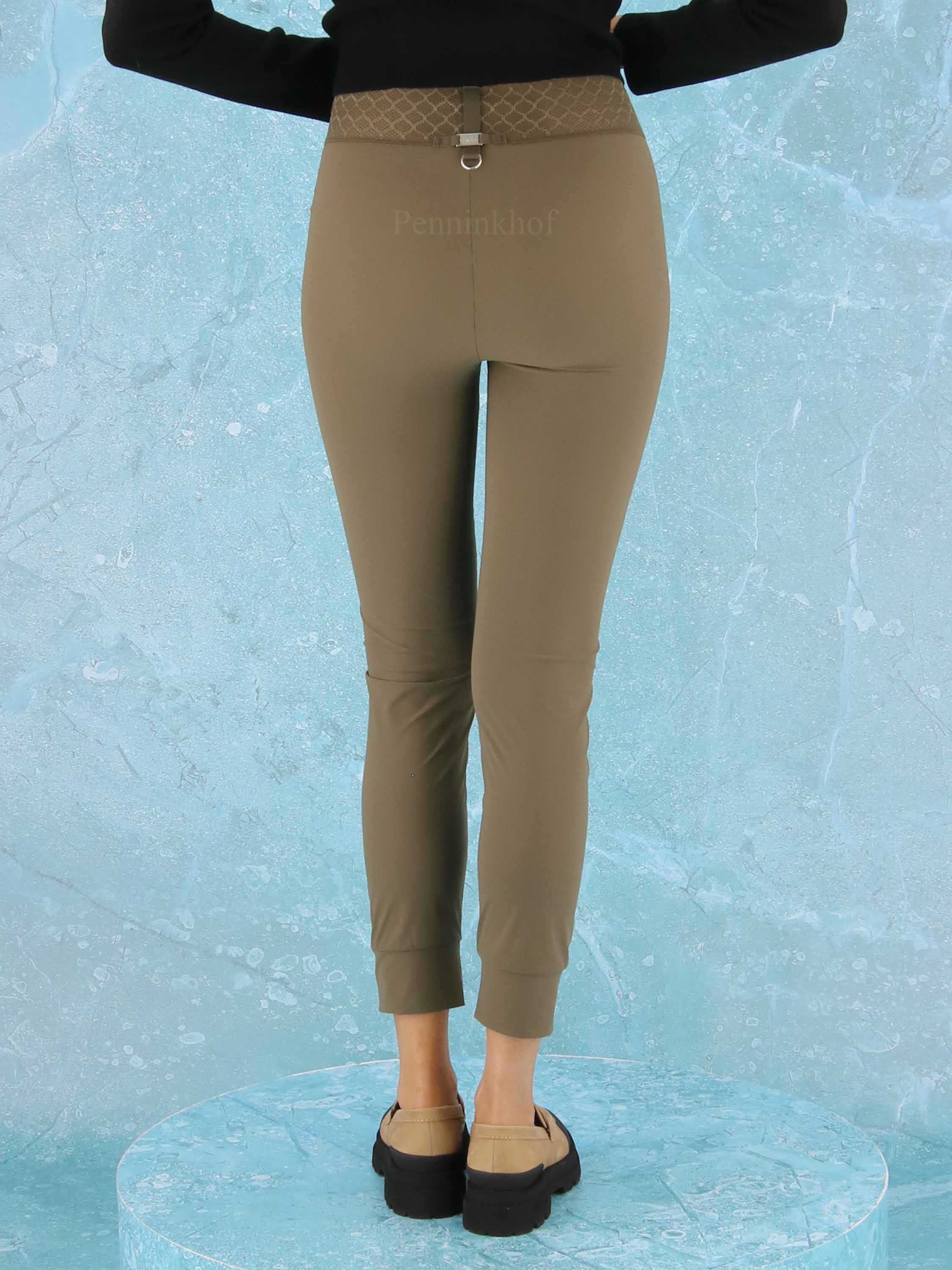 Eine olivgrüne Leggins der Designermarke High. Der breite, dehnbare Bund kommt in einer Netzstruktur. Diese Leggins kann bei 30 Grad gewaschen werden.