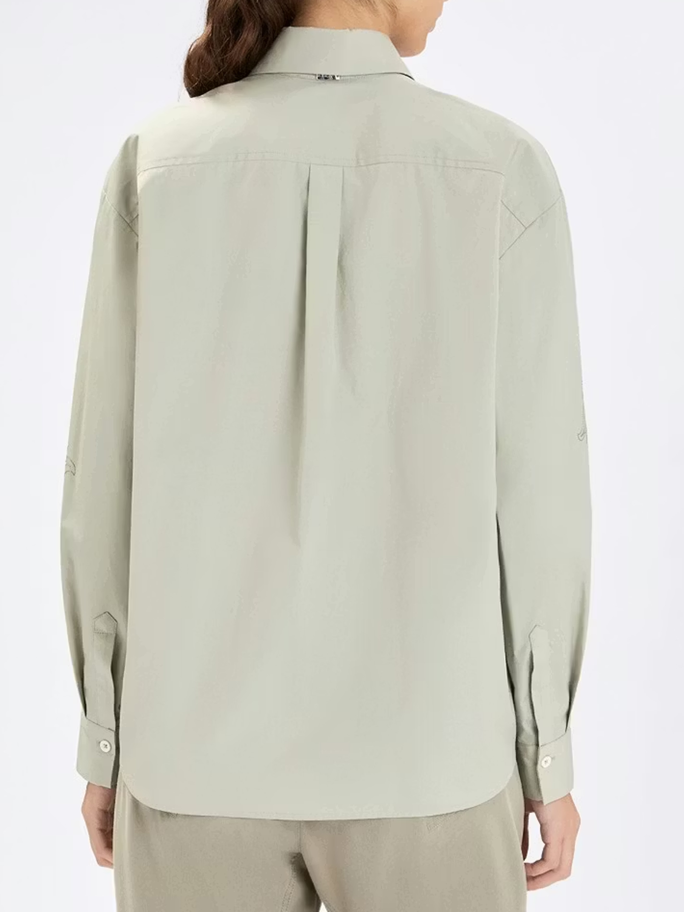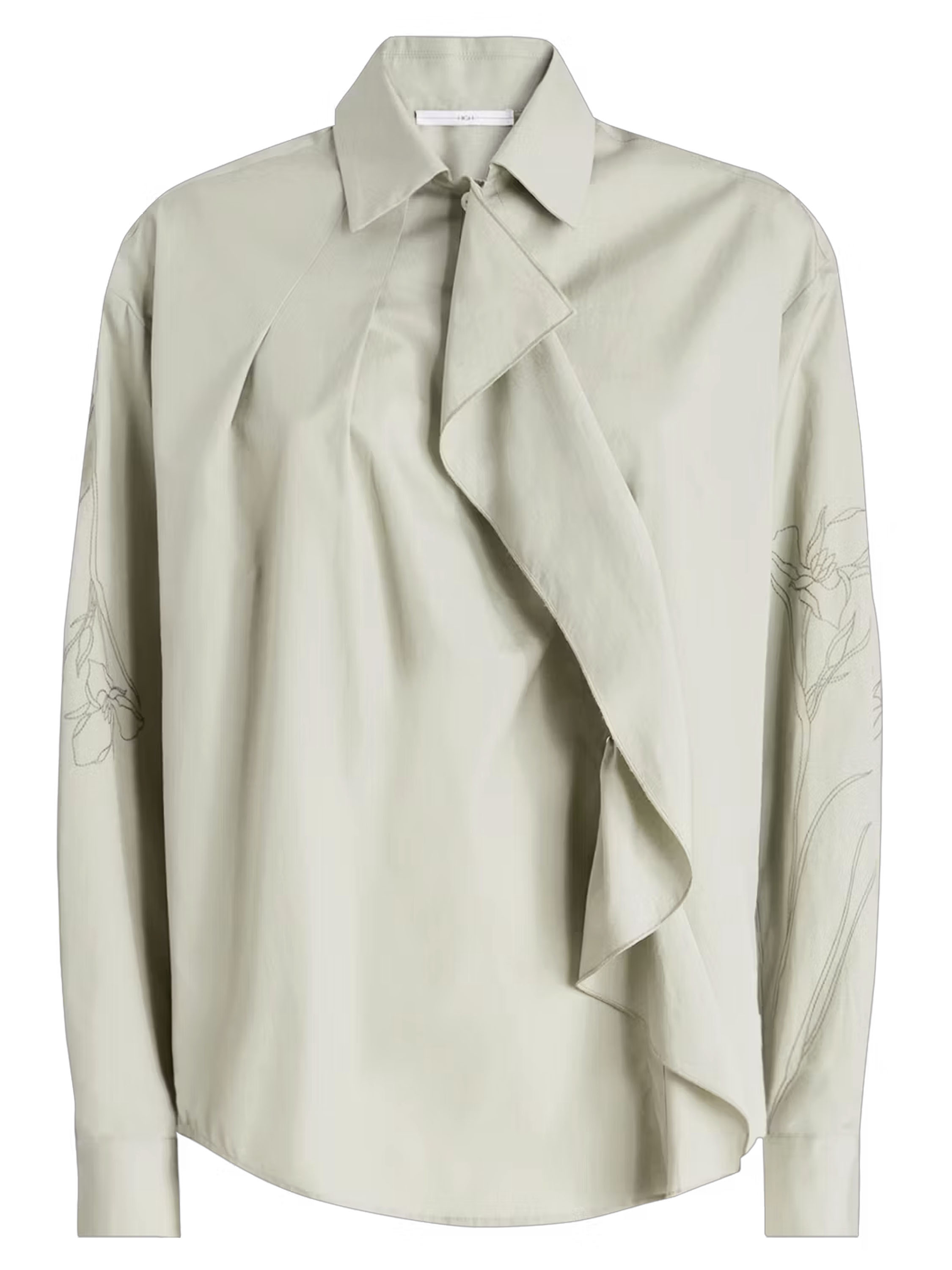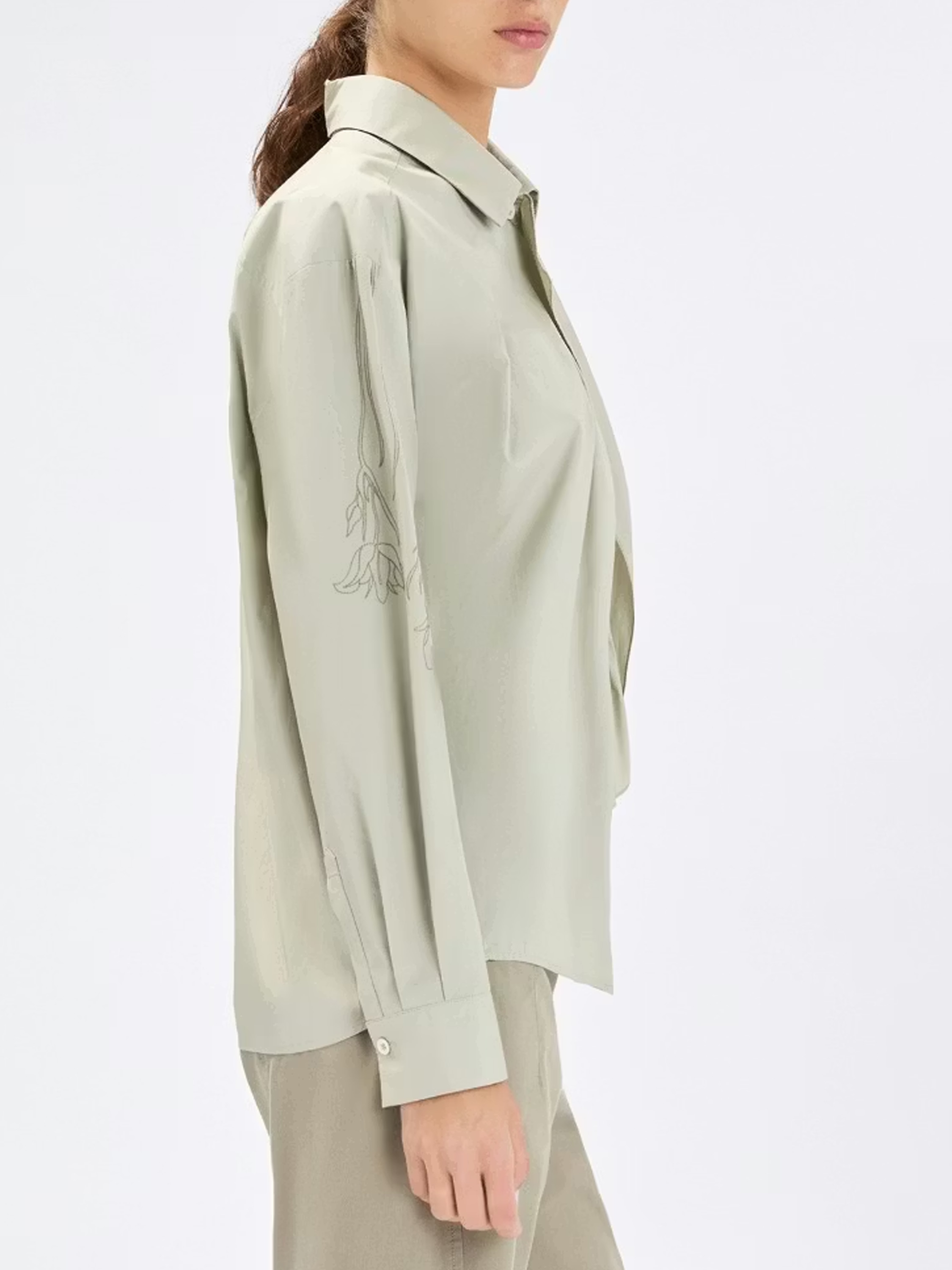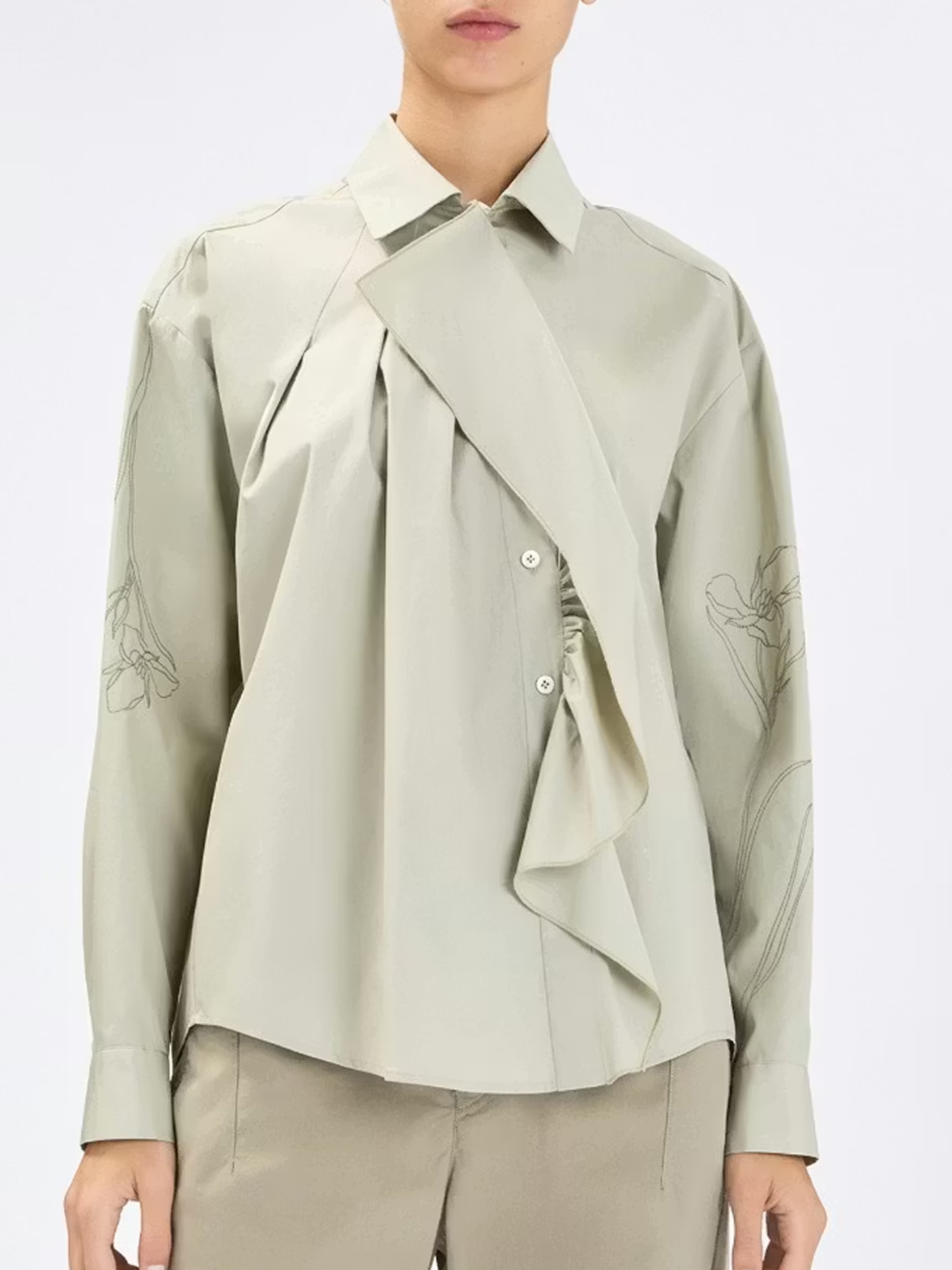 Eine Bluse von High in pastellfarbenem Olivgrün. Vom hinteren Halsausschnitt verlaufen zwei Plisseefalten diagonal nach unten sowie eine Volantkante entlang der Knopfleiste. Auf den langen Ärmeln sind dekorative Blumen mit sandfarbenem Garn aufgestickt. Diese Bluse kann per Hand gewaschen werden.
