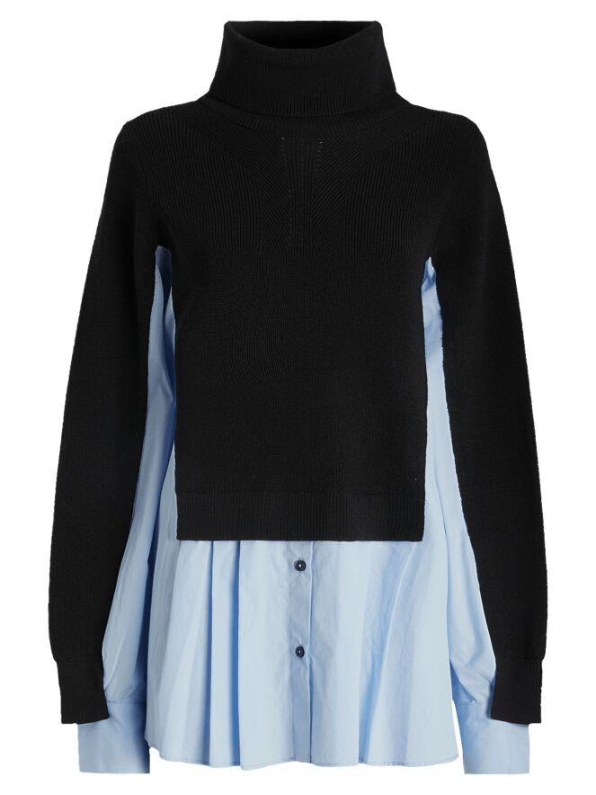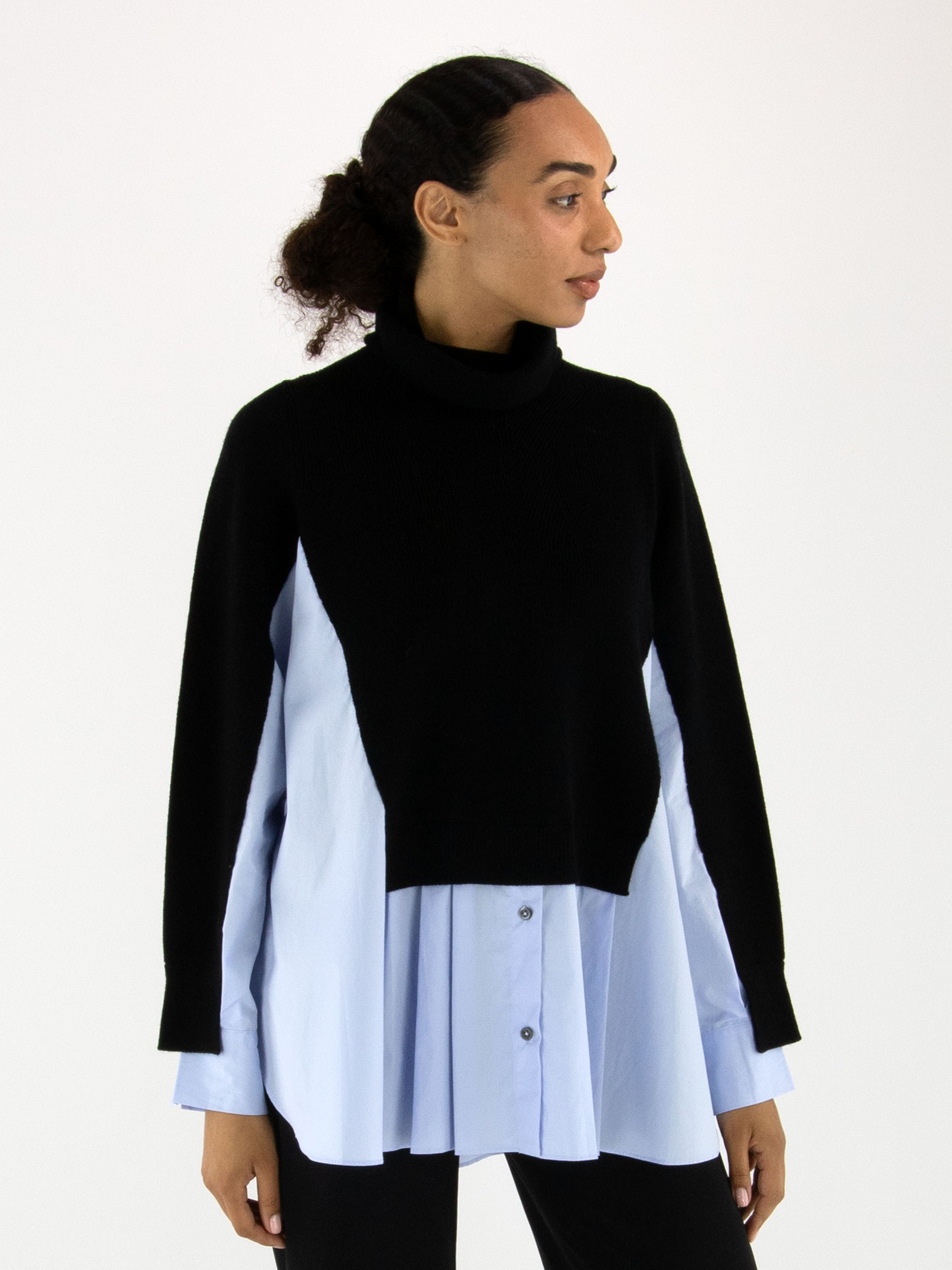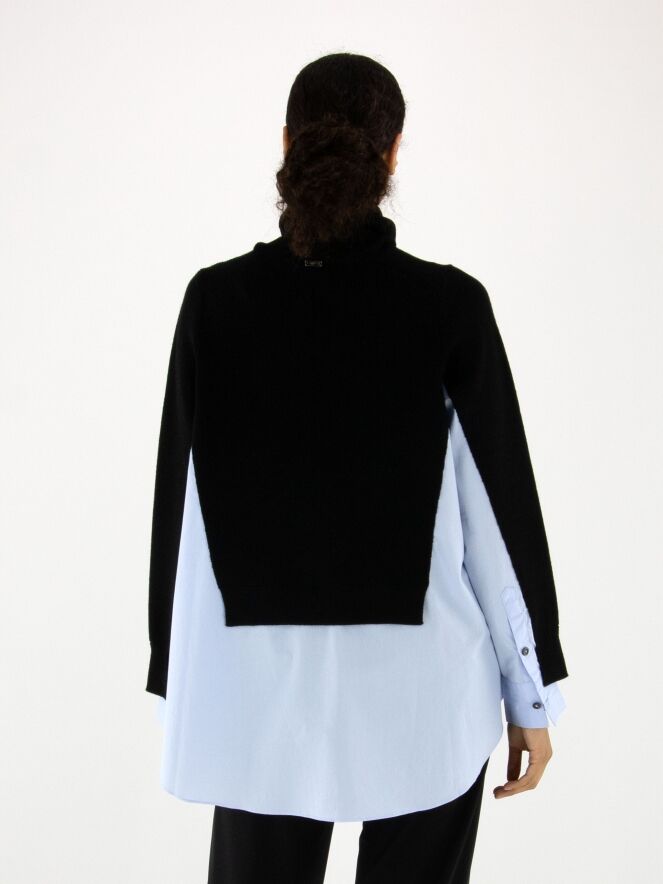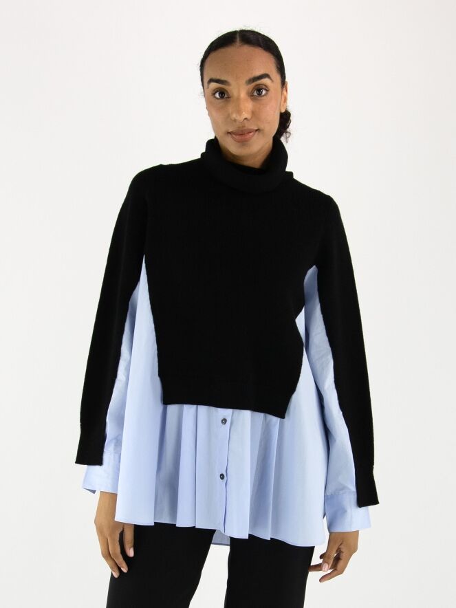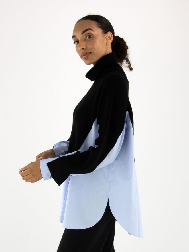 Pullover von High in Marineblau mit Blusen-Optik ab der Taille bis zu den Seiten und am unteren Teil der Ärmel. Der Bluseneinsatz ist aus einem hellblauen Stoff aus 100 % Baumwolle gefertigt. Der Pullover hat einen Rollkragen und sollte von Hand gewaschen werden.
