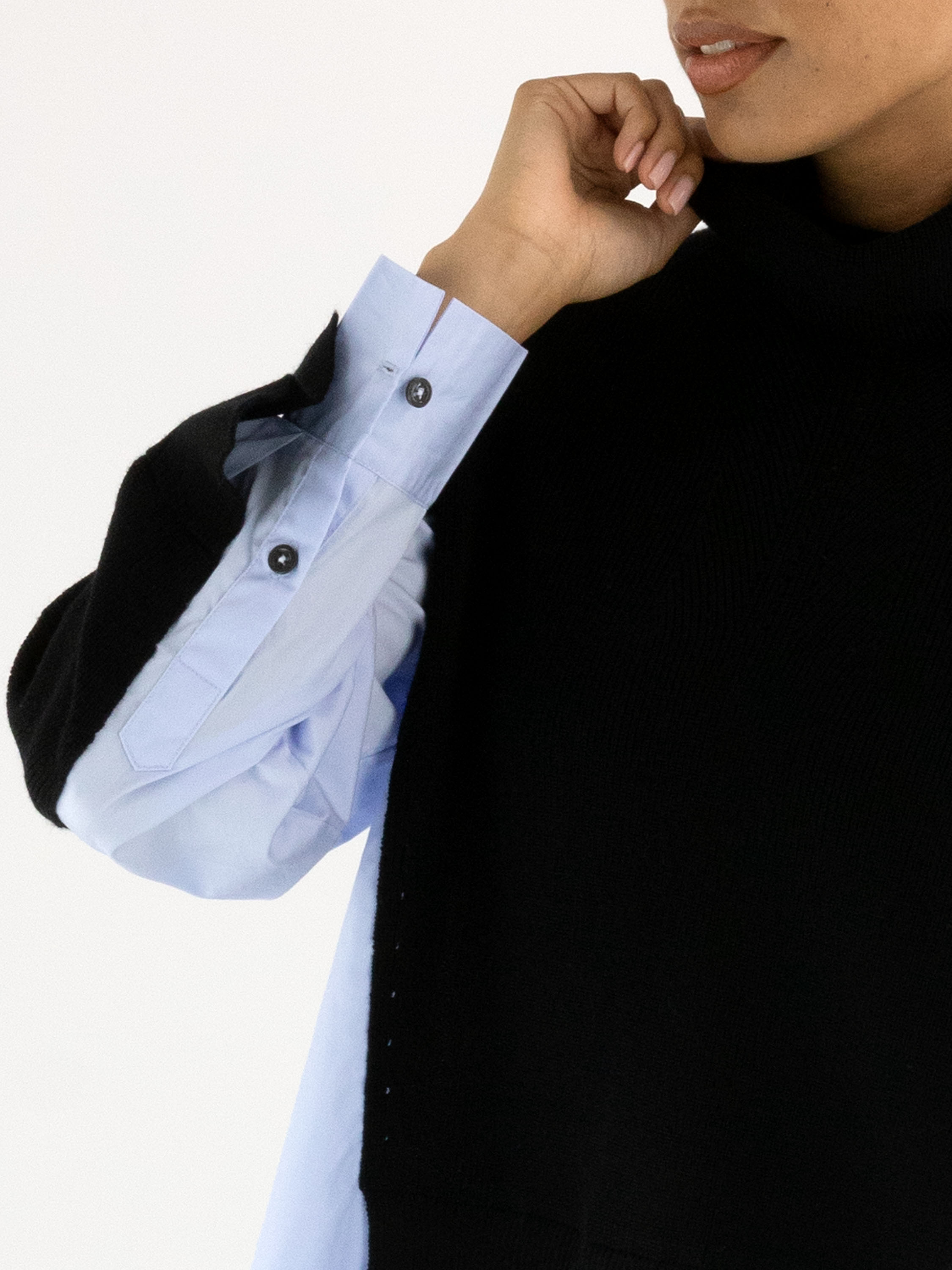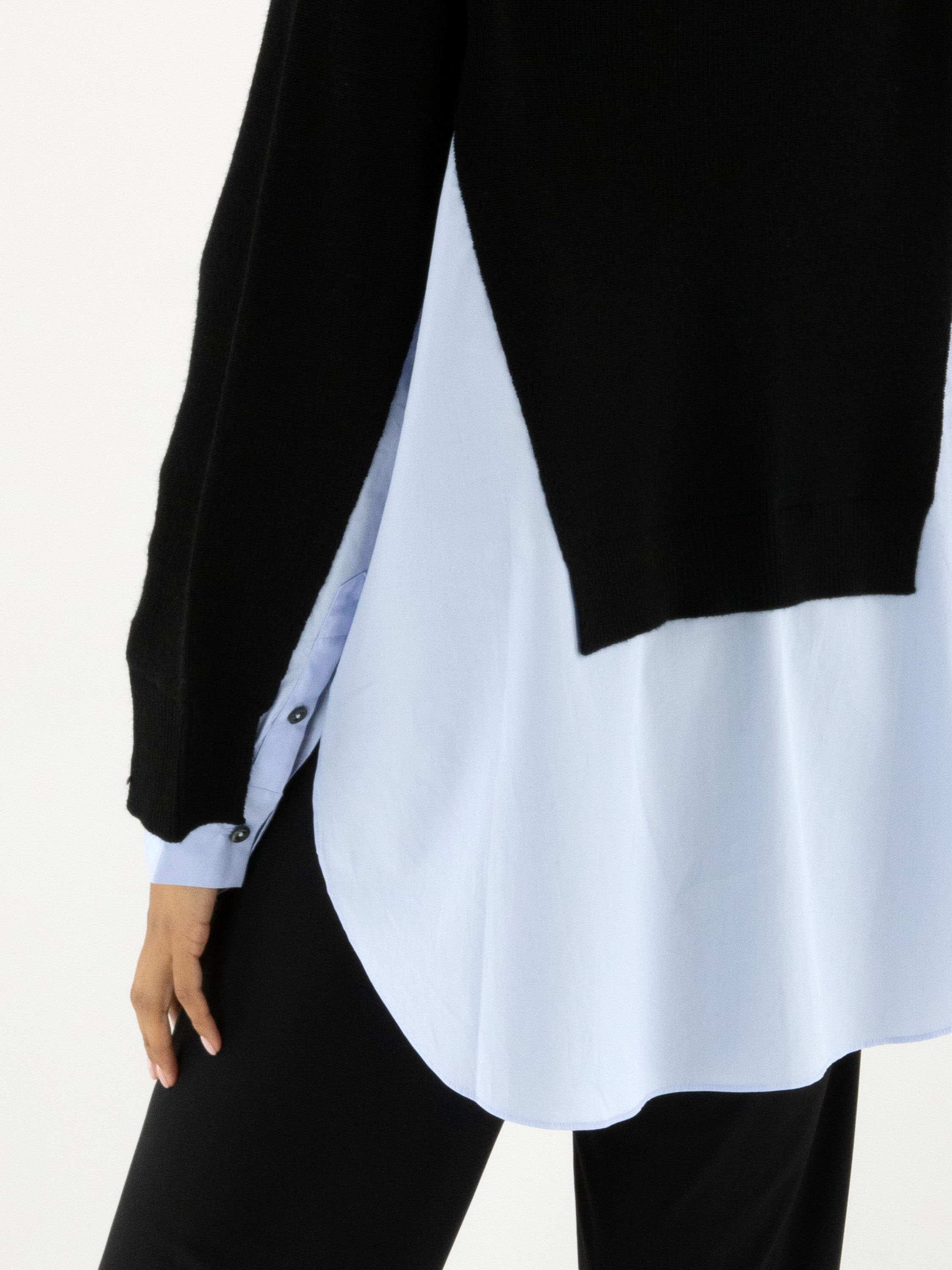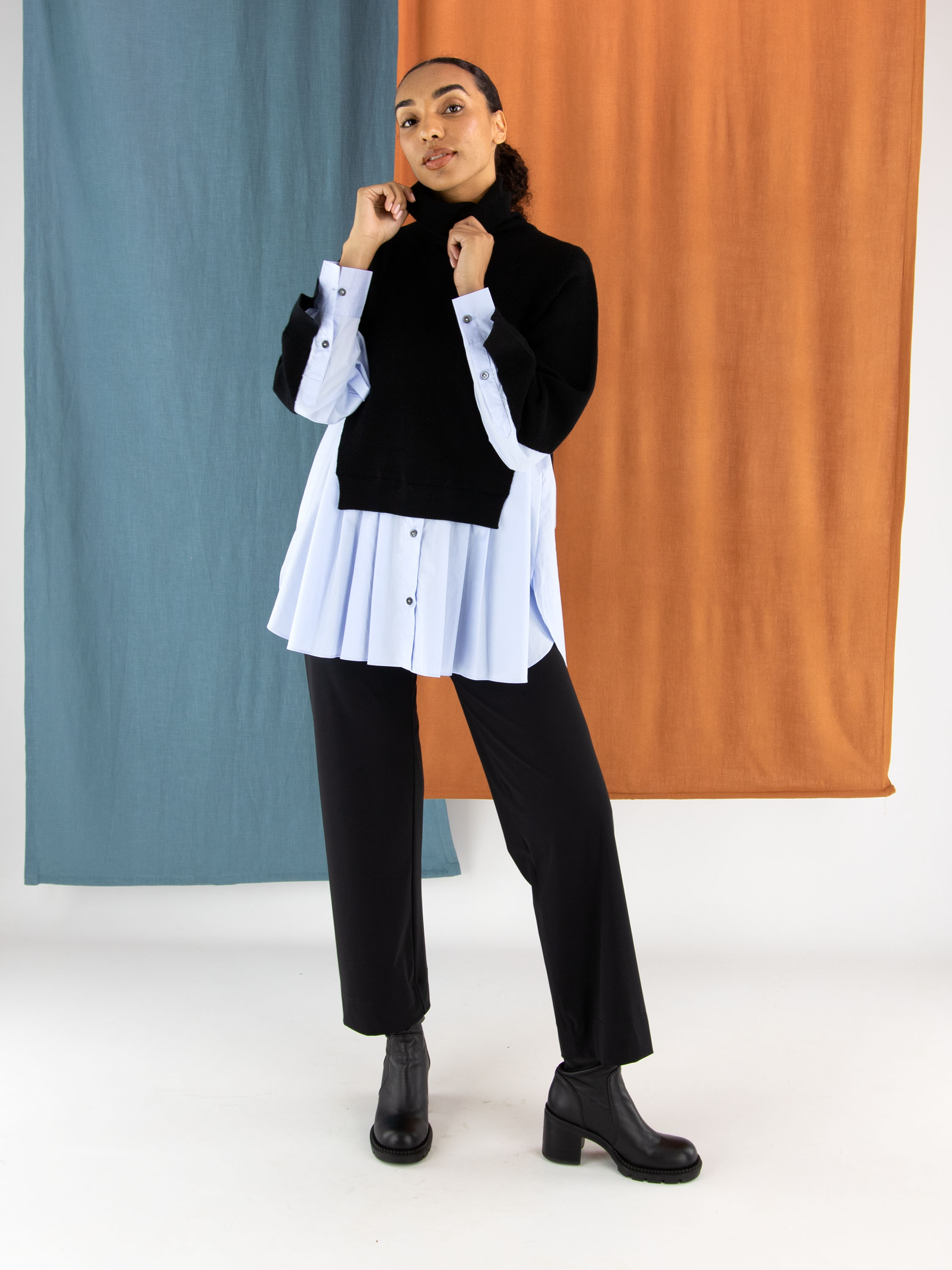 Pullover von High in Marineblau mit Blusen-Optik ab der Taille bis zu den Seiten und am unteren Teil der Ärmel. Der Bluseneinsatz ist aus einem hellblauen Stoff aus 100 % Baumwolle gefertigt. Der Pullover hat einen Rollkragen und sollte von Hand gewaschen werden.