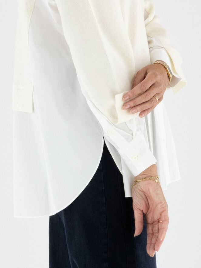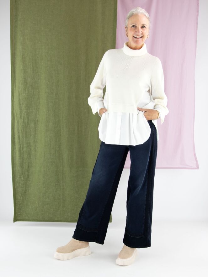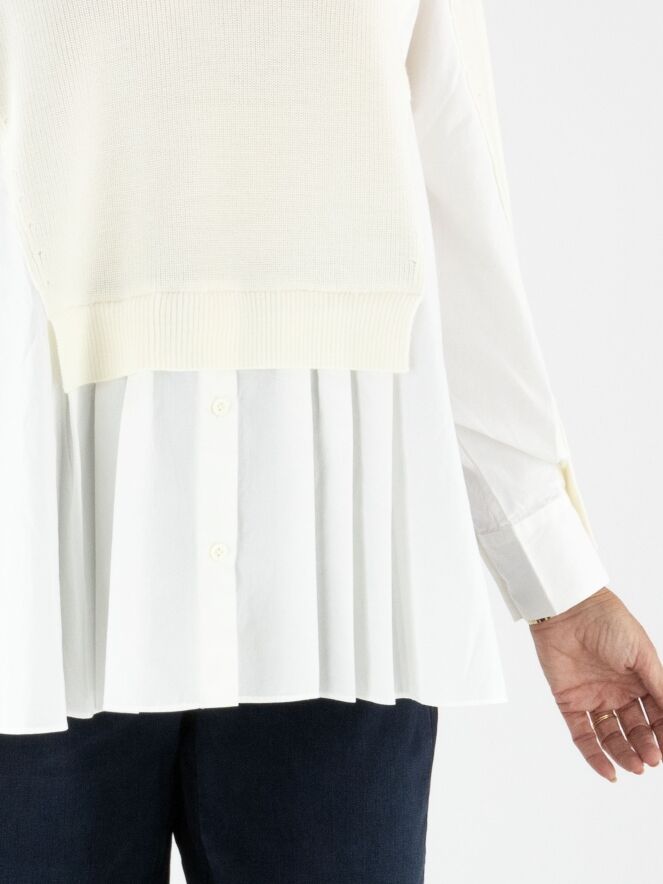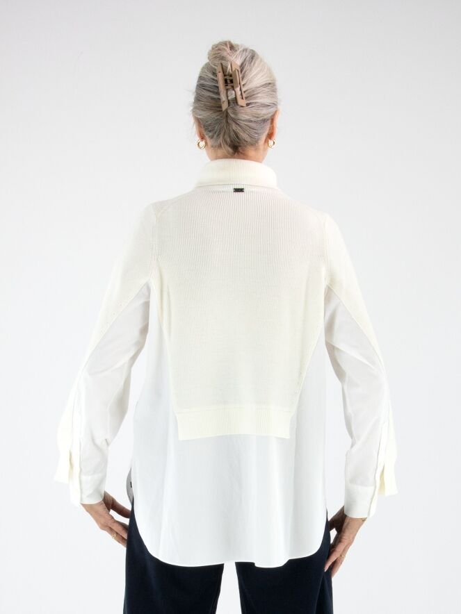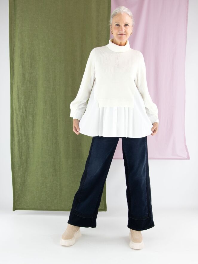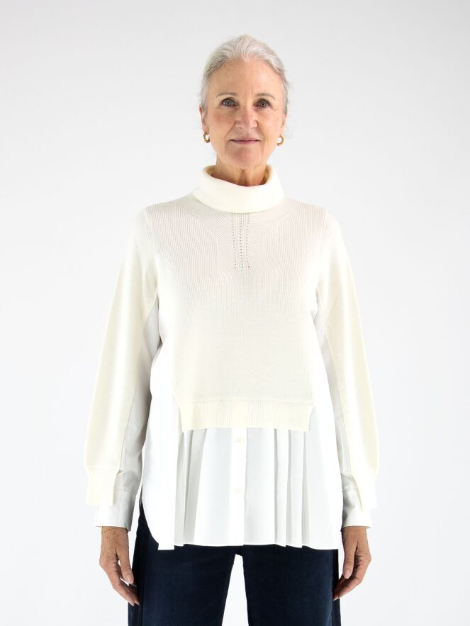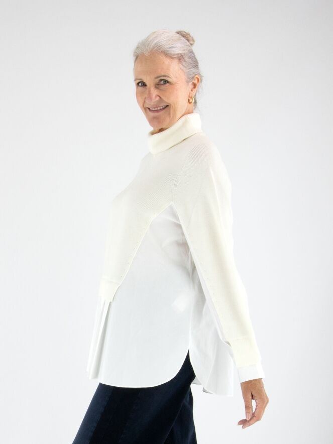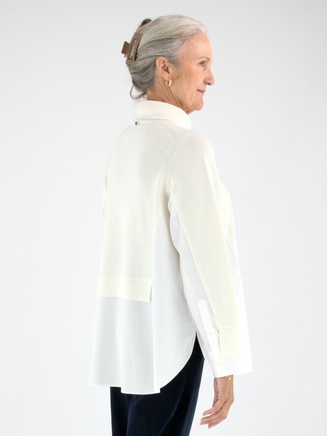 Ein Pullover von High in Cremeweiß mit Blusen-Optik ab der Taille zu den Seiten und an den Ärmelabschlüssen. Der Blusenteil ist aus 100% Baumwolle in gebrochenem Weiß gearbeitet. Der Pullover hat einen Kragen und kann von Hand gewaschen werden.
