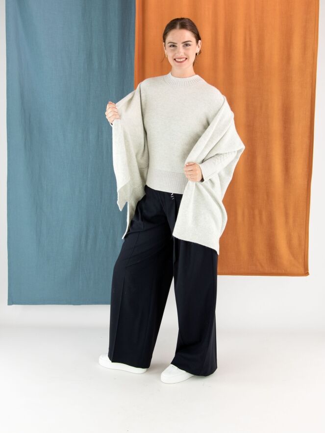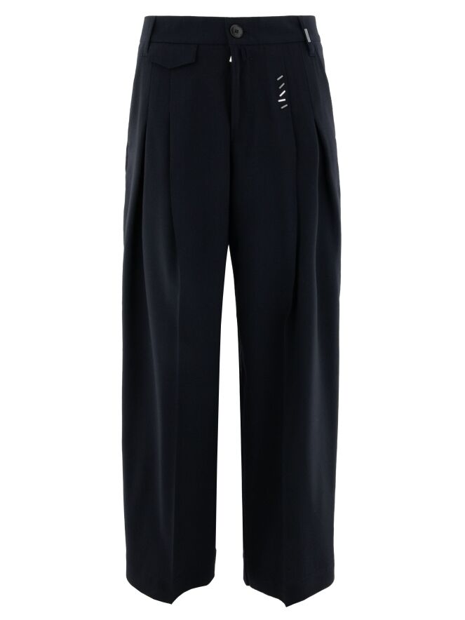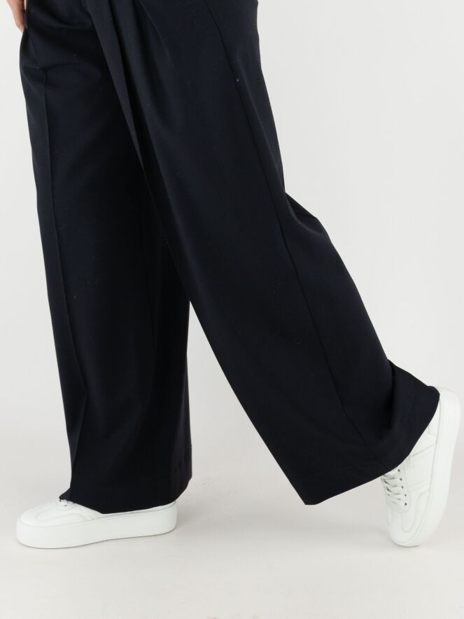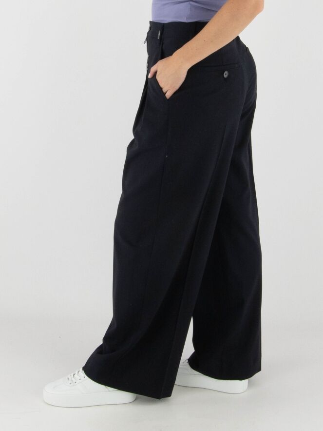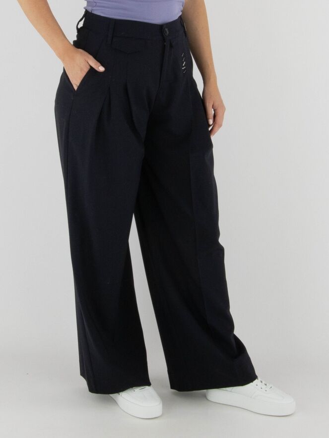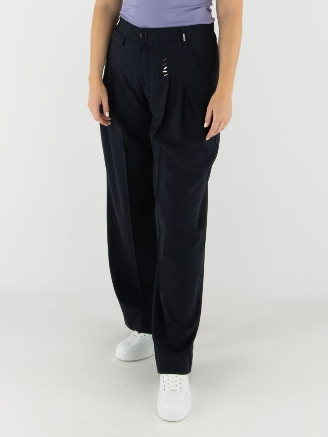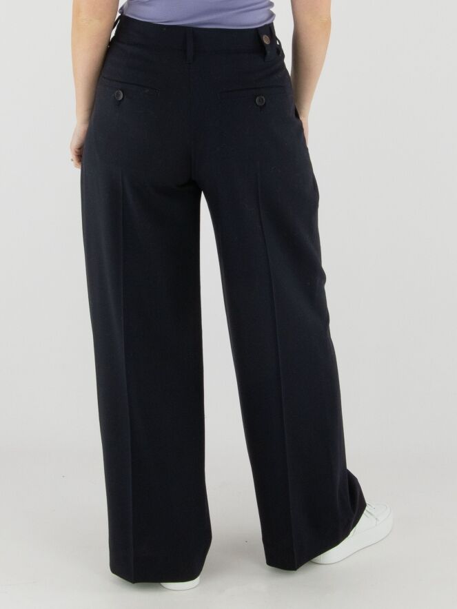 Hose von High in Marineblau. Einige Falten verlaufen von der Taille, wobei eine in eine gebügelte Bügelfalte übergeht. Die Hose hat Eingrifftaschen und darf nicht gewaschen werden.
