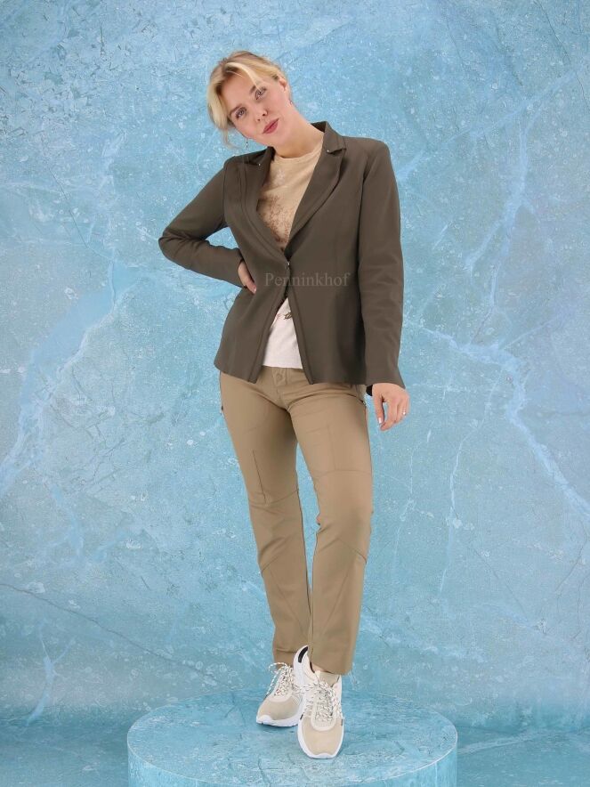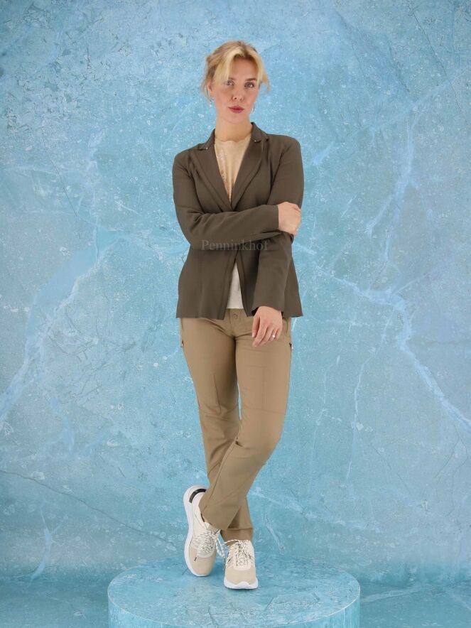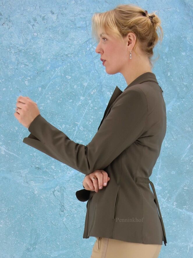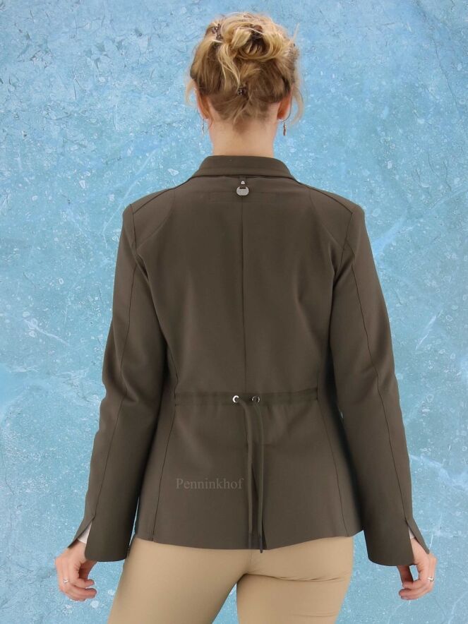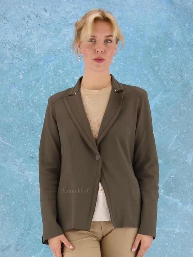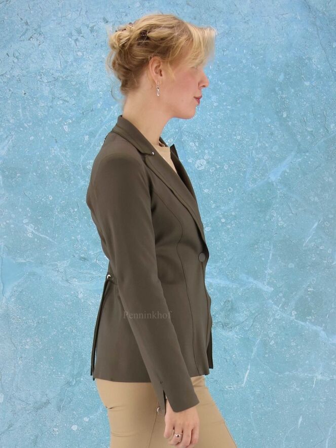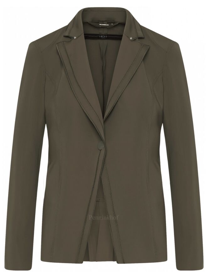 Ein olivgrüner Blazer der Designermarke High. Im Revers befinden sich zwei dekorative silberfarbene Nieten auf Halshöhe. Hinten auf Taillenhöhe befindet sich in der Mitte ein mattes Satinband mit einer Kordel, mit der ein taillierter Effekt erzielt werden kann. Der Blazer wird mit einem einzelnen Druckknopf geschlossen und ist nicht gefüttert. Dieser Blazer kann von Hand gewaschen werden.