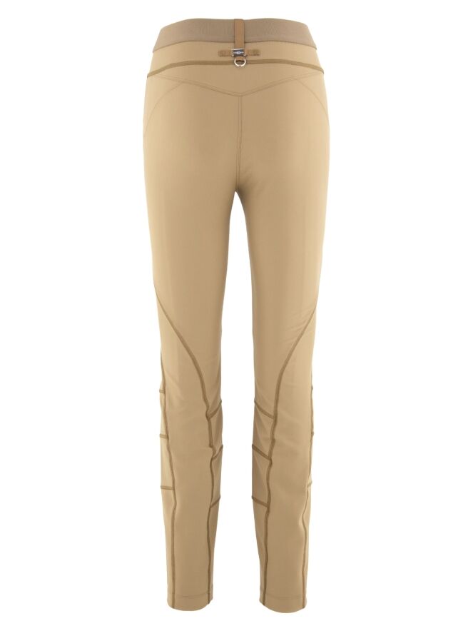 Eine Hose von High in Camel oder Senf. In der Taille befindet sich ein elastischer Bund. Die Hose hat mehrere dekorative diagonale und horizontale Nähte. Diese Hose kann per Hand gewaschen werden.