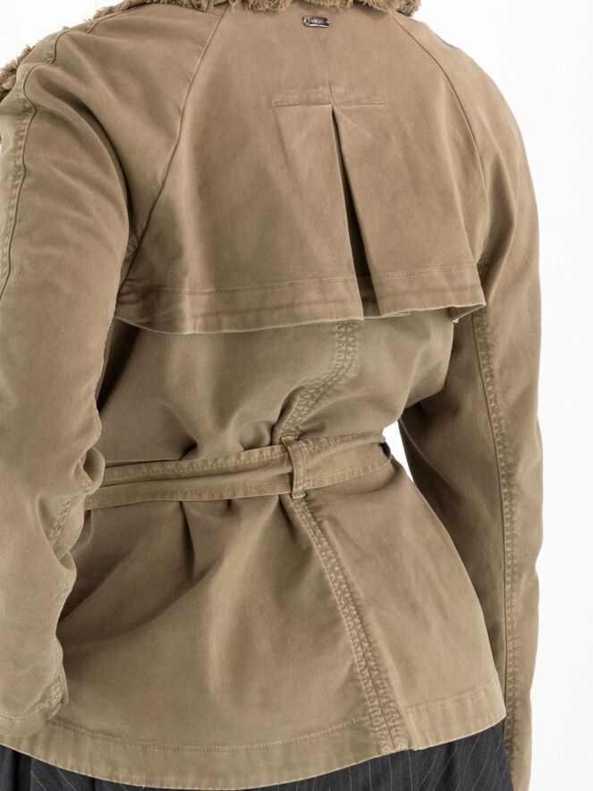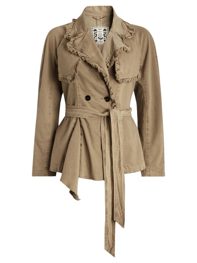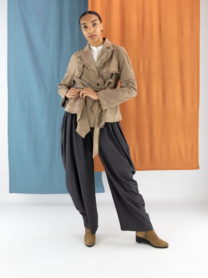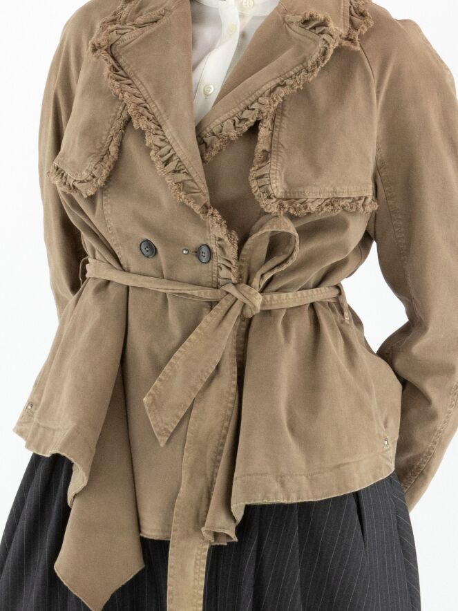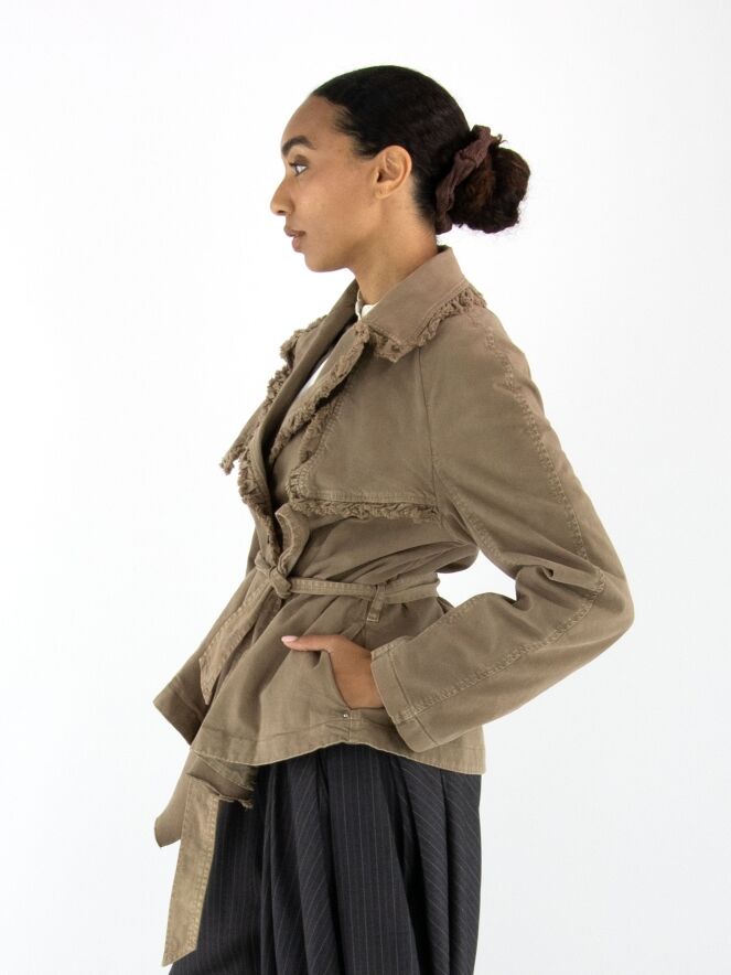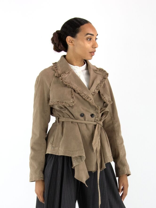 Ein doppelt geknöpfter Blazer von High in Olivgrün. Die Kanten von Kragen und Ausschnitt sind entlang der Nähte fein gefaltet und außen dezent ausgefranst. In der Taille befindet sich ein Gürtel aus dem gleichen Stoff wie der Blazer. Der Blazer hat Eingrifftaschen und darf nicht gewaschen werden.