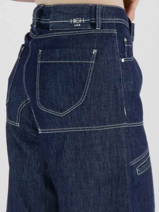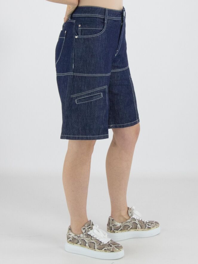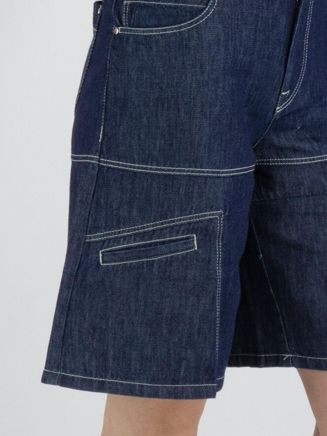 Eine Bermuda von High Lab in dunkler Denimfarbe. Die Bermuda ist im 5-Pocket-Stil gearbeitet und hat an den Hosenbeinen auf Oberschenkelhöhe kleine Eingrifftaschen. Diese Jeans-Bermuda kann bei 30 Grad gewaschen werden.