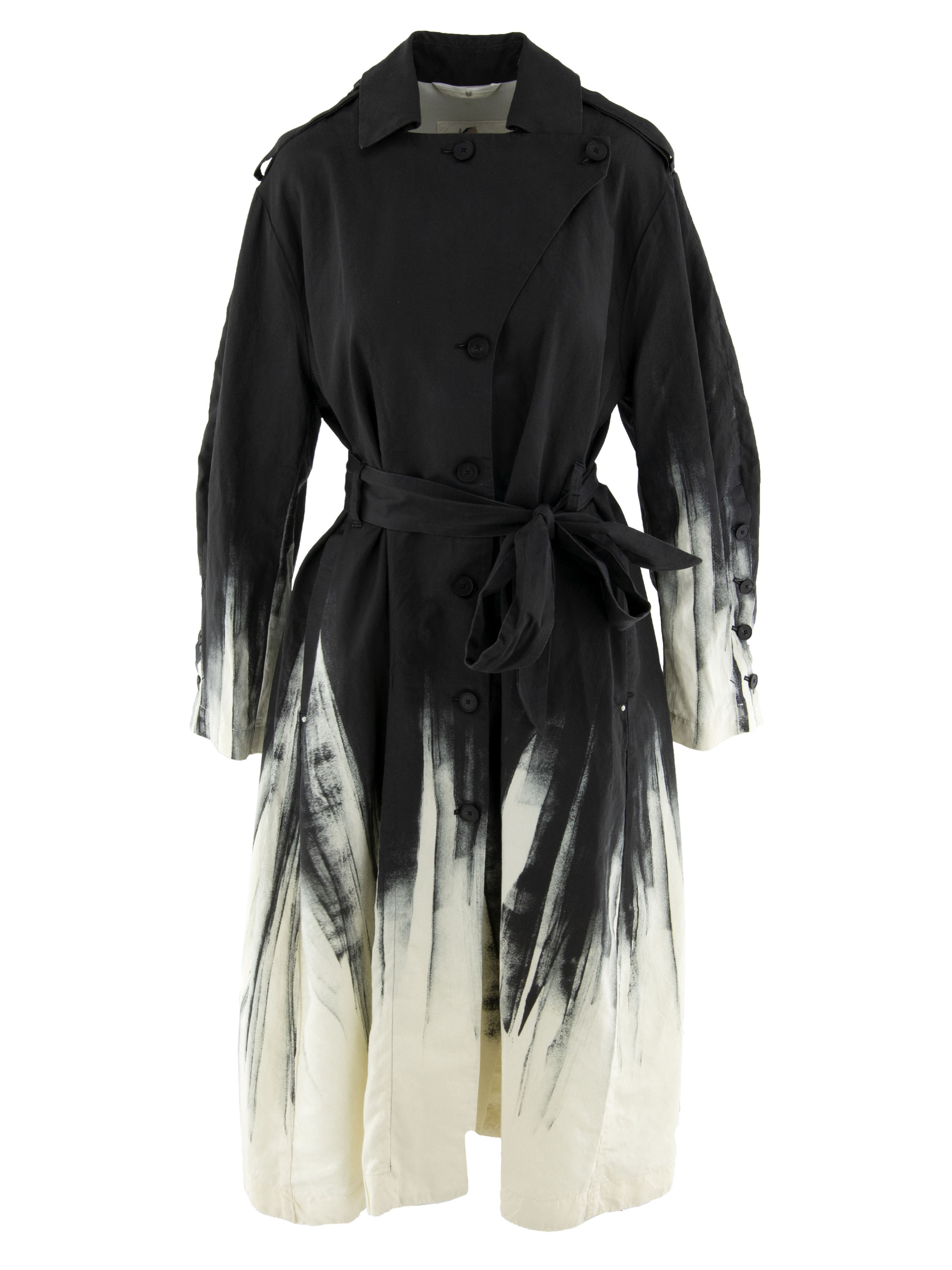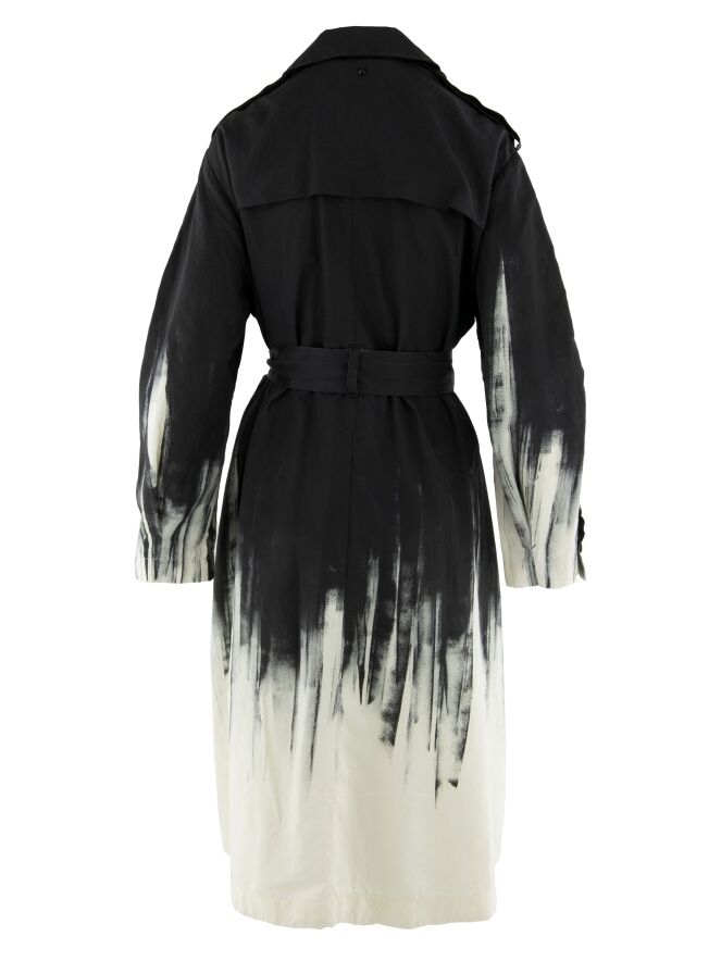 Eine Gabardine von High im Paint-Look mit einem Farbverlauf von italienischem Schwarz oben zu Cremeweiß unten. Der Mantel ist leicht tailliert und hat in der Taille einen Gürtel aus demselben Stoff wie die Gabardine. Am Ende der langen Ärmel befindet sich eine eingenähte Falte mit tiefem Schlitz, der mit vier Knöpfen geschlossen ist. Auf den Schultern sind Epauletten mit Knopfverschluss angebracht. Die Gabardine ist ungefüttert und darf nicht gewaschen werden.