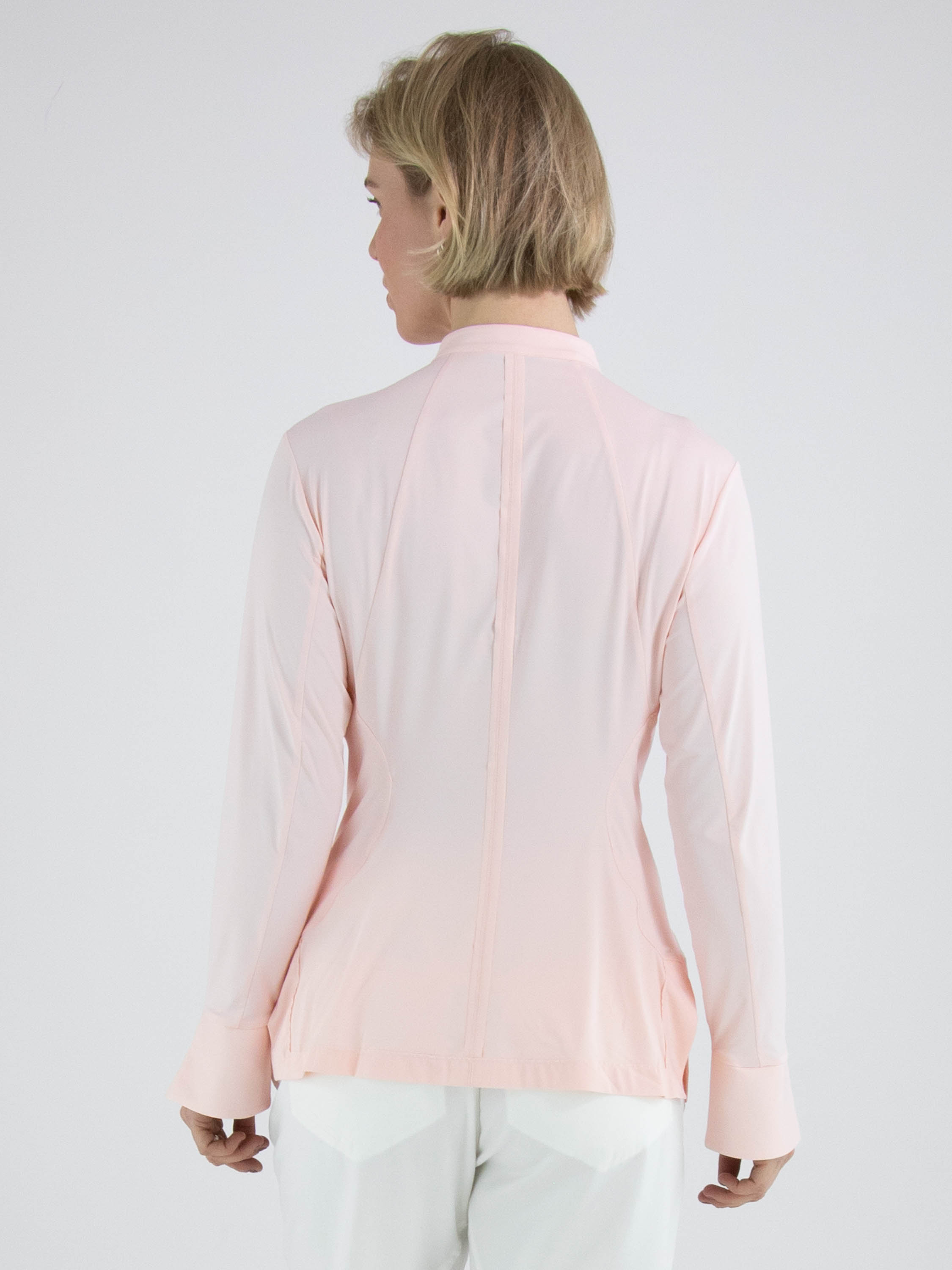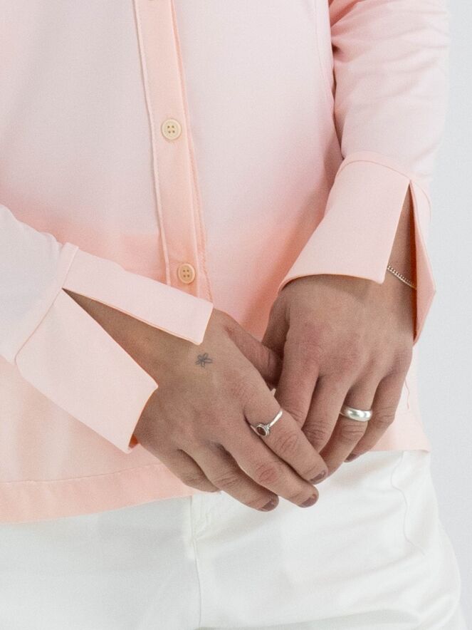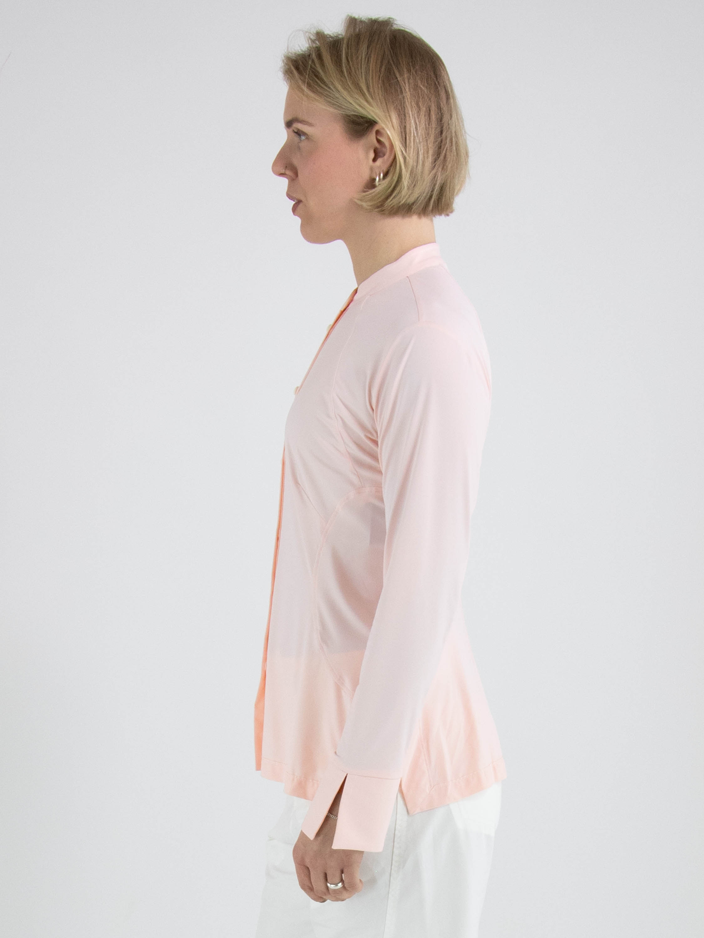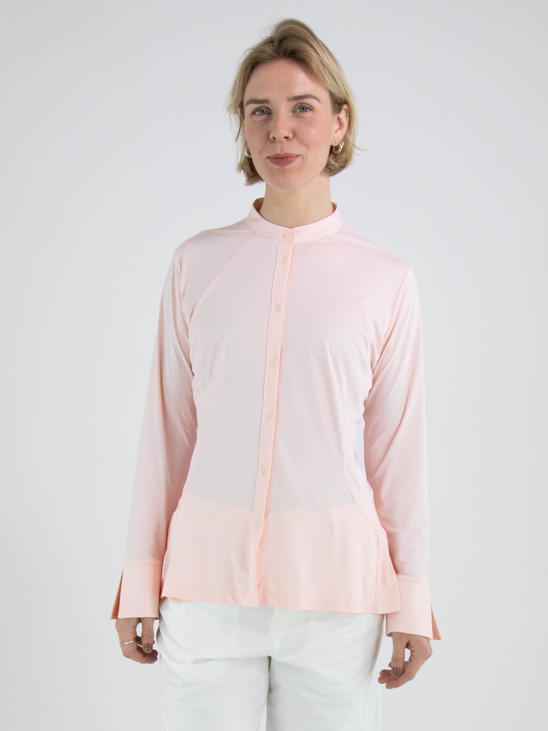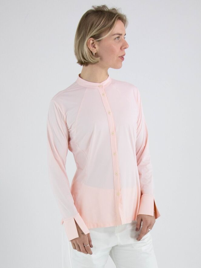 Eine Bluse von High Lab in Pastellrosa. Die Bluse ist leicht tailliert und hat keinen Kragen. Am unteren Saum befindet sich an beiden Seiten ein kurzer Schlitz. Diese Bluse kann per Hand gewaschen werden.