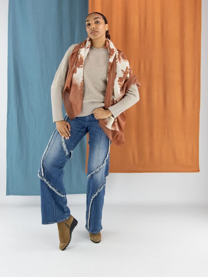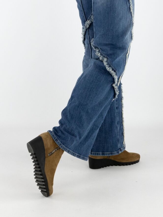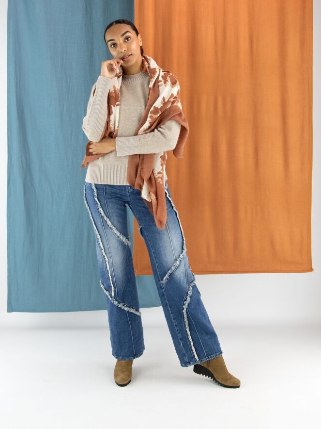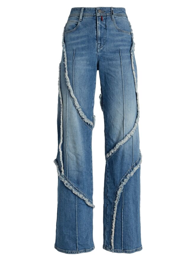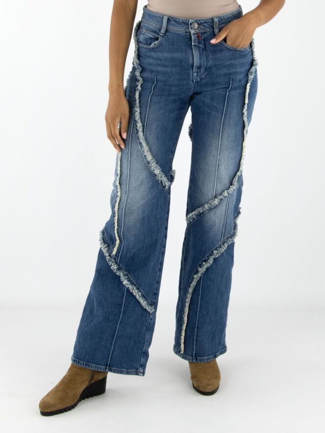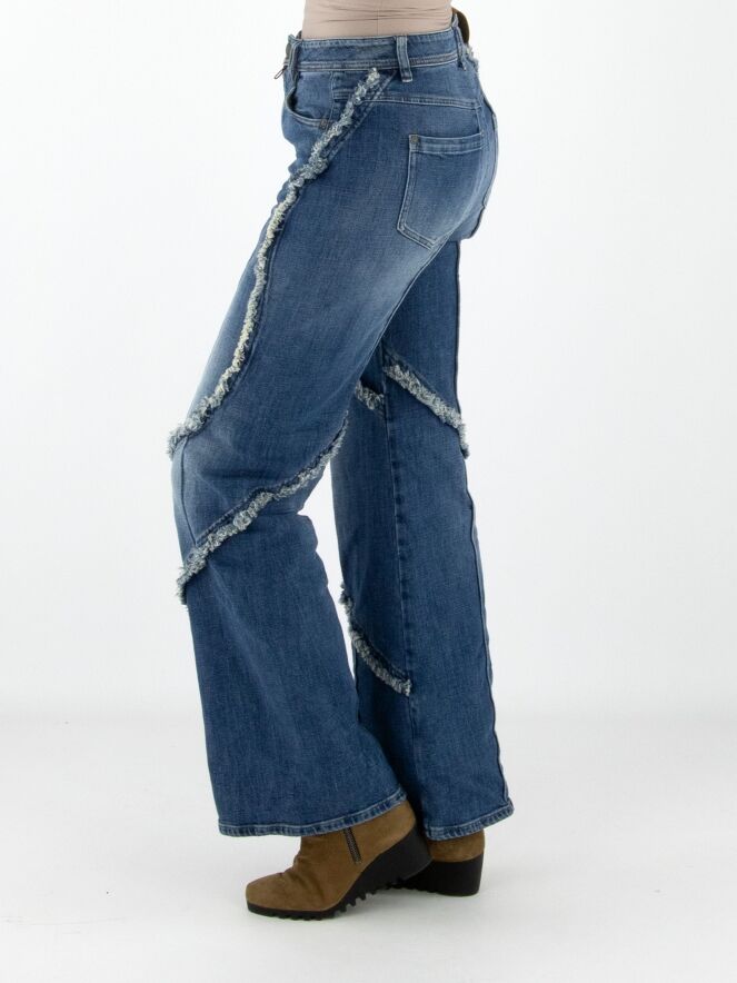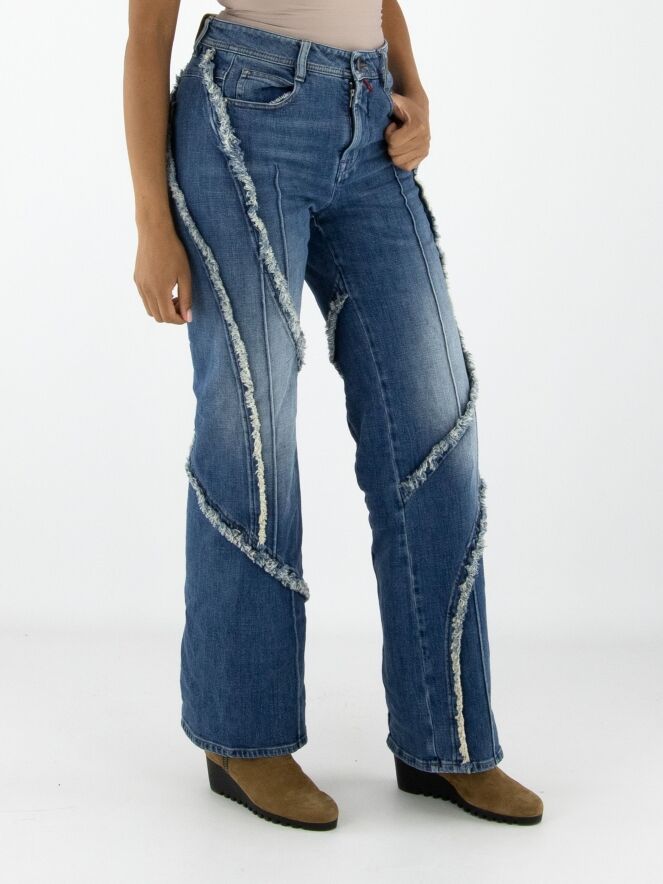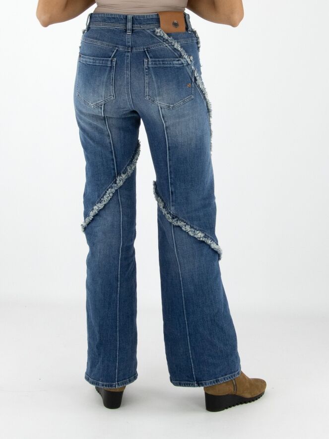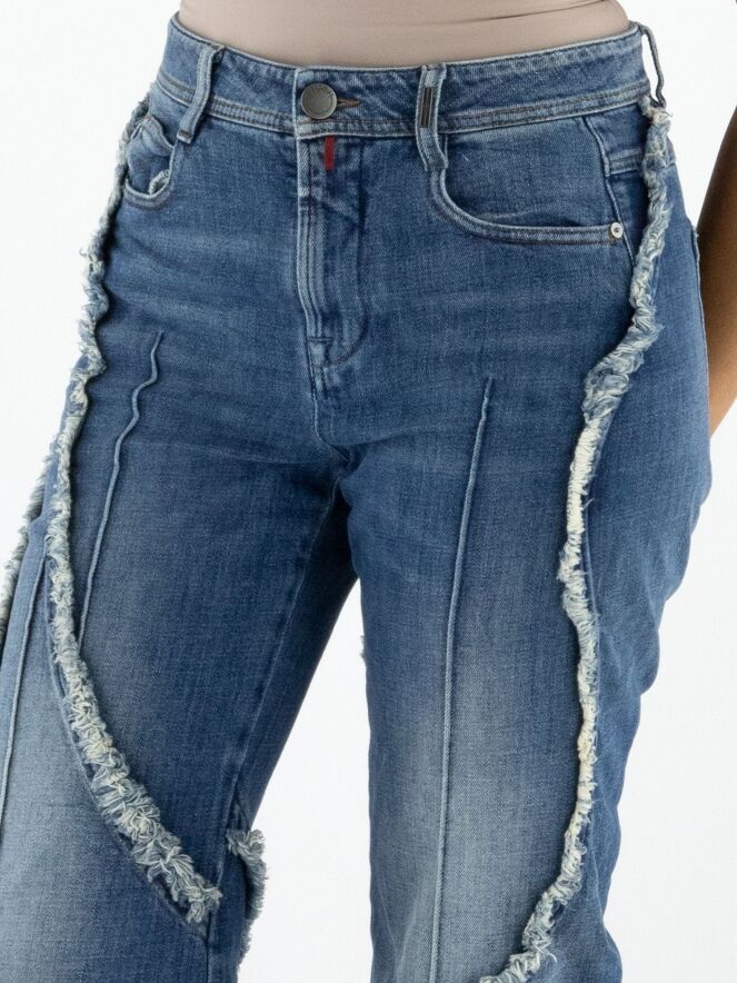 Used Jeans von High in einer klassischen Denimfarbe. Die Hose ist im traditionellen 5-Pocket-Stil gefertigt und hat gerade geschnittene Beine. Mehrere diagonale, umgekehrte Nähte mit feinen Fransen verlaufen über die Hosenbeine und verleihen der Jeans einen trendigen, charaktervollen Look. Diese Jeans kann bei 30 Grad gewaschen werden.