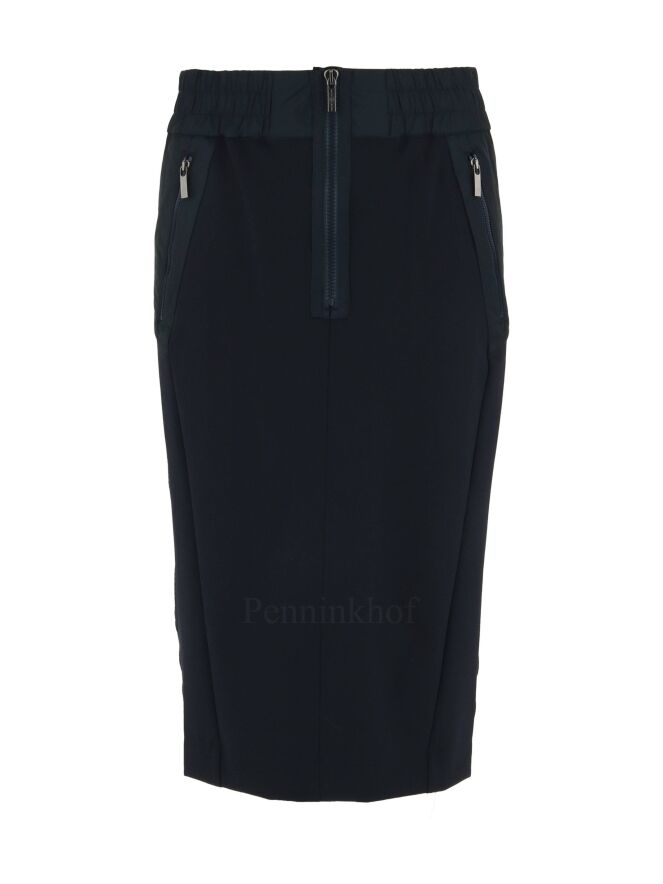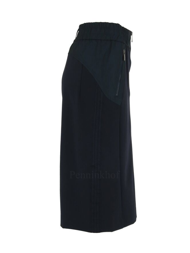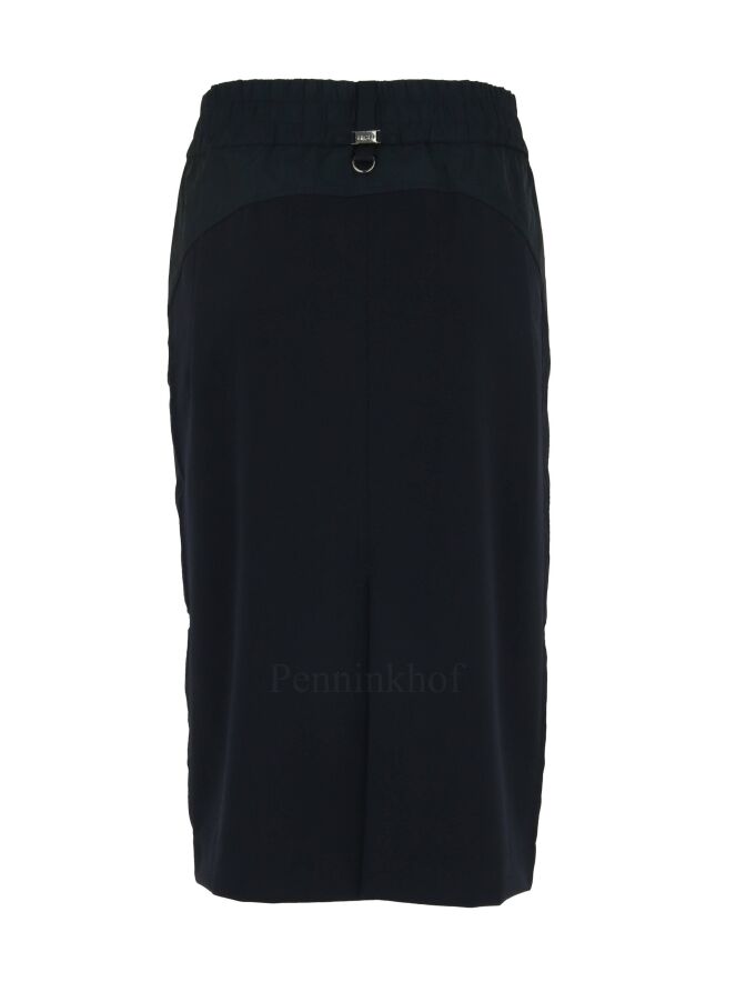 Ein marineblauer Rock der Designermarke High. Der Taillenbund ist dehnbar und aus einem matten Satingewebe. Dieses Gewebe befindet sich auch als Besatz an den Seiten und an den Reißverschlusstaschen. Dieser Rock darf nicht gewaschen werden.