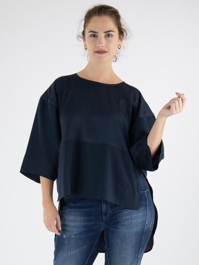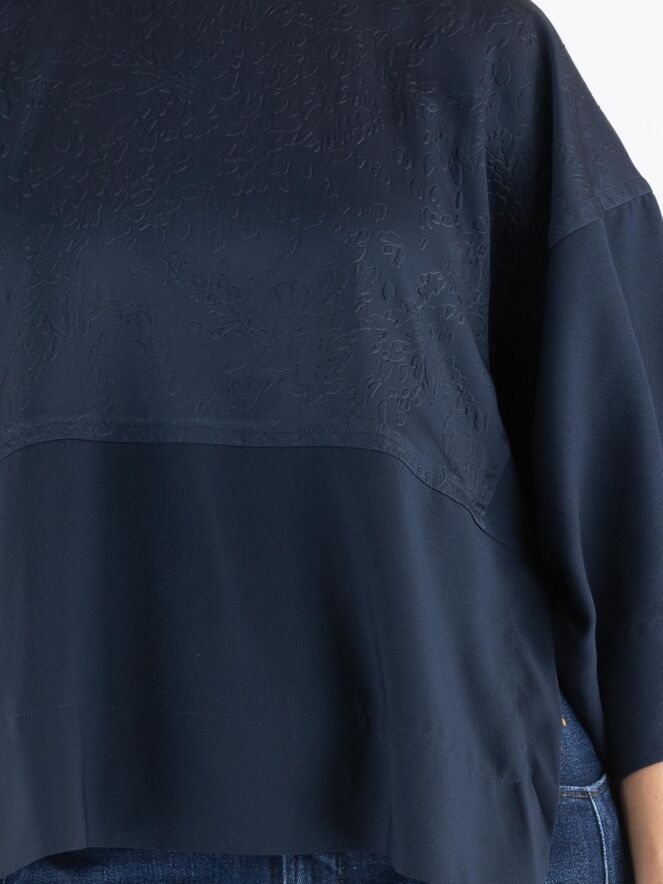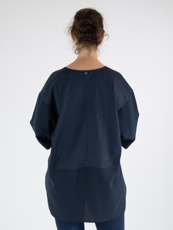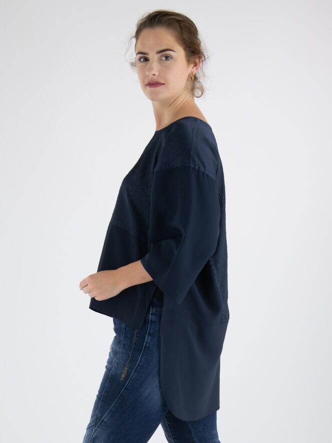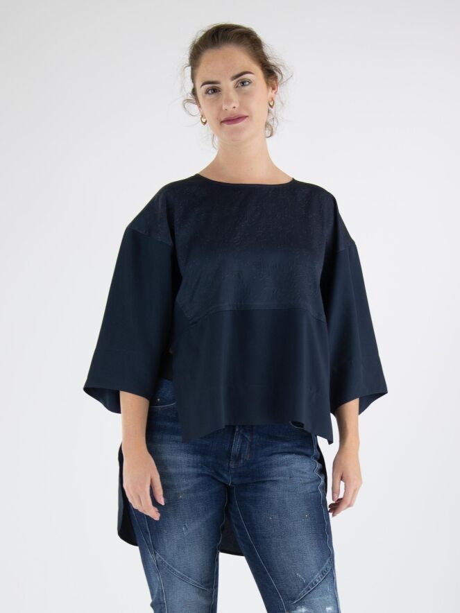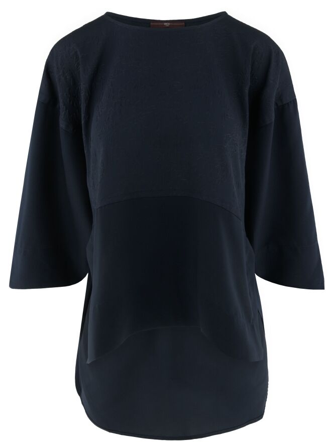 Ein weites Shirt von High in Marineblau. Bis zur Taille hat das Shirt einen Stoff mit grafischem Reliefdruck, darunter ist der Stoff einfarbig und glatt. Ab der Taille sind die Seiten offen. Dieses Shirt kann bei 30 Grad gewaschen werden.