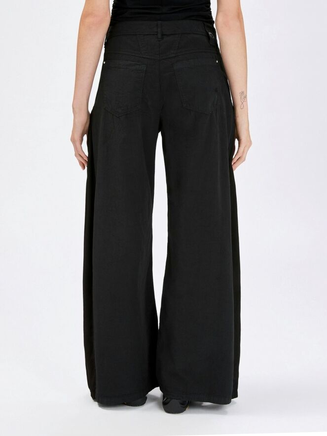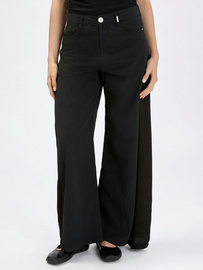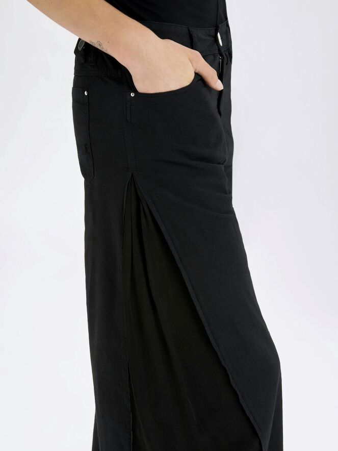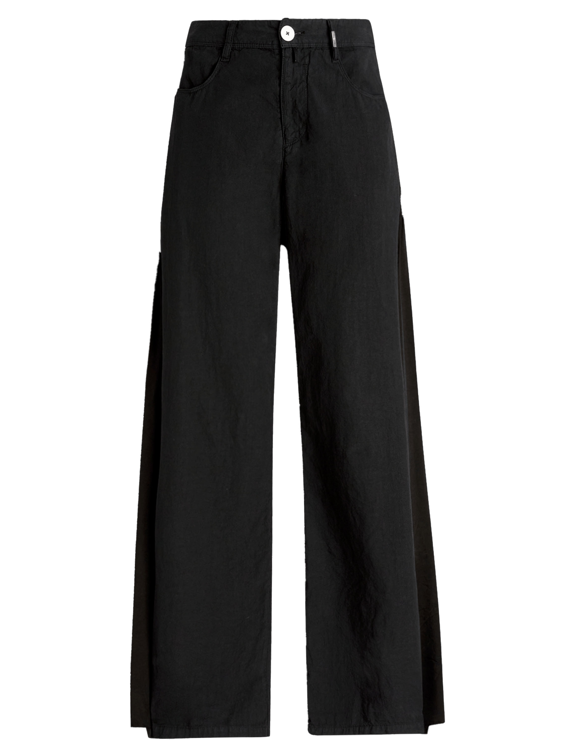 Hose von High in Schwarz. Entlang der Seiten verläuft von der Hüfte bis zum Saum ein Einsatz aus mattem Satin, der sich in der Bewegung dezent zeigt und einen raffinierten Kontrast schafft. Diese exklusive Designerhose sollte per Hand gewaschen werden.