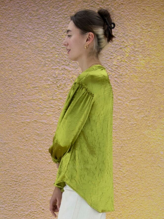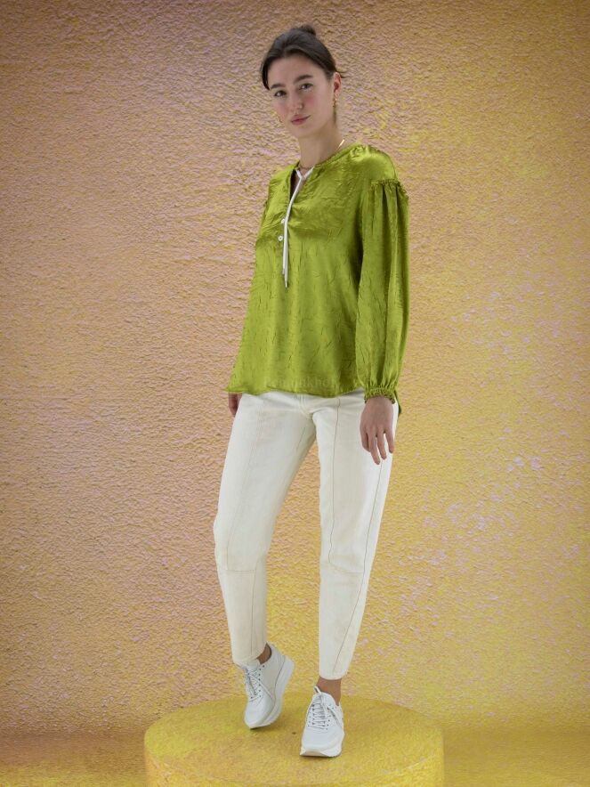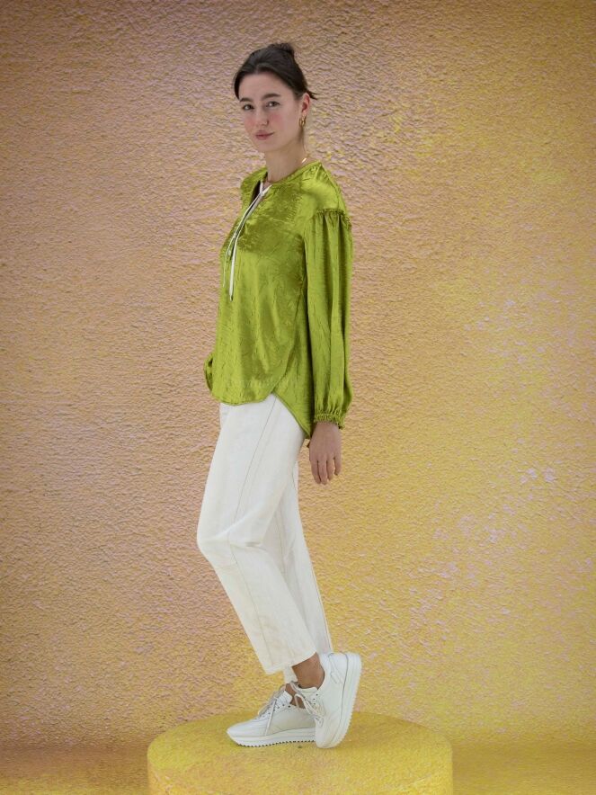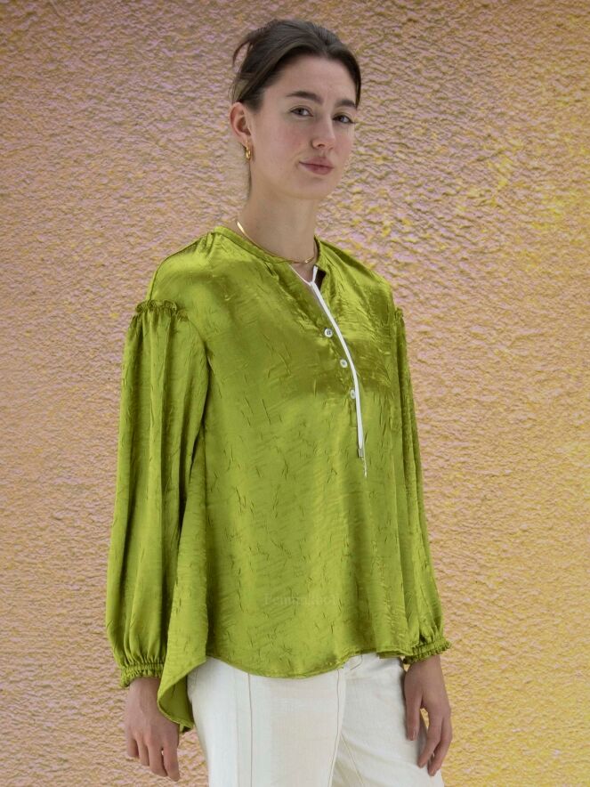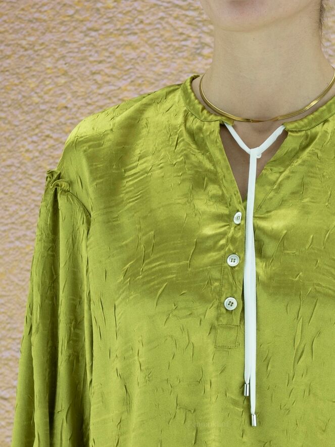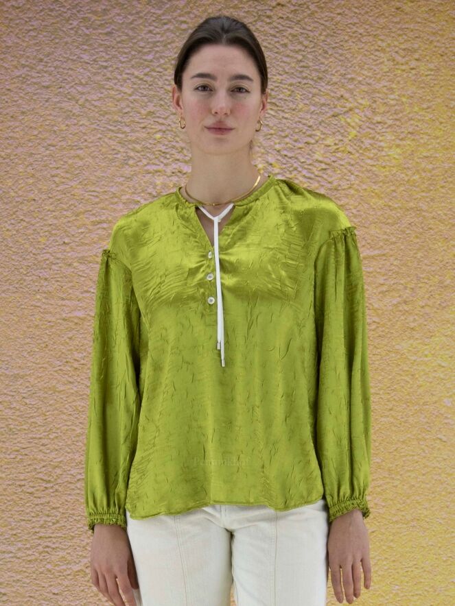 Eine matt glänzende Bluse der Designermarke High in einer Frisé-Struktur in der Farbe Grün. Die Bluse hat einen V-Ausschnitt mit einer weißen Kordel im Rand. Am Abschluss der langen Ärmel befindet sich ein geraffter elastischer Saum. Diese Bluse kann von Hand gewaschen werden.