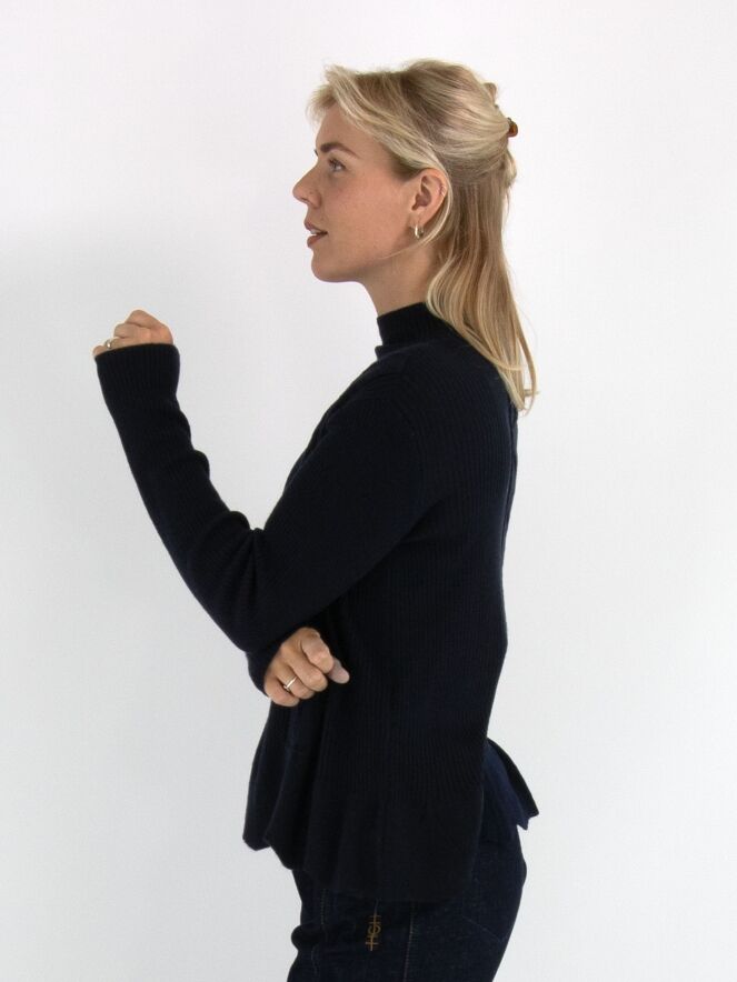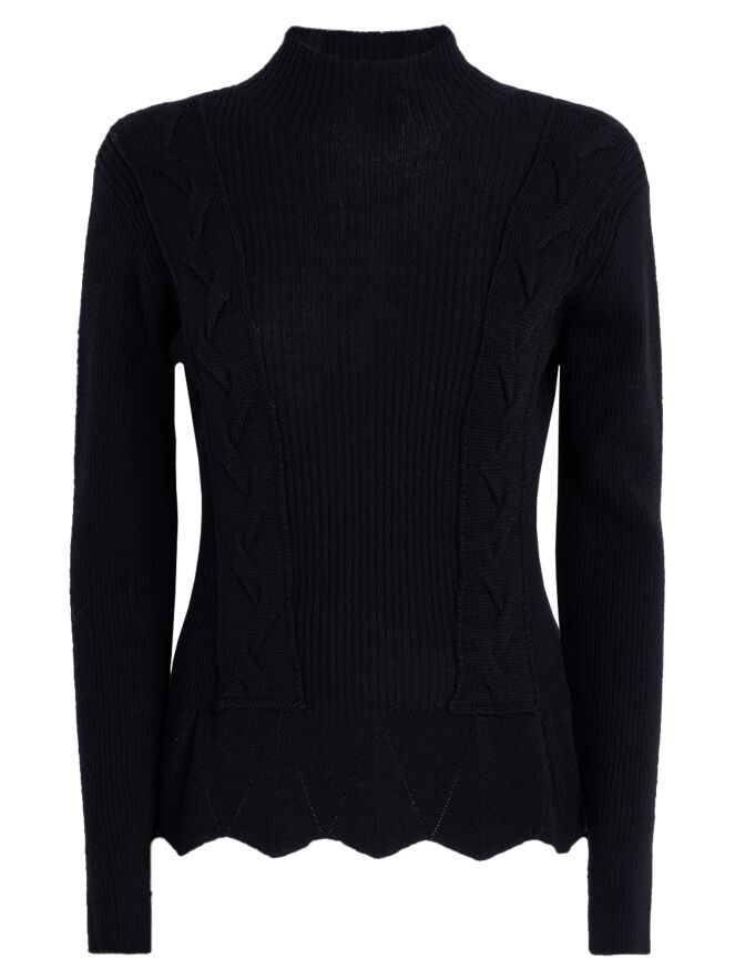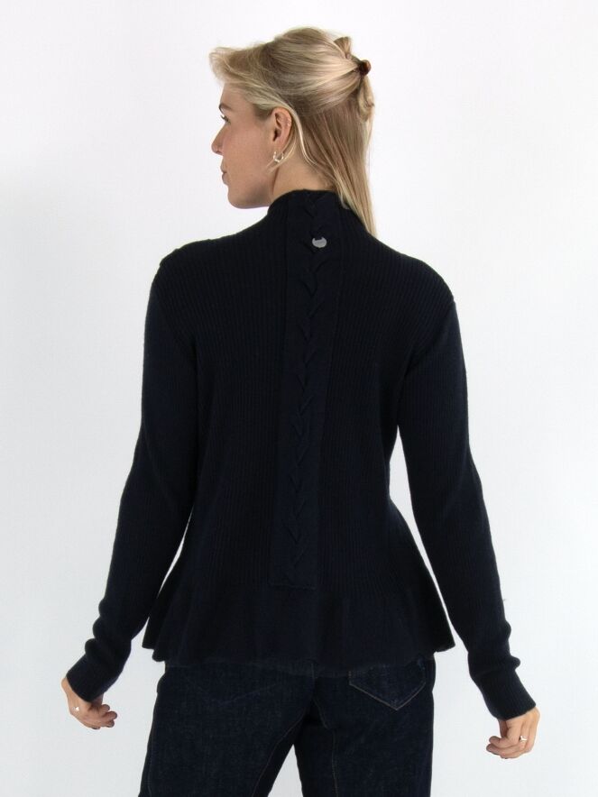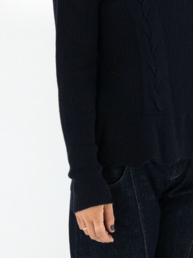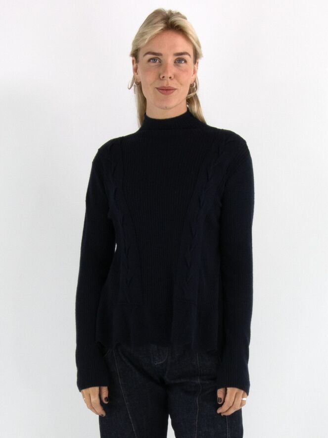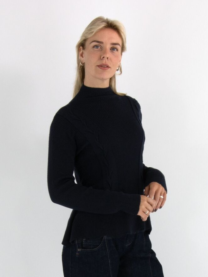 Marineblauer Pullover von High mit verschiedenen Strickmustern, darunter ein Zopfmuster an beiden Seiten. Der Pullover hat einen Rollkragen und fällt ab der Taille in eine A-Linie. Dieser Pullover sollte von Hand gewaschen werden.