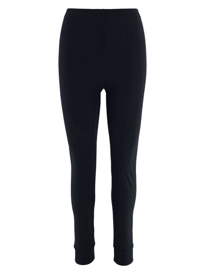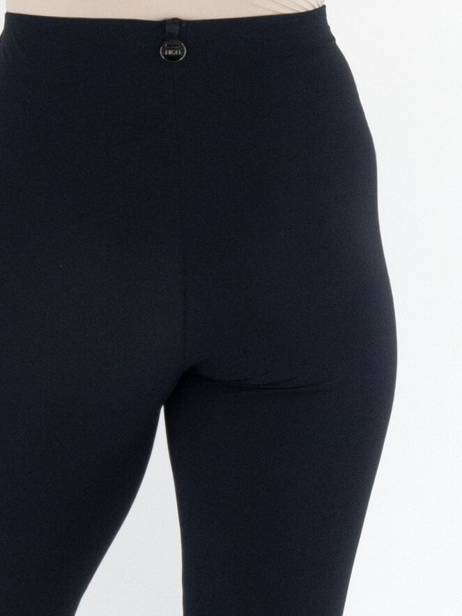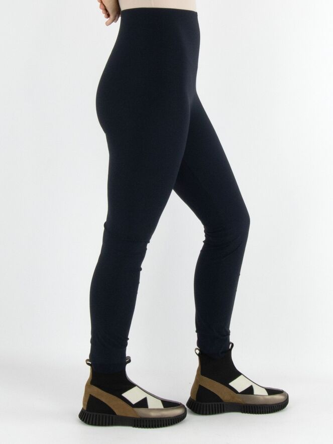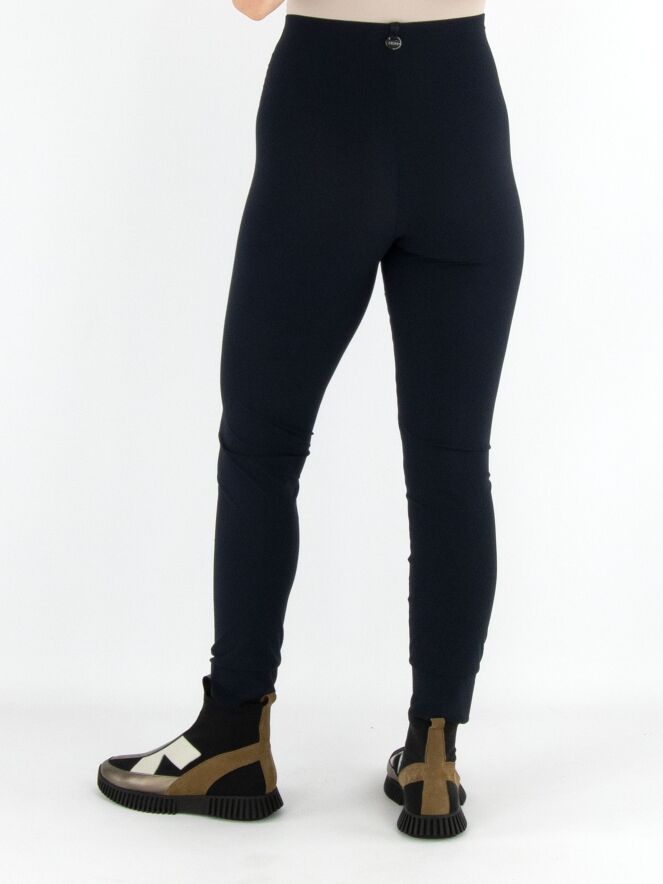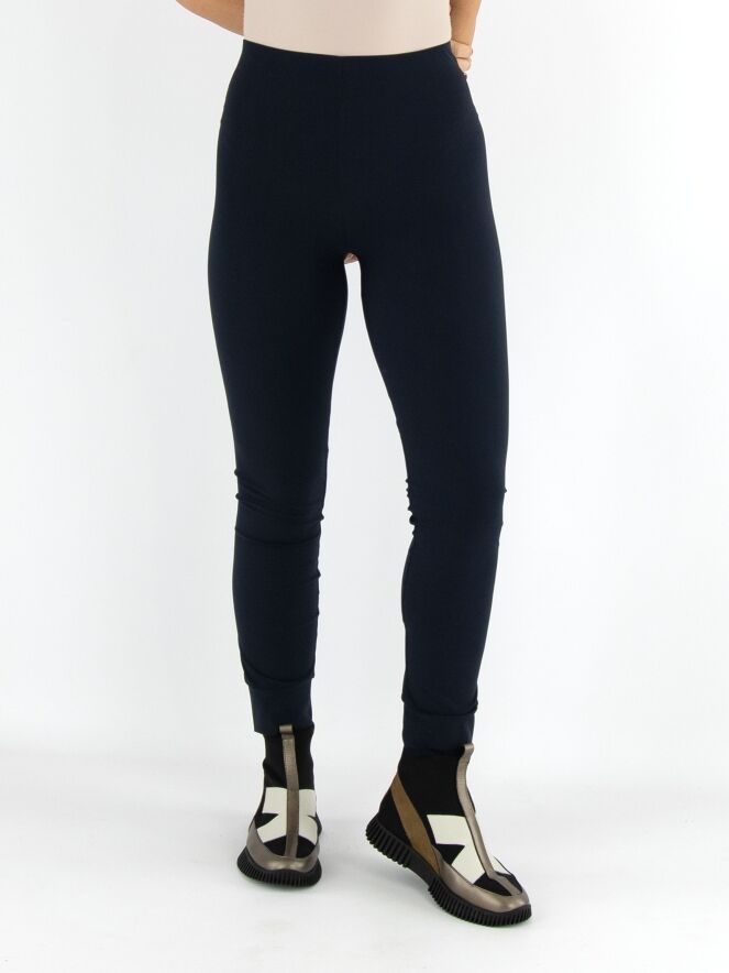Eine Leggings von High in Marineblau. Der Bund ist elastisch. Am unteren Ende befindet sich eine breite Blende mit einer Ziernaht. Diese Leggings kann bei 30 Grad gewaschen werden.