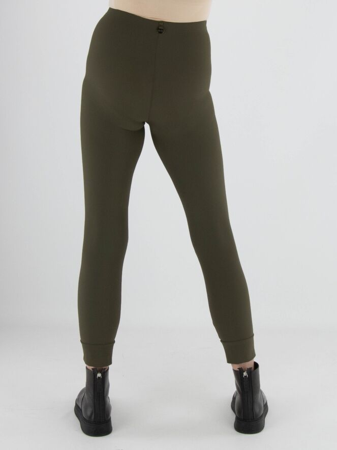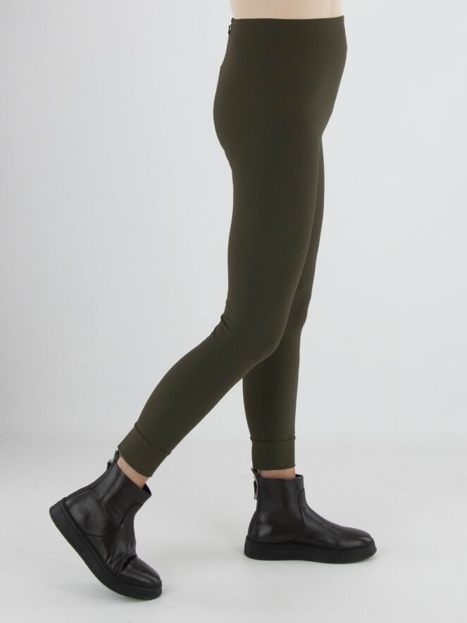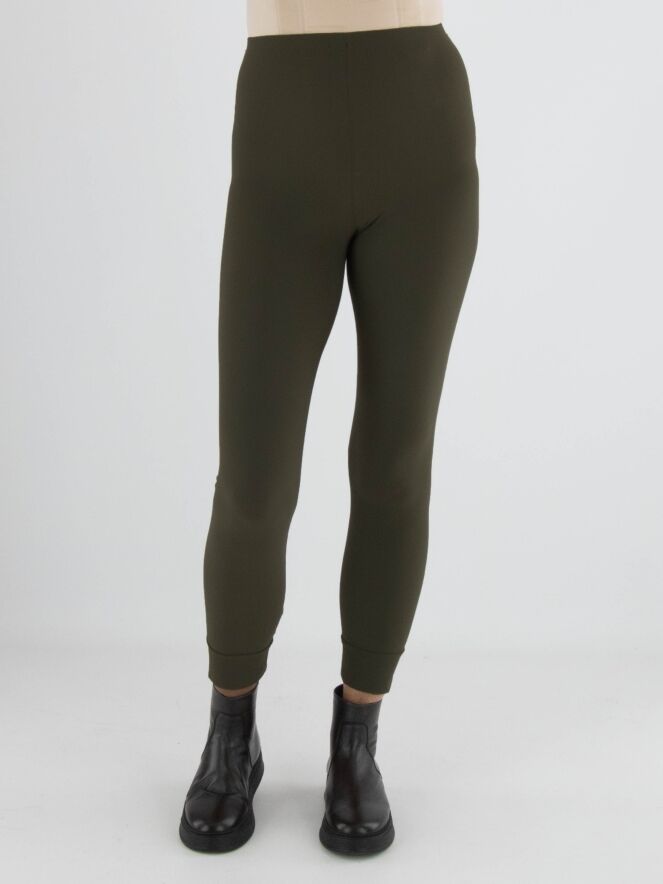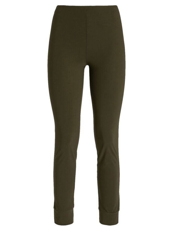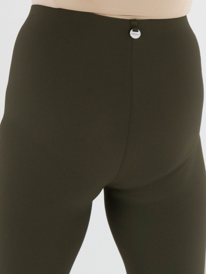 Leggings von High in Olivgrün. Der Bund ist elastisch. Am unteren Ende befindet sich eine breite Blende mit Ziernaht. Diese Leggings darf bei 30 Grad gewaschen werden.