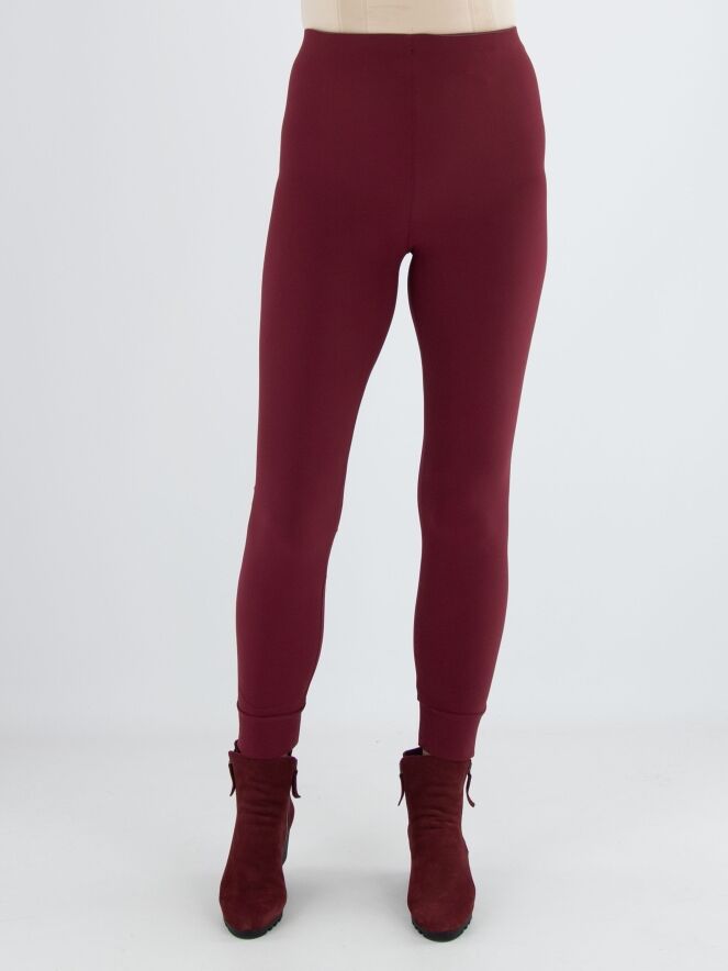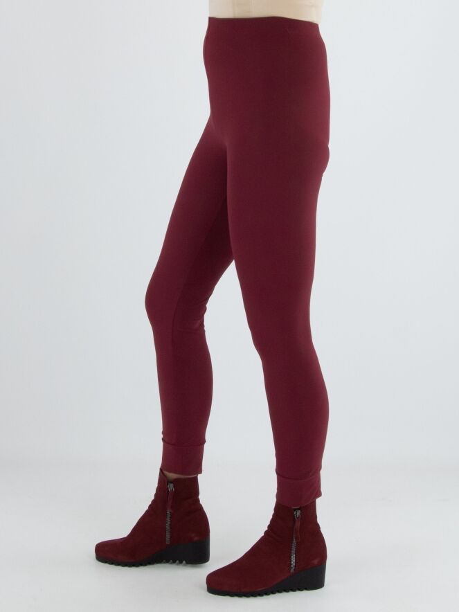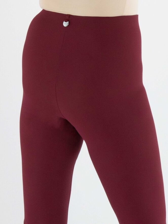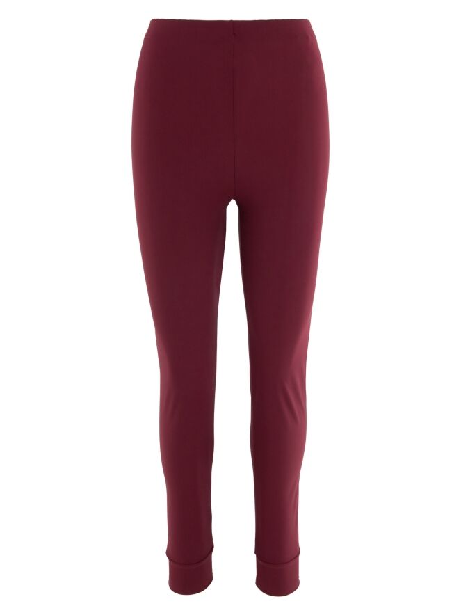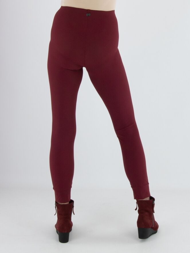 Leggings von High in der Farbe Aubergine. Der Bund ist elastisch. Am Beinabschluss befindet sich eine breite Blende mit Ziernaht. Diese Leggings kann bei 30 Grad gewaschen werden.